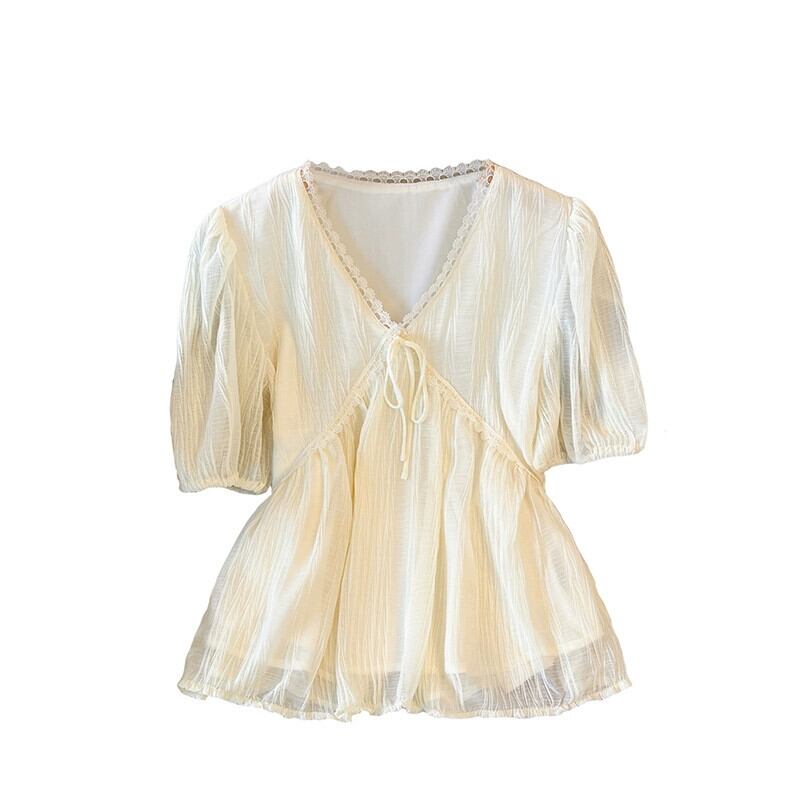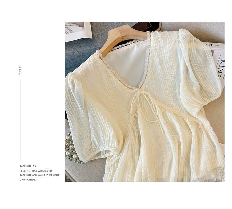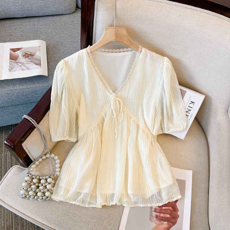 プラスサイズの女性の 2023 夏服脂肪 V ネック気質デザインシフォンシャツファッショナブルなパフスリーブカジュアルトップ 大きめサイズ サマー 夏物 Vネック 8884162954124728