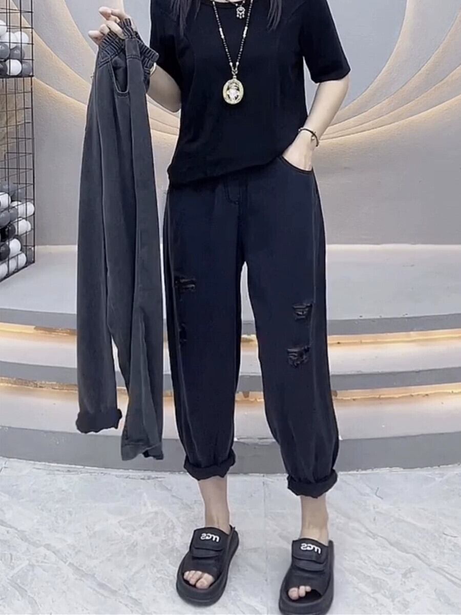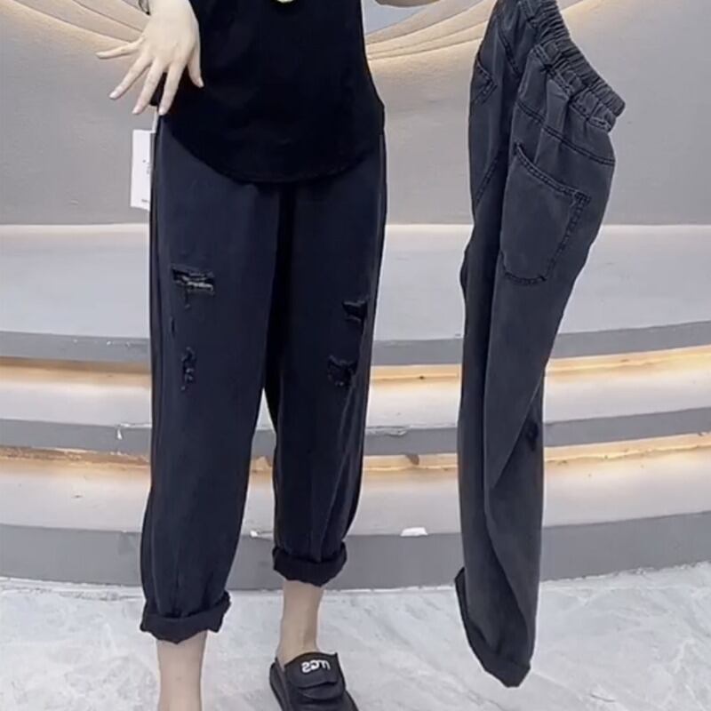 プラスサイズの婦人服 2023 流行の夏の新しいファットシスターハーレムジーンズハイウエストスリムドレープワイドレッグお父さんパンツ ハイウェスト 大きめサイズ サマー 夏物 ワイドパンツ 8884194178395140