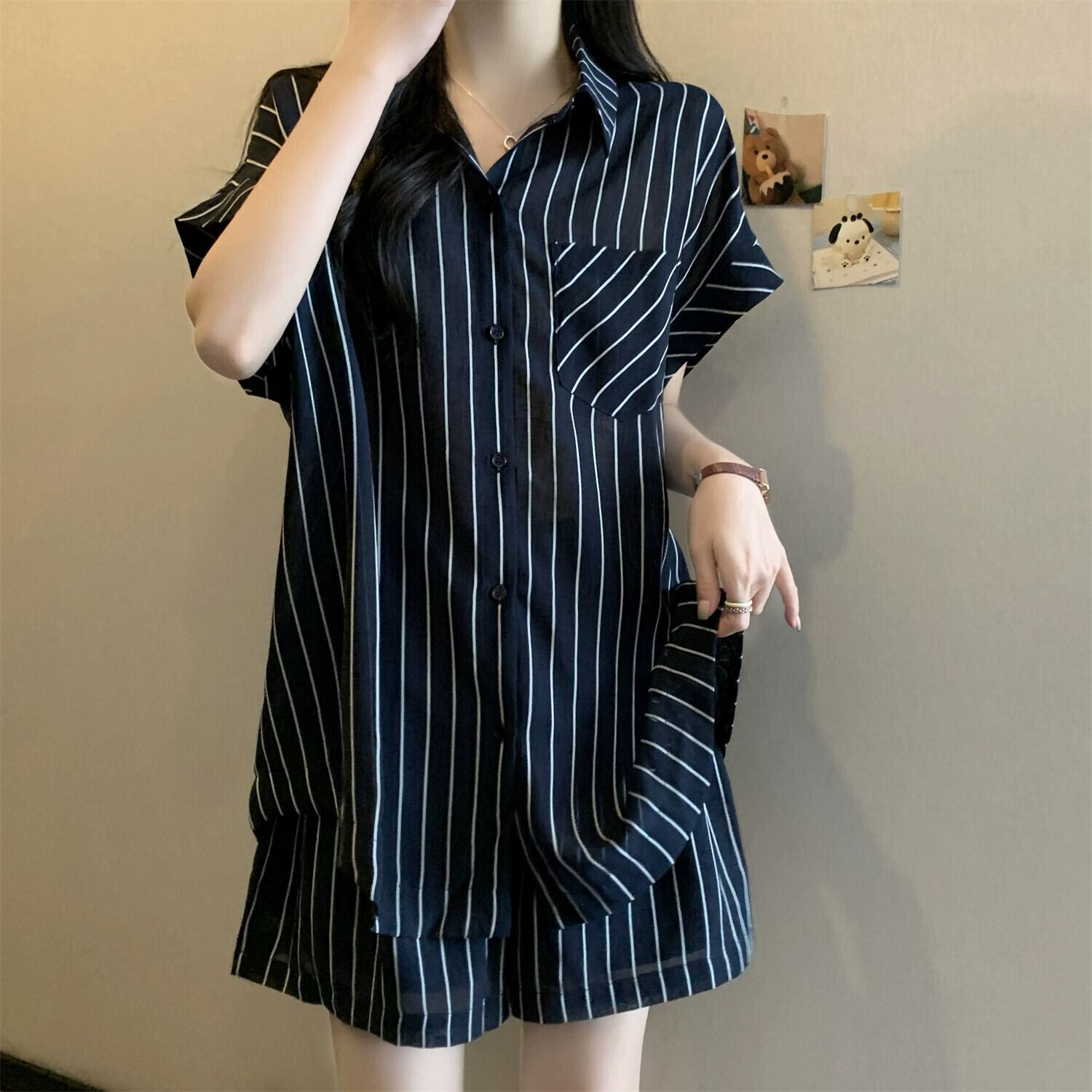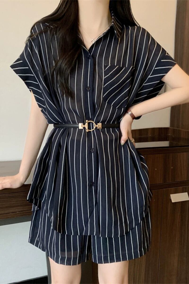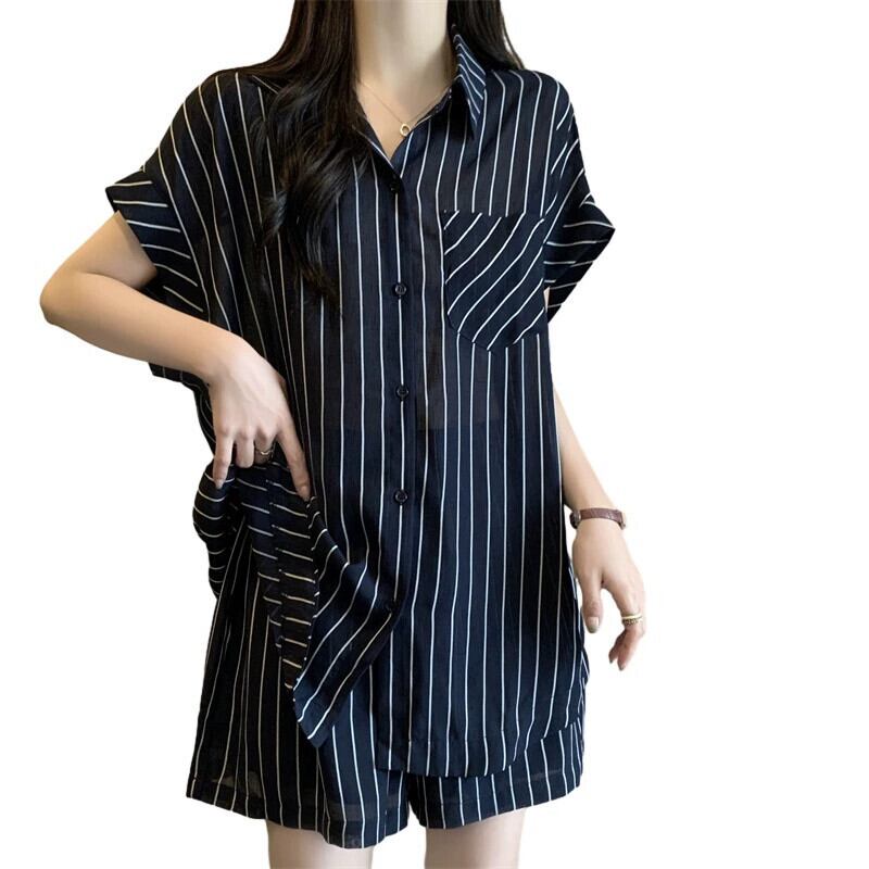 プラスサイズの婦人服 2023 流行の夏の新しいファットシスターストライプシニアスーツファッションニッチシャツショーツ 2 点セット 大きめサイズ サマー 夏物 ブルマー 8884199854603786