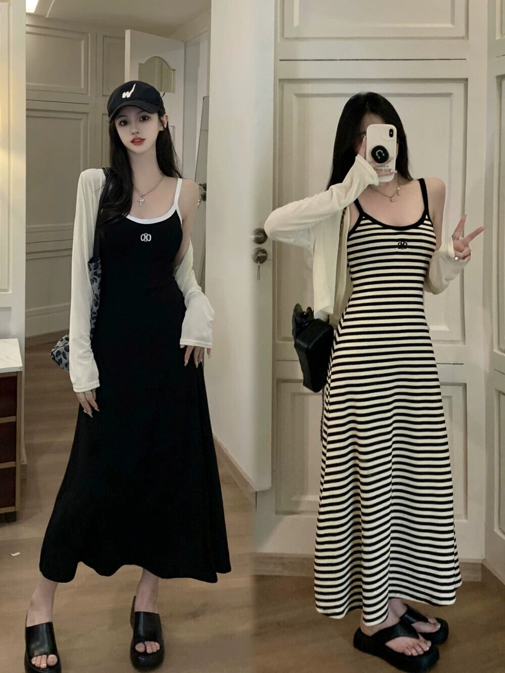 色:カーディガン,ブラックサスペンダースカート,ストライプキャミソール