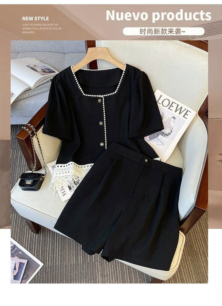 プラスサイズの女性の 2023 夏服脂肪痩身フレンチ スタイル トップス ハイウエスト ルーズ ワイドレッグ ショーツ 2 点セット ハイウェスト 大きめサイズ サマー 夏物 ブルマー ワイドパンツ 8884171837431133
