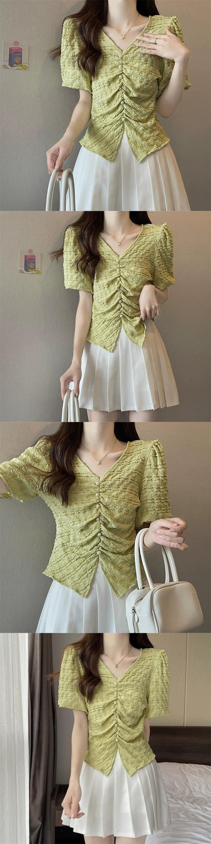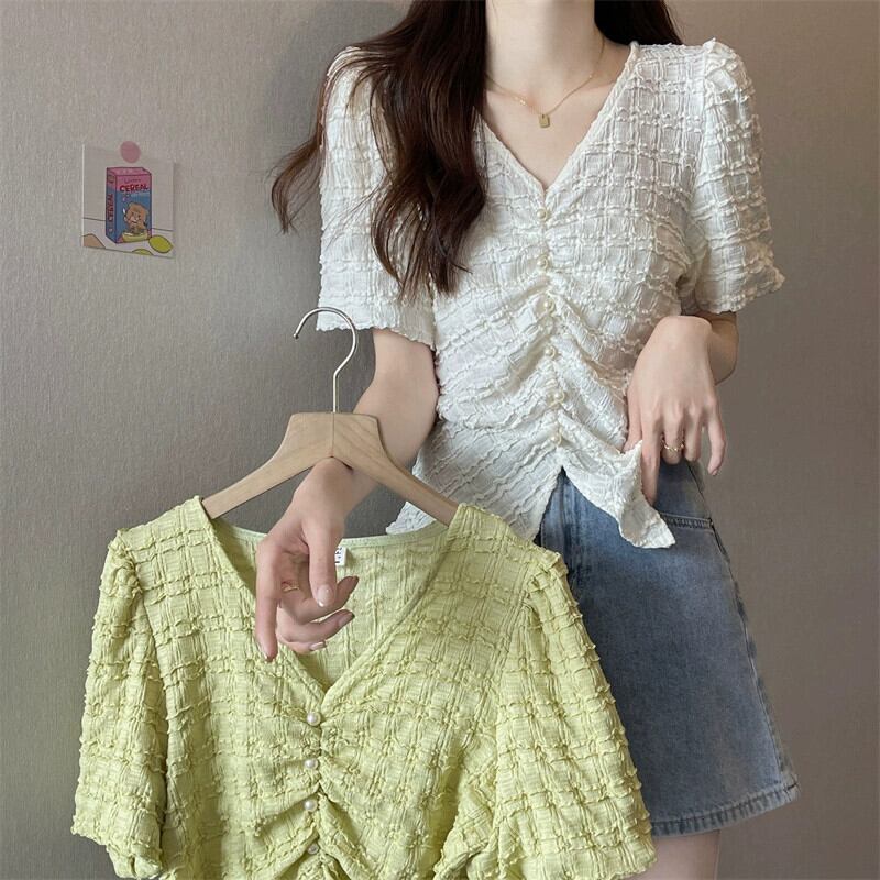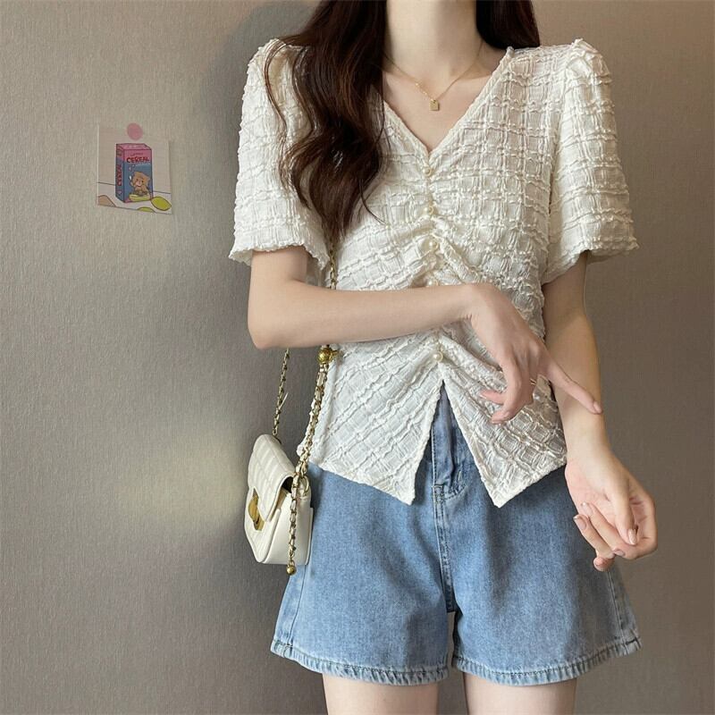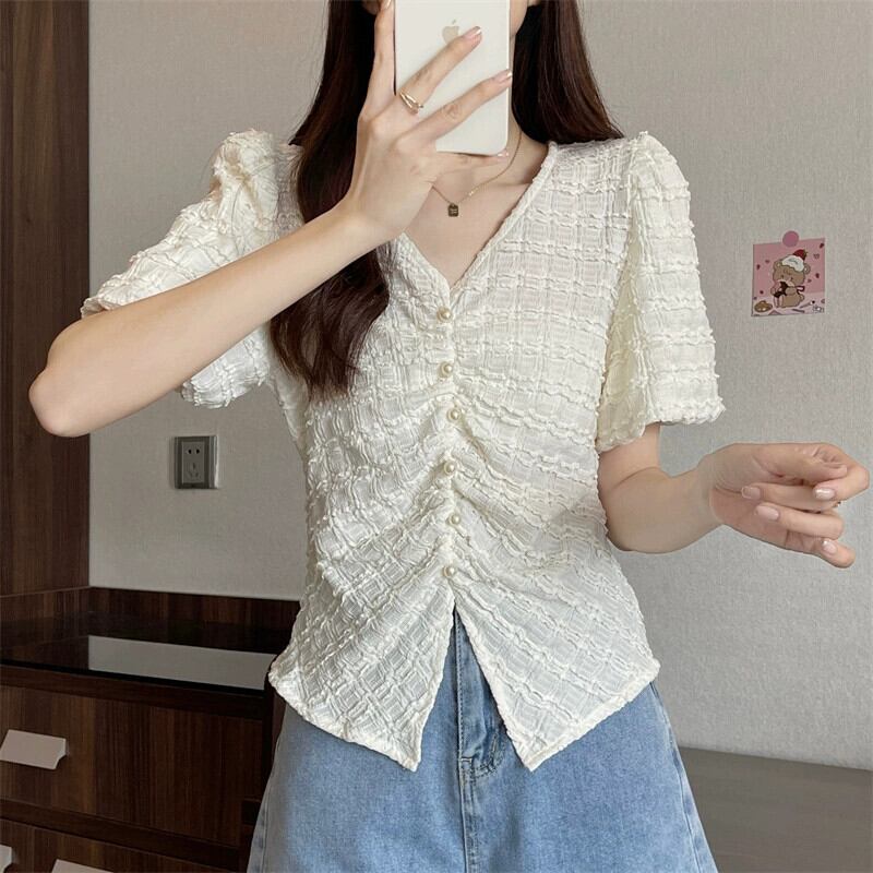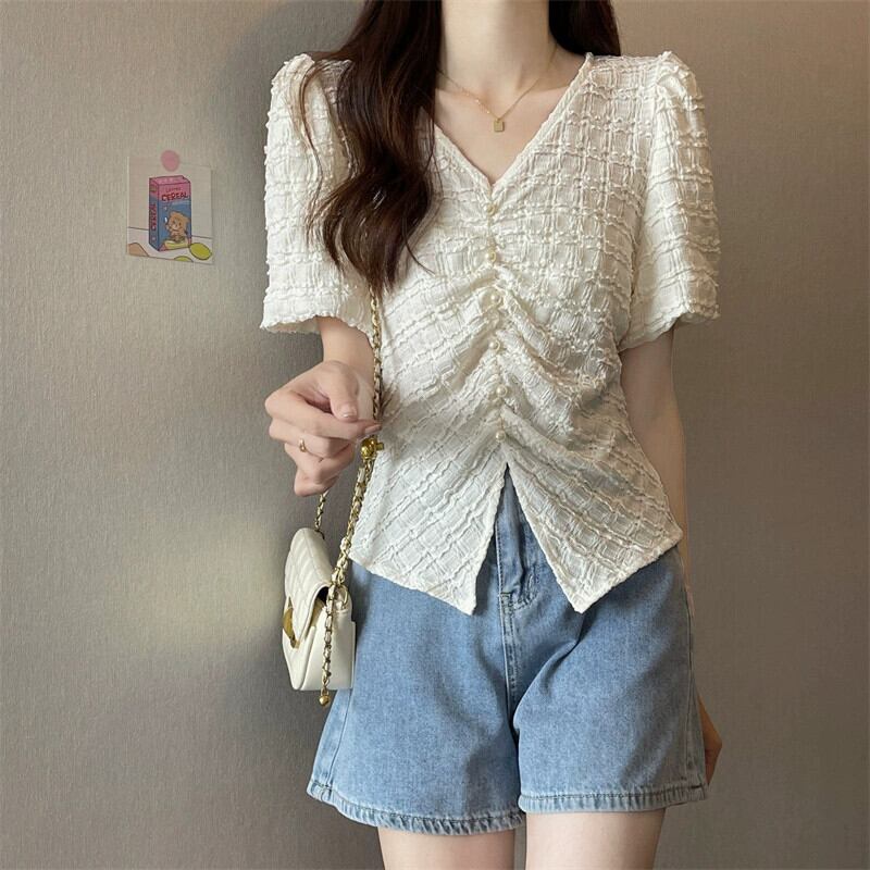 プラスサイズの女性の 2023 夏服ファットニッチフレンチプリーツ V ネックシフォンシャツパール半袖シックなトップ 大きめサイズ サマー 夏物 Vネック 真珠 8884111325262541