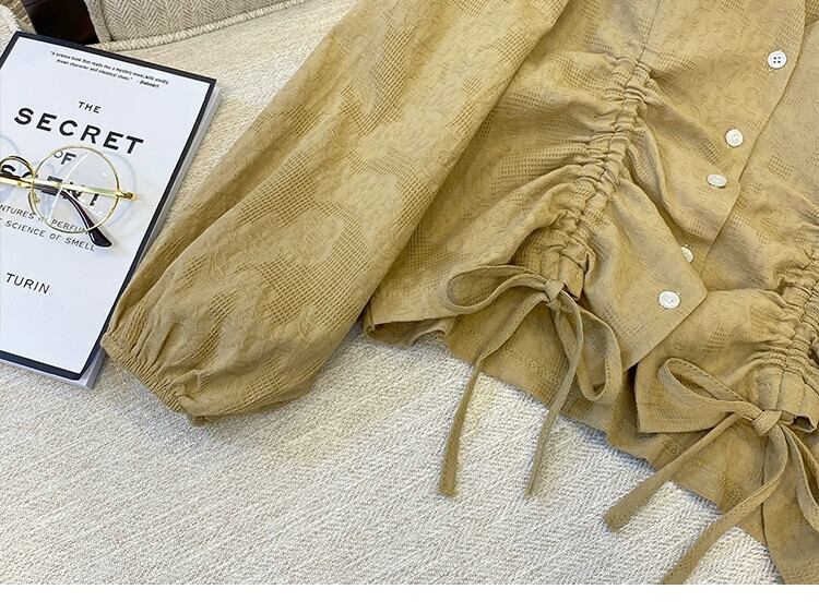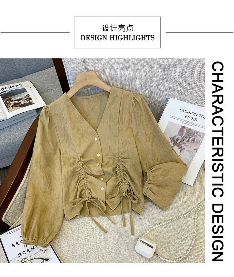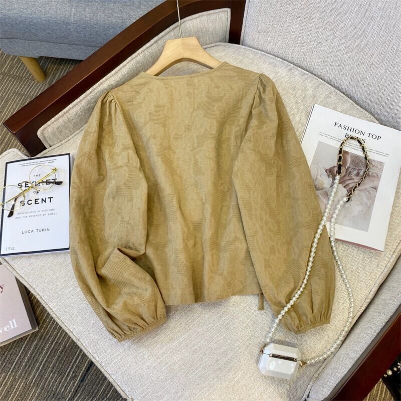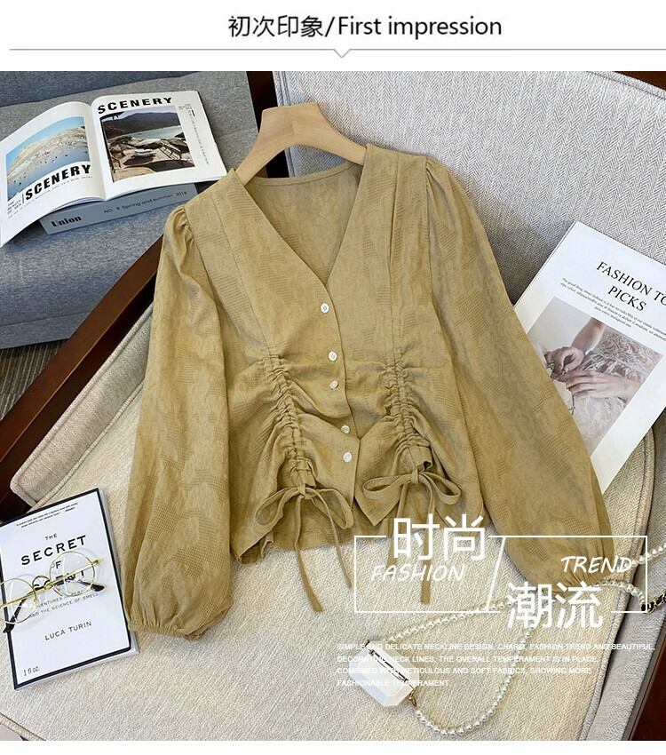 プラスサイズの婦人服 2023 トレンディな秋の新ファットシスター長袖デザインシャツ V ネック巾着痩身年齢削減トップ ロング 大きめサイズ オータム 秋物 Vネック 8884123855314494