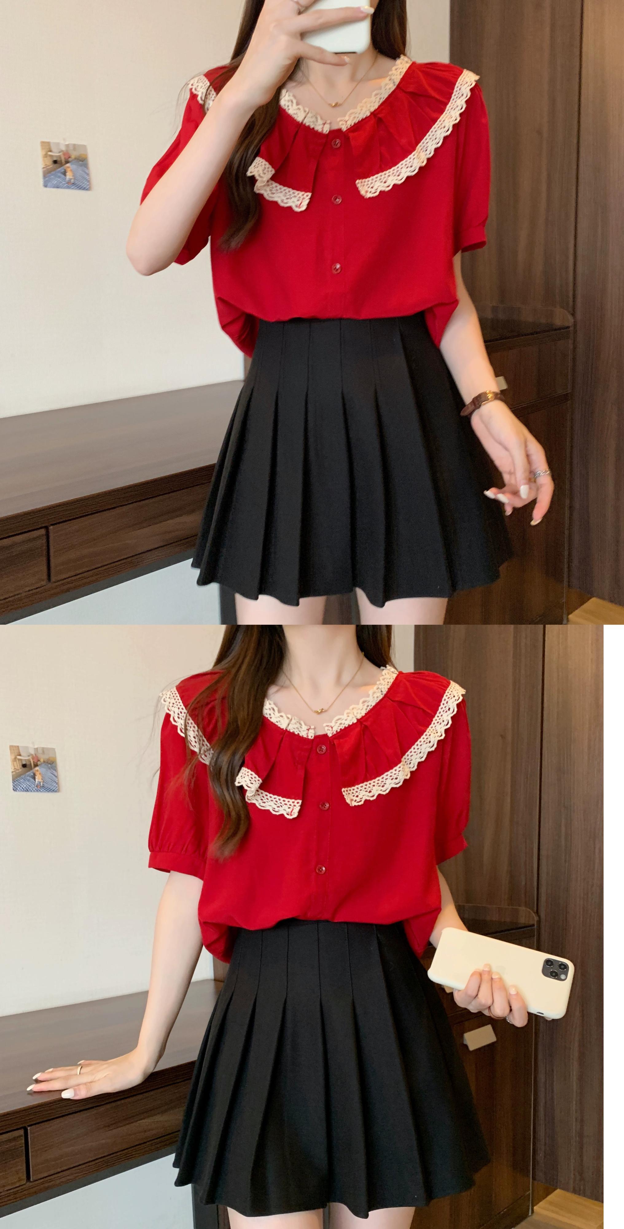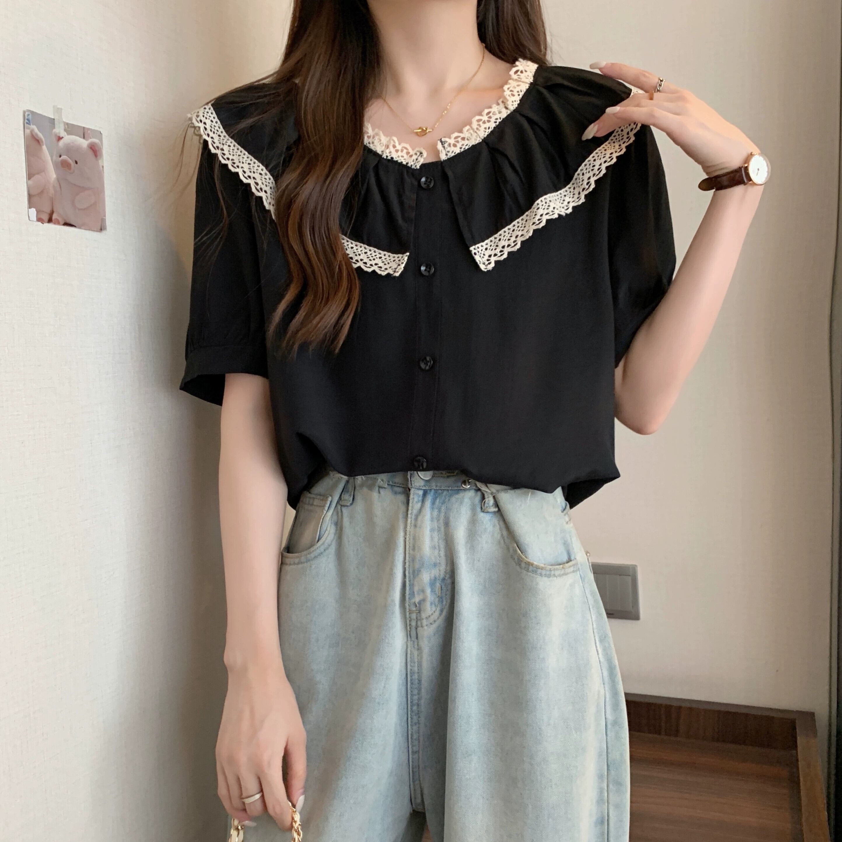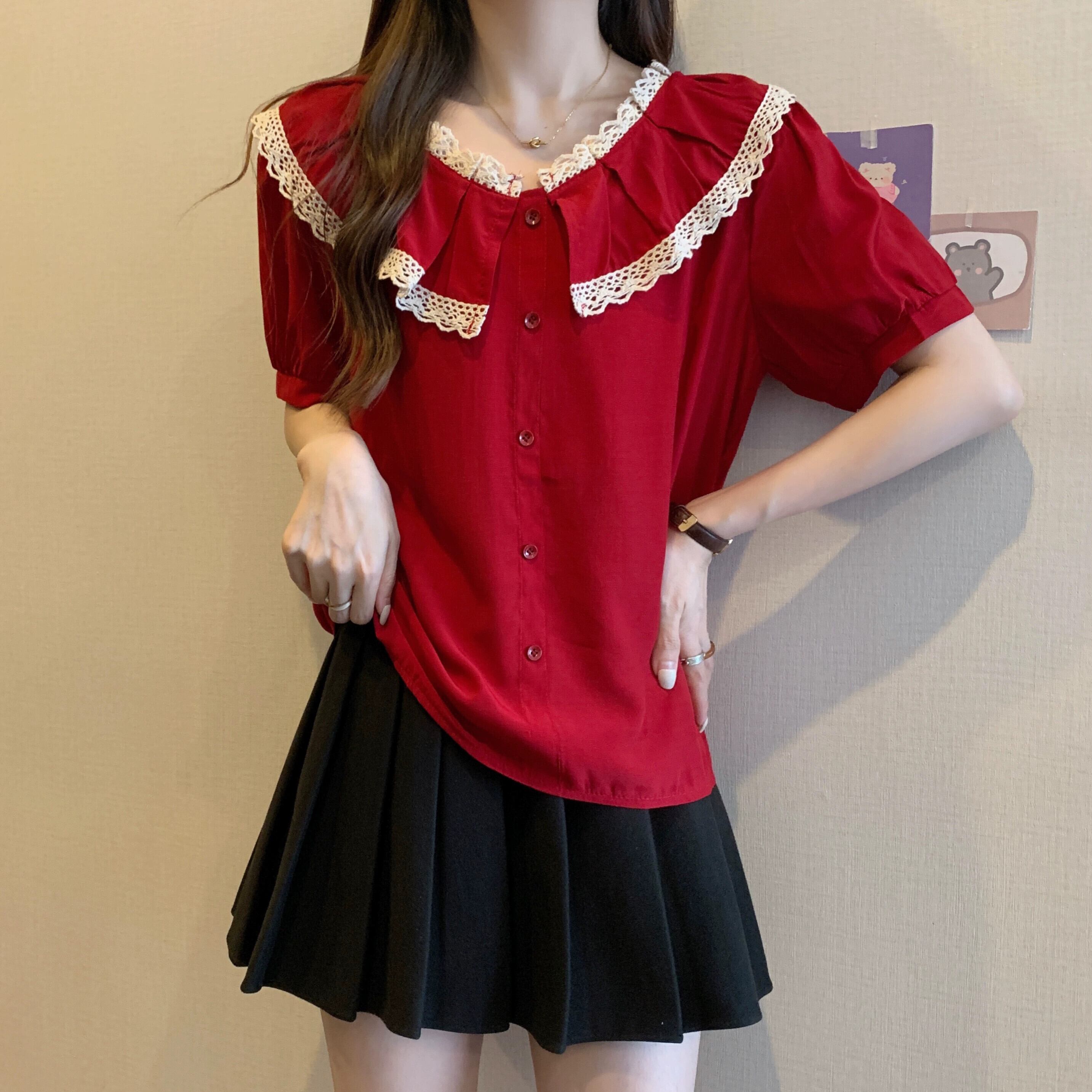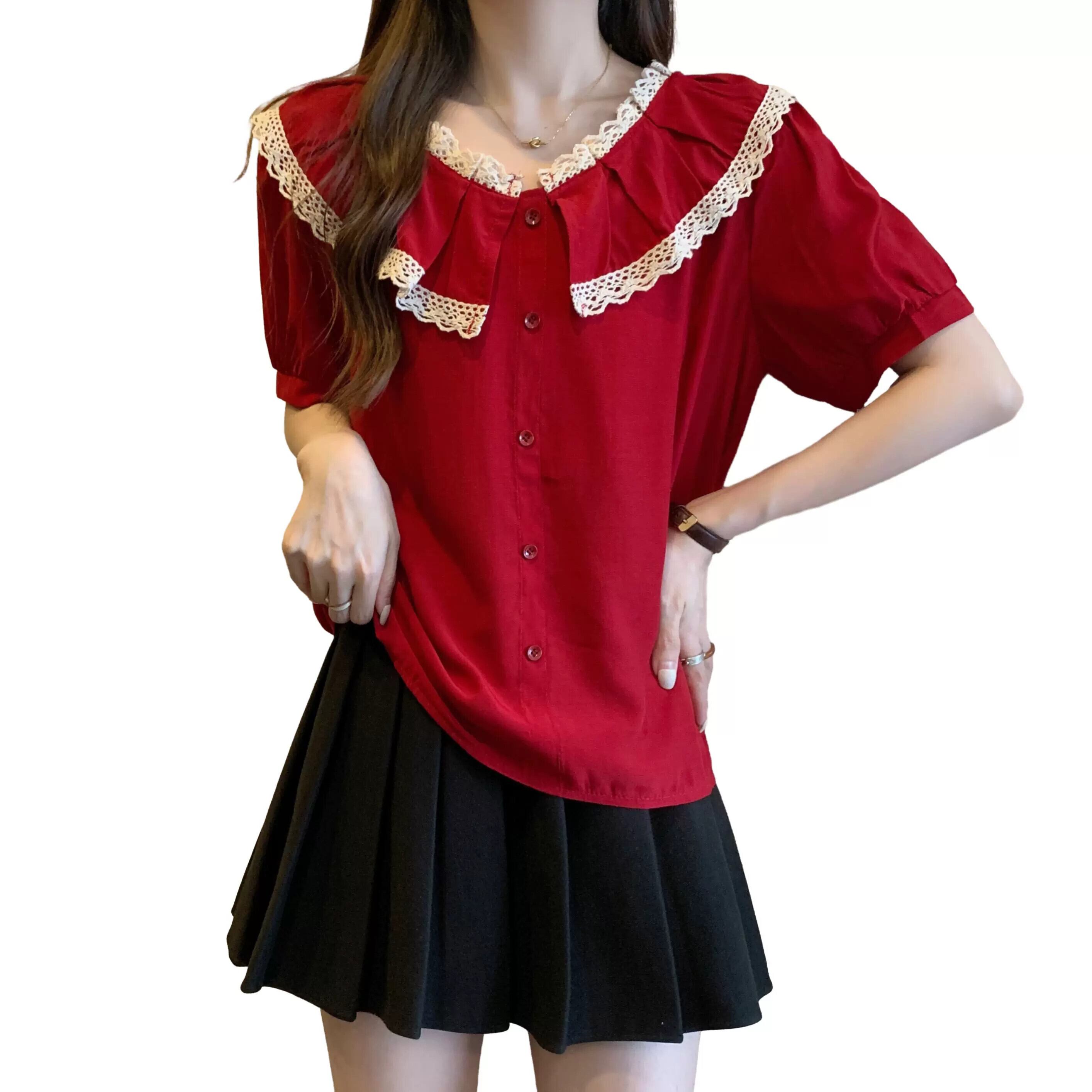 プラスサイズの女性の 2023 脂肪姉妹夏の新しいシャツスタイルのレースのラウンドネックトップルーズ半袖シャツ 大きめサイズ サマー 夏物 Oネック 888411869802476