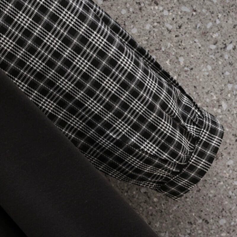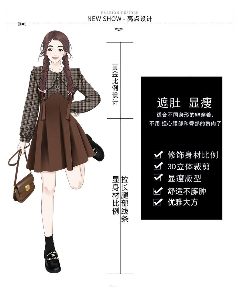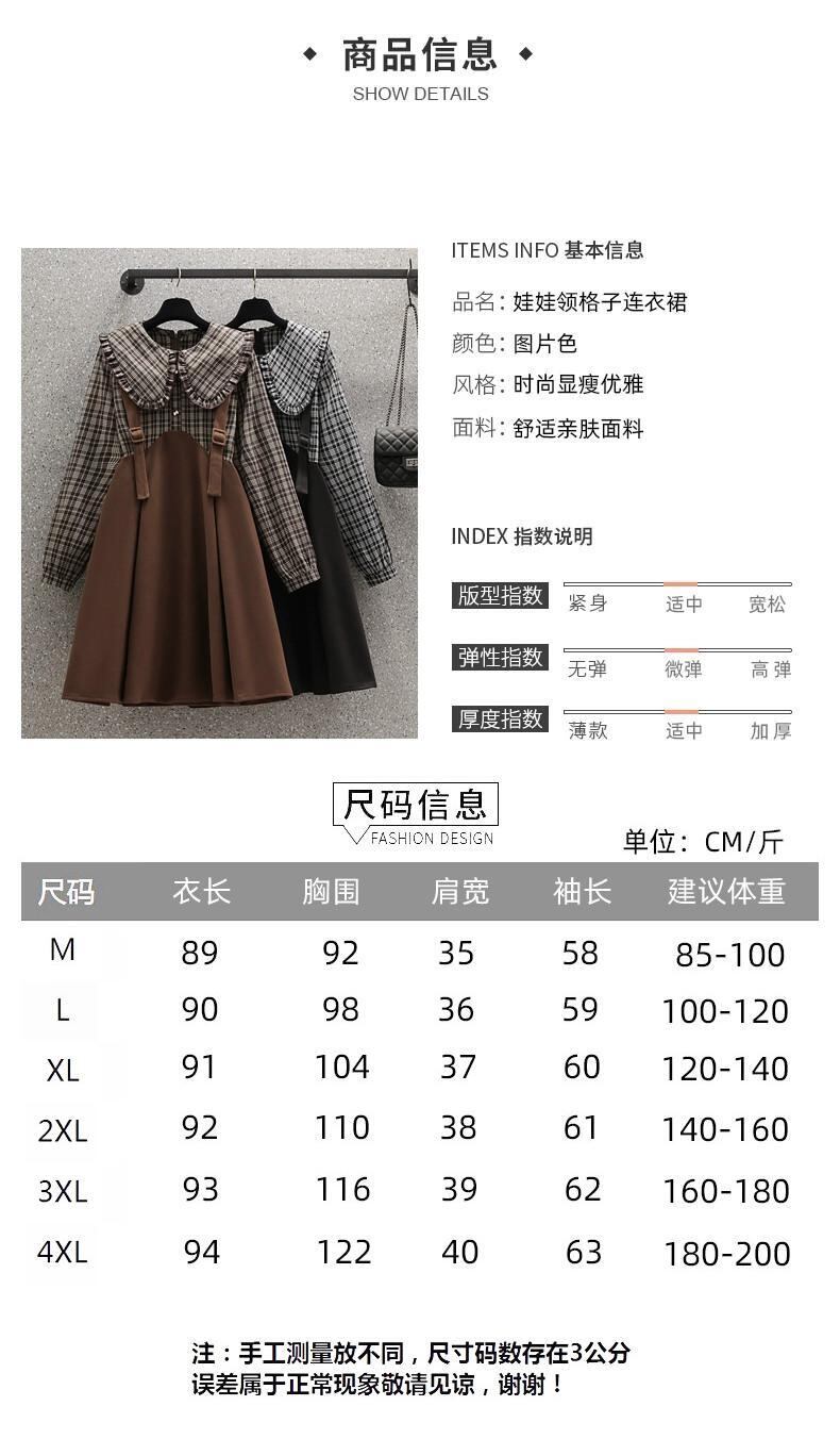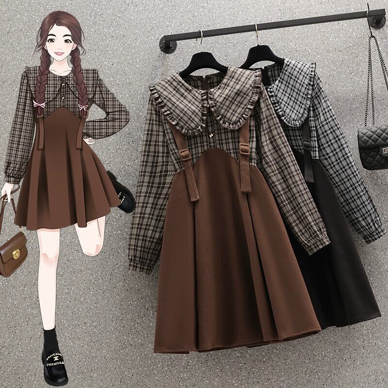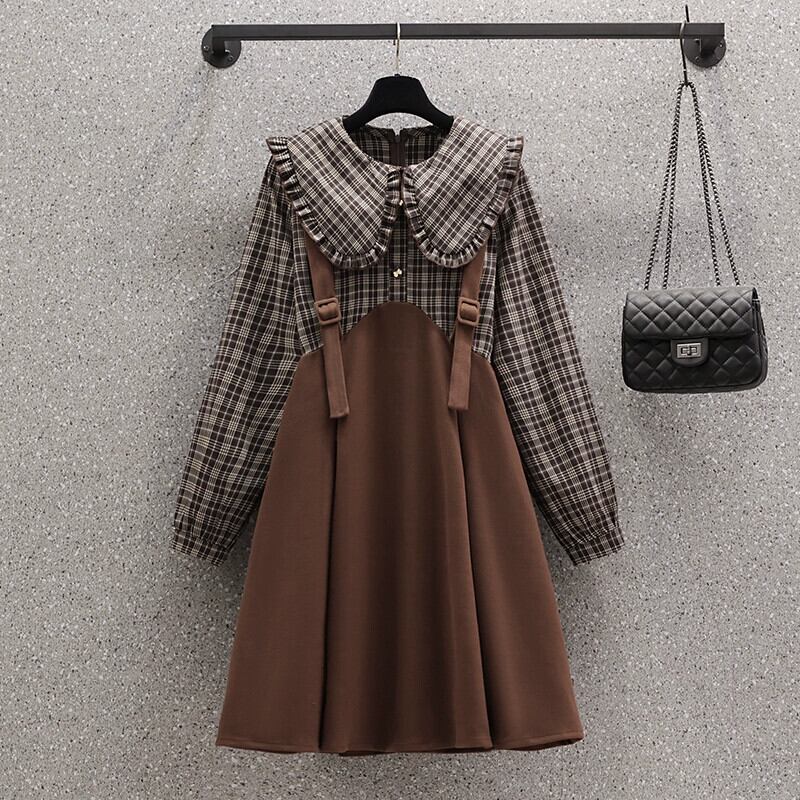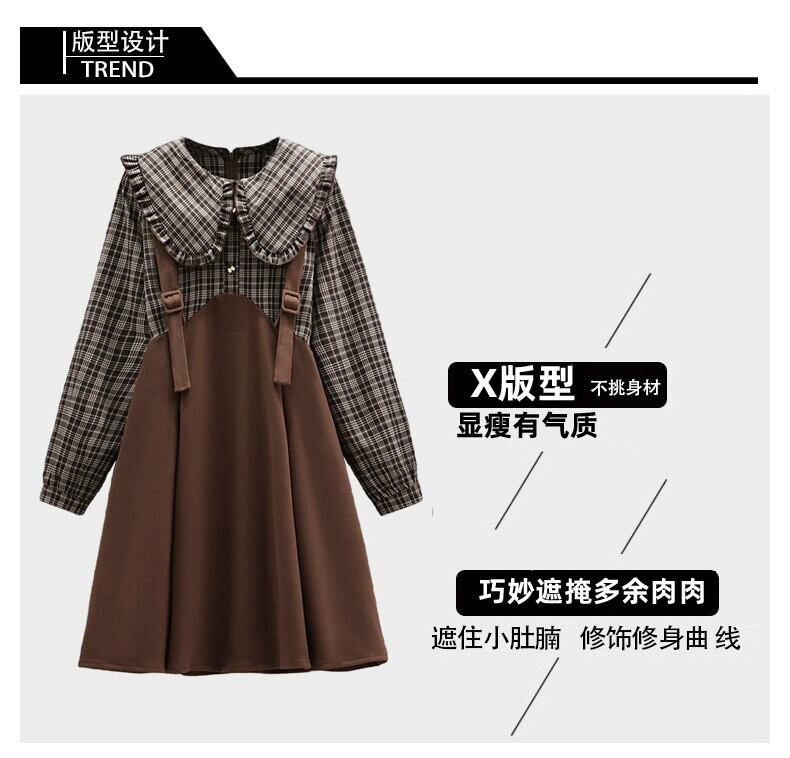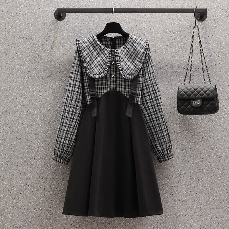 プラスサイズの婦人服 2023 秋の脂肪姉妹の年齢を減らすチェック柄フェイクツーピース A ラインスカートスプライシング人形襟ニッチドレス 大きめサイズ オータム 秋物 Aライン 8884154807017875