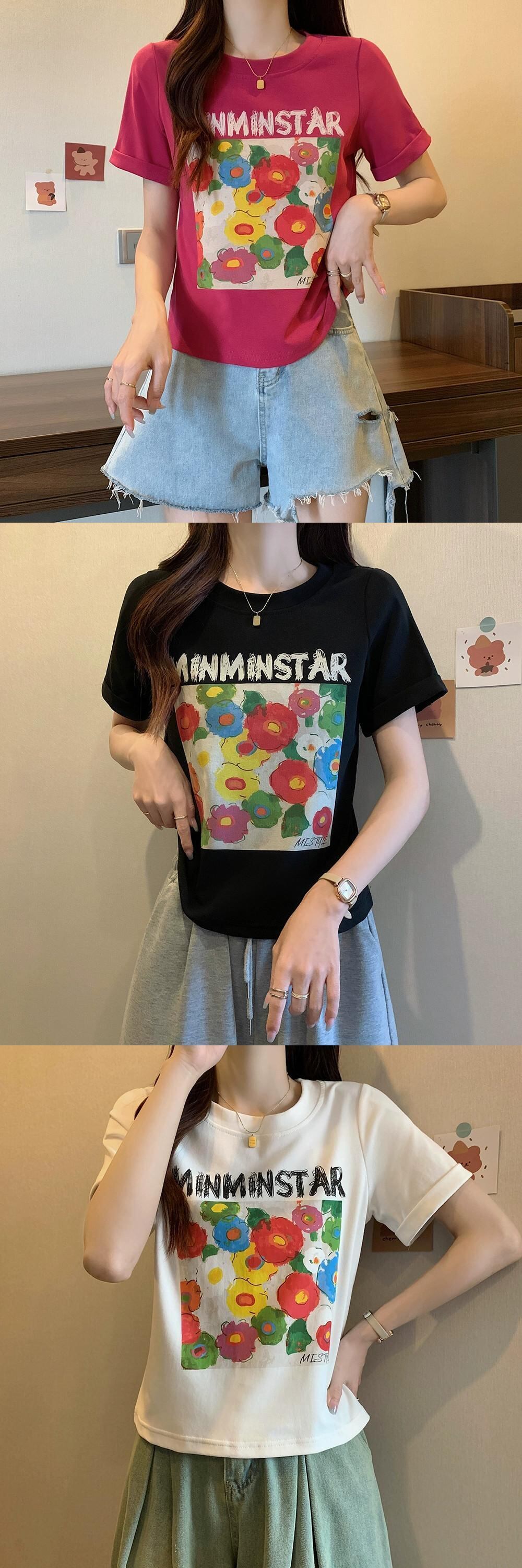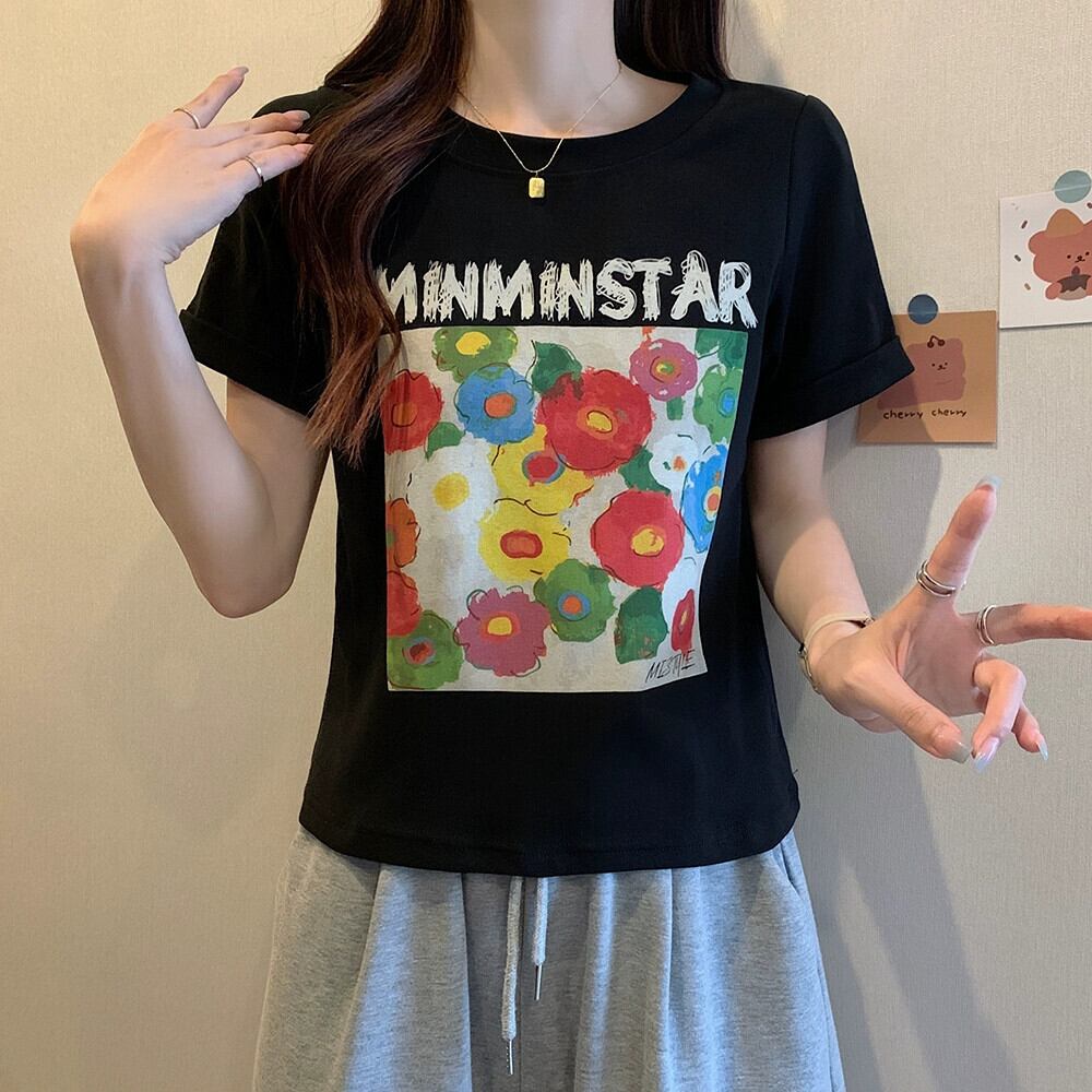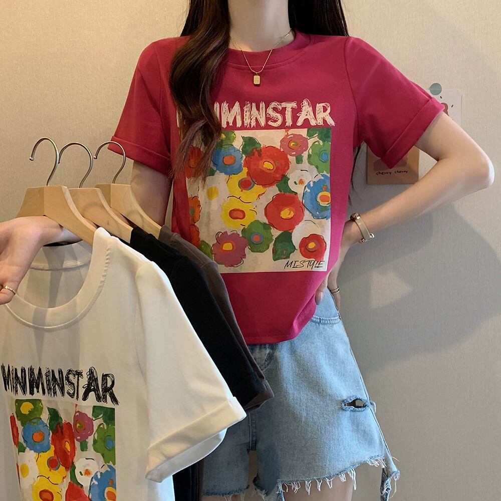 プラスサイズの婦人服 2023 ファットシスター夏新スタイルフレンチプルオーバー多用途フラワープリント痩身半袖 Tシャツトップ 大きめサイズ サマー 夏物 フラワーデザイン 8884169309579803