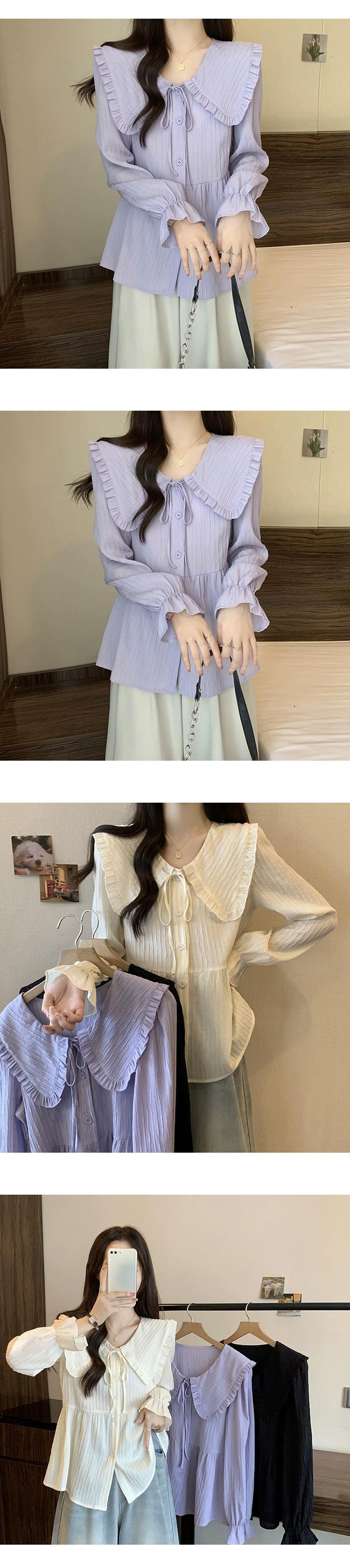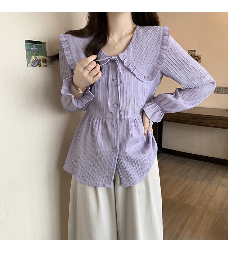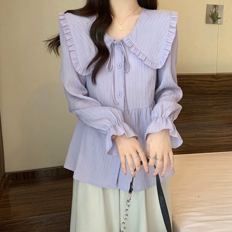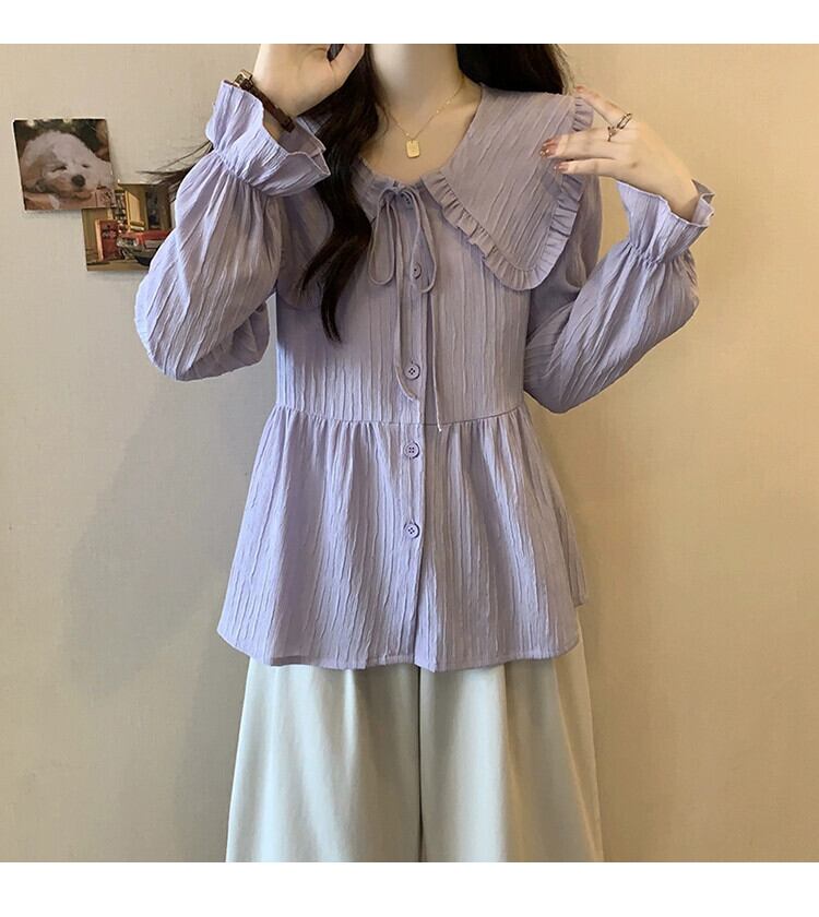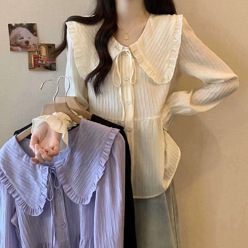 プラスサイズの婦人服 2023 トレンディな秋の新脂肪気質真菌エッジ人形襟トップテクスチャー長袖シャツ ロング レッド 大きめサイズ オータム 秋物 8884196009703037