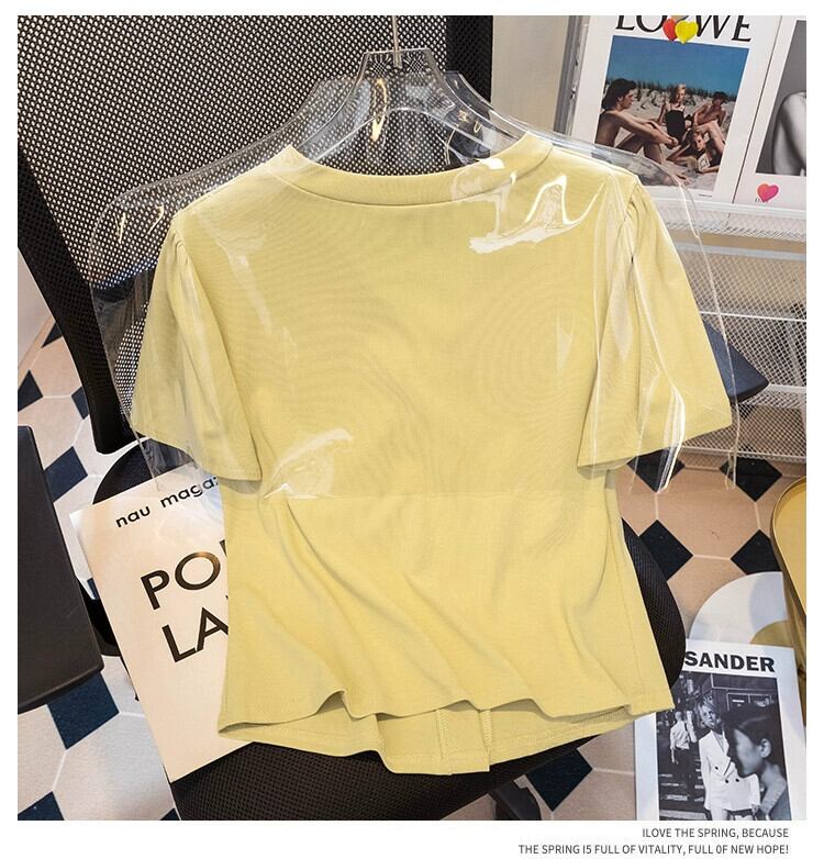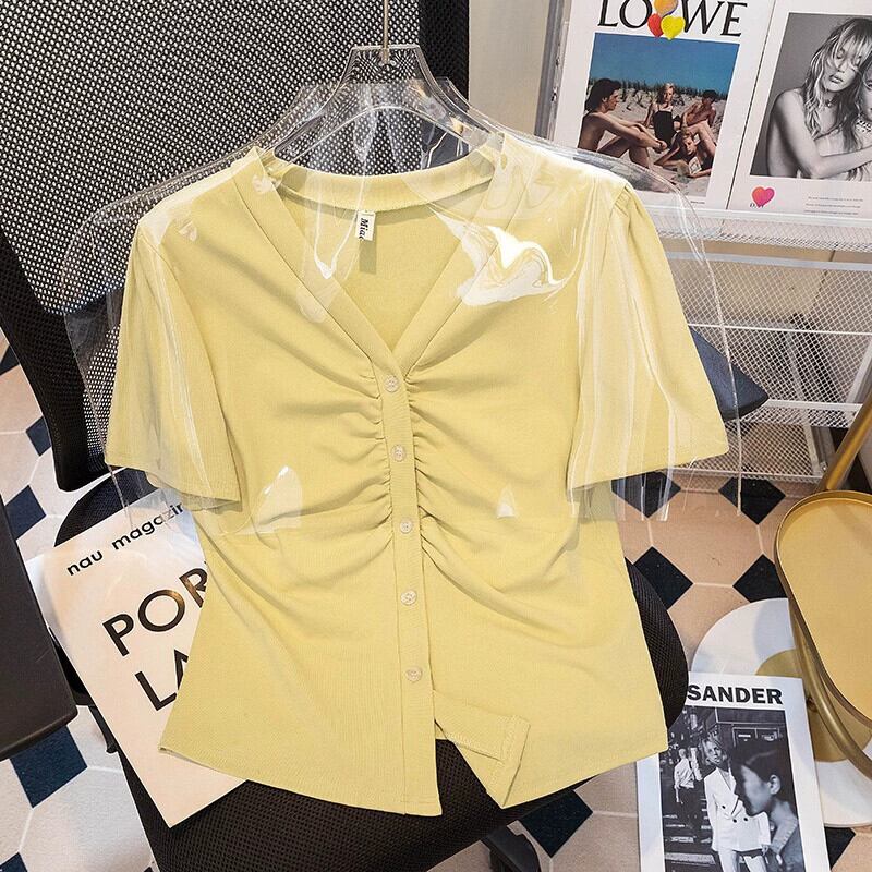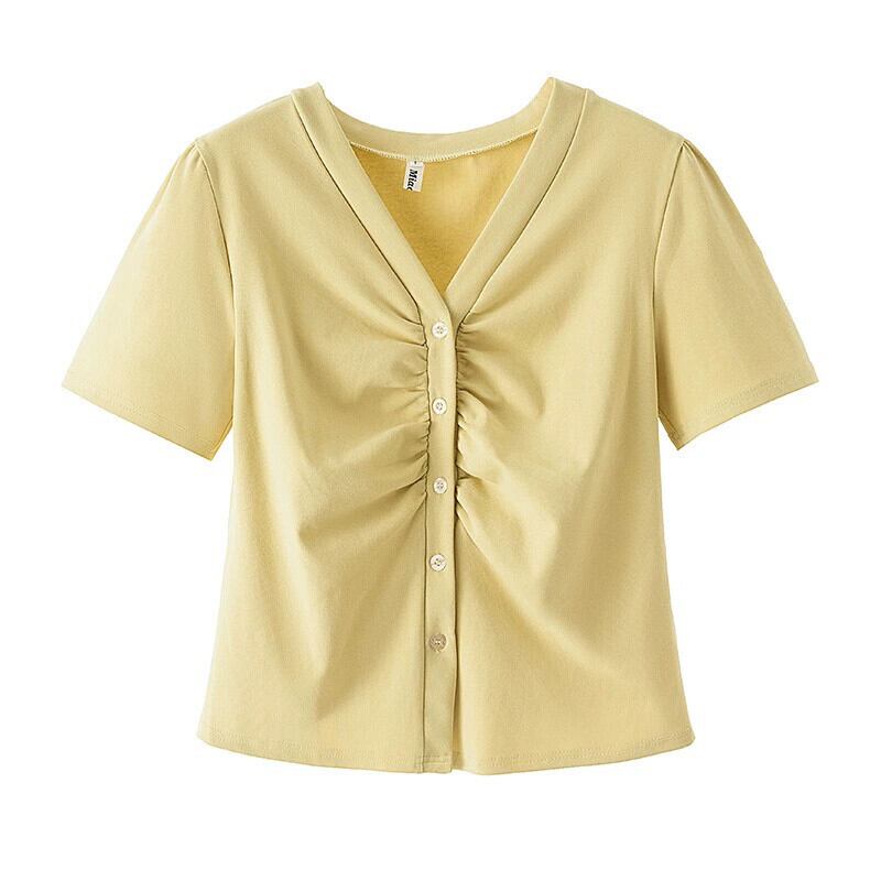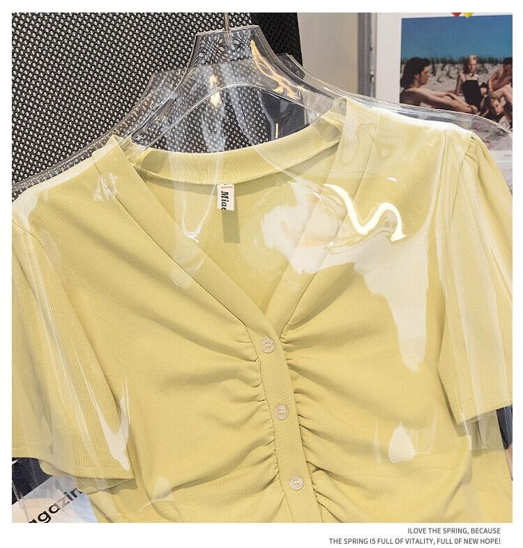 プラスサイズの女性の 2023 新しい夏のデザインプリーツ半袖 T シャツ脂肪腹をカバーし、スリムに見える V ネック トップ 大きめサイズ サマー 夏物 Vネック Tシャツ 8884136738241210