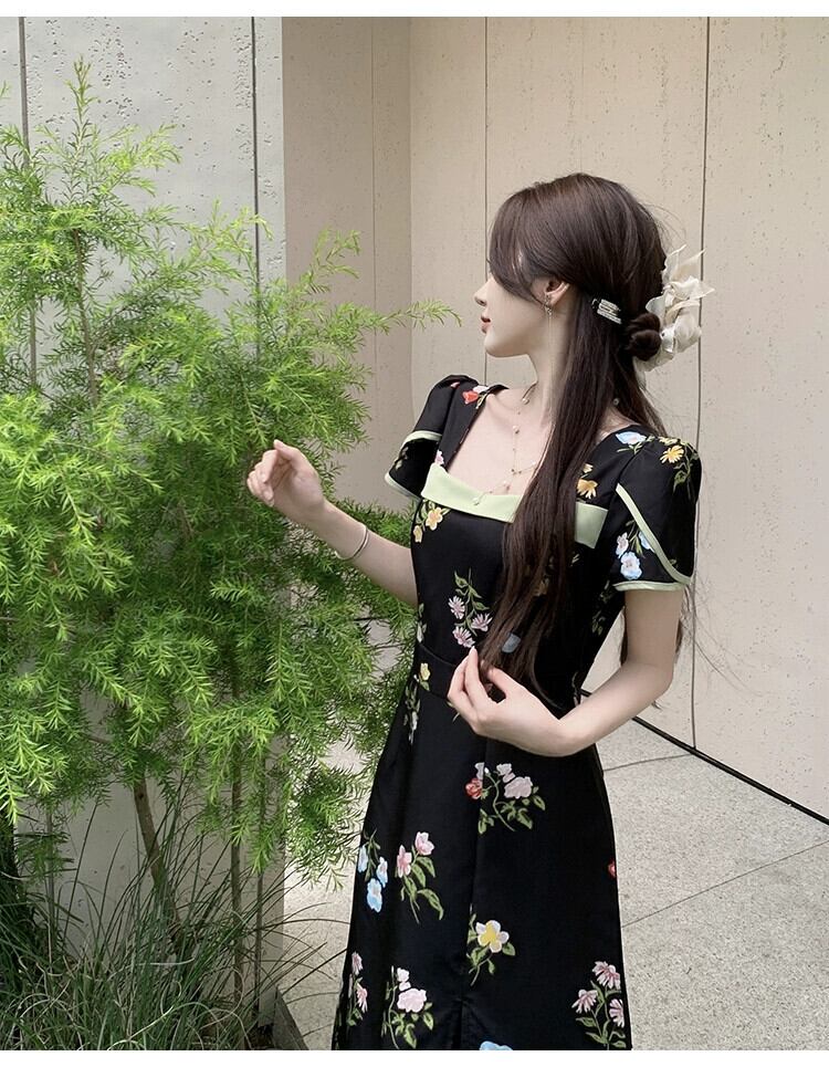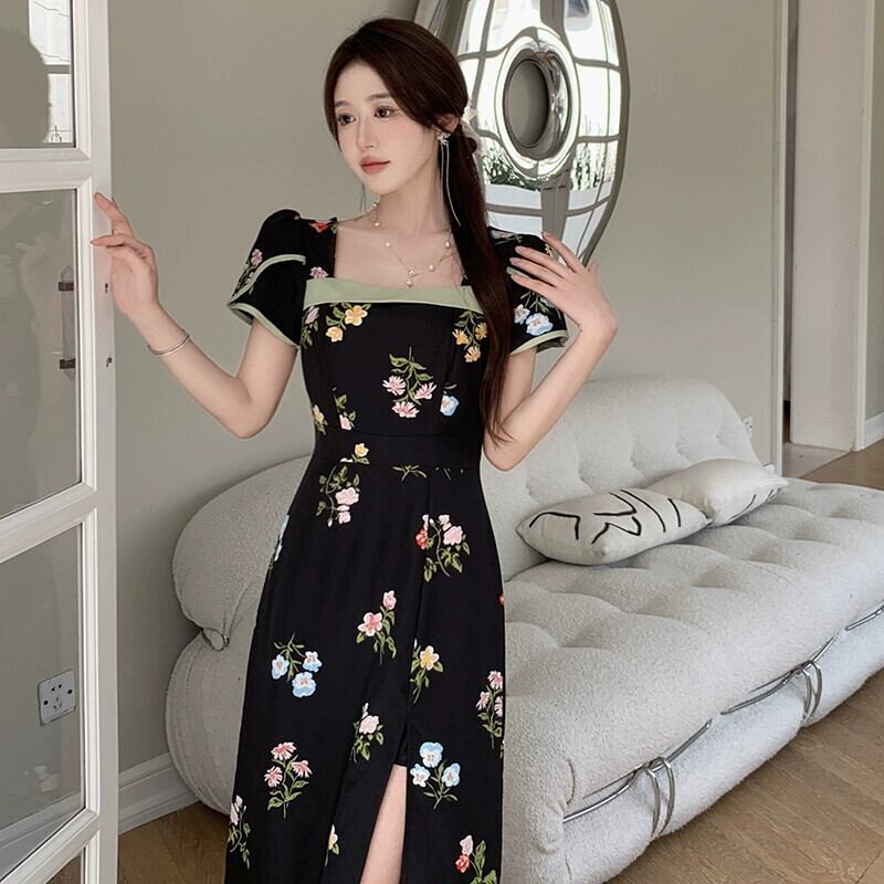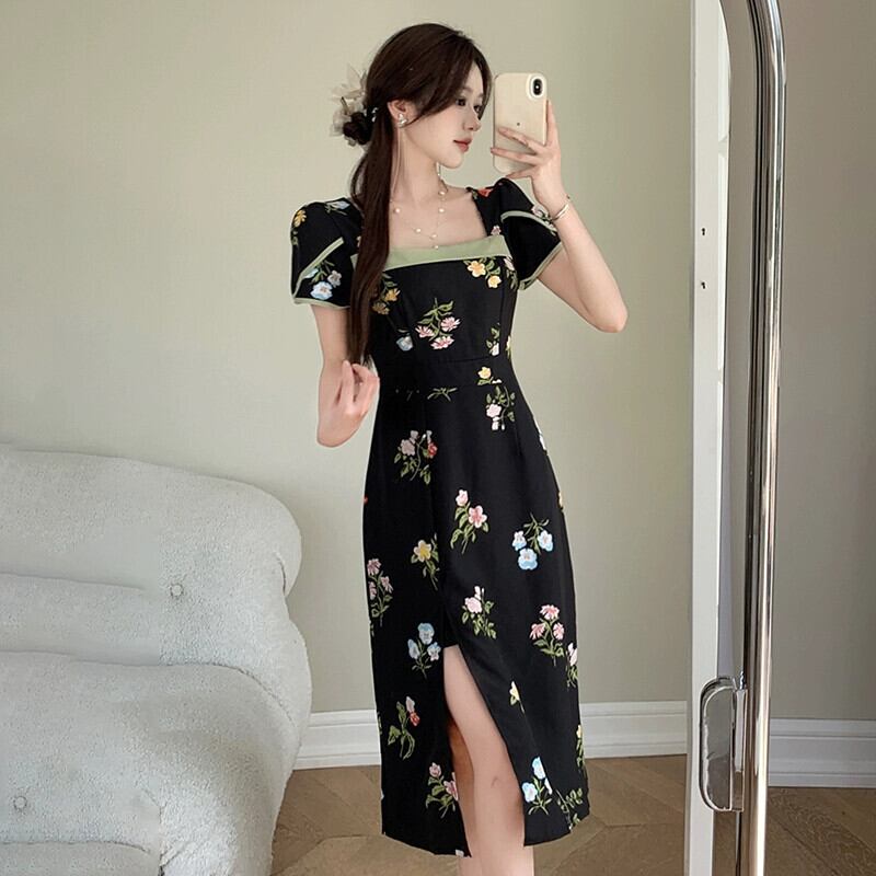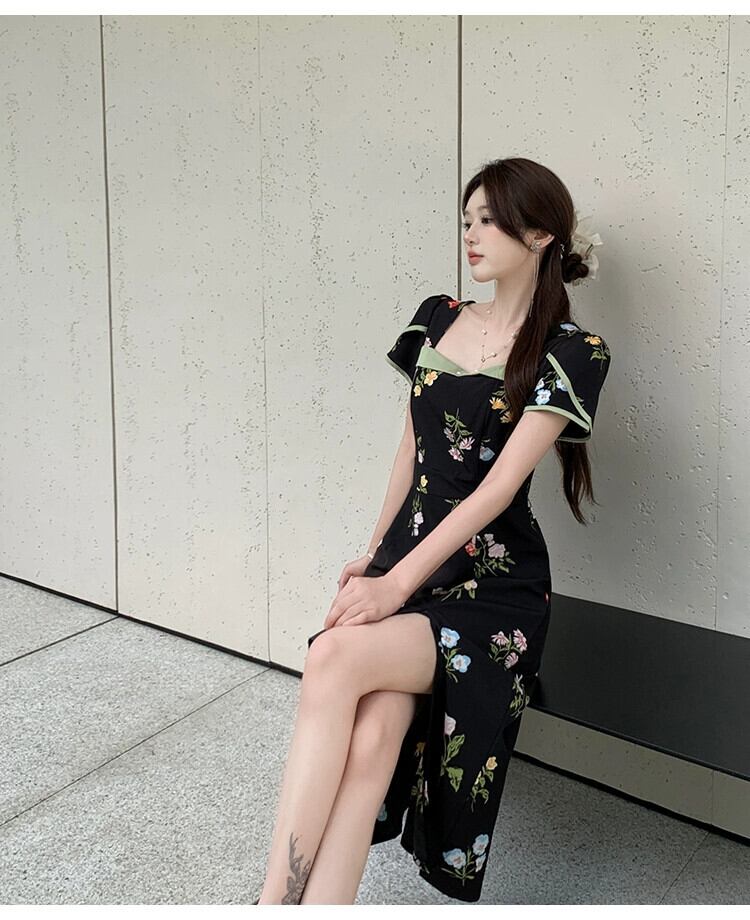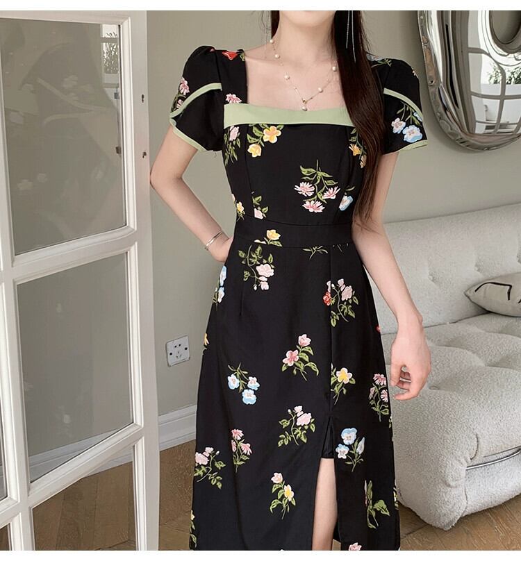 プラスサイズの婦人服 2023 脂肪姉妹夏の新しいスタイルのレトロプリントミッドレングススカートスプライシングスクエアカラースリムスリットドレス 大きめサイズ サマー 夏物 スクウェア 8884137888605437