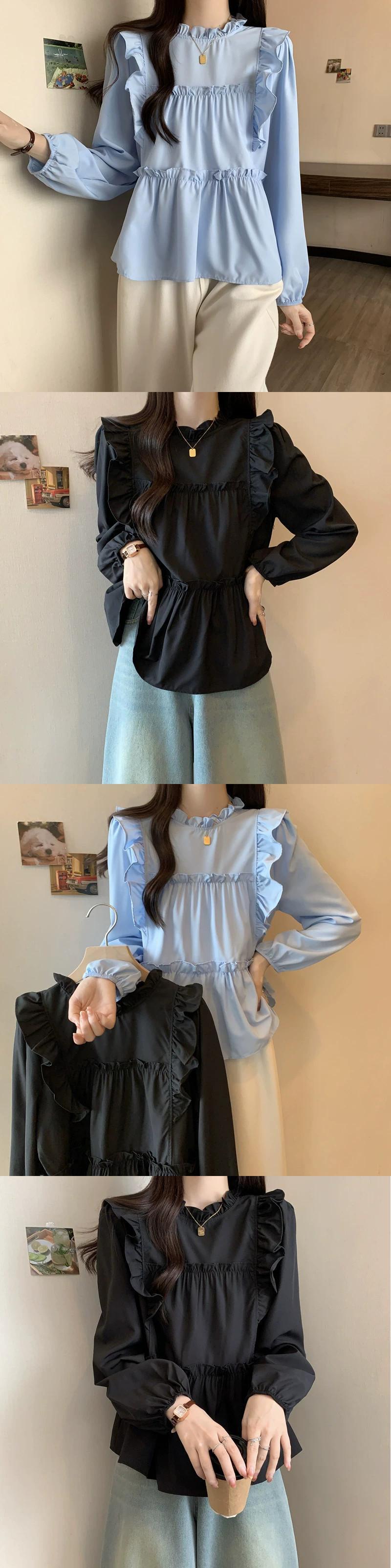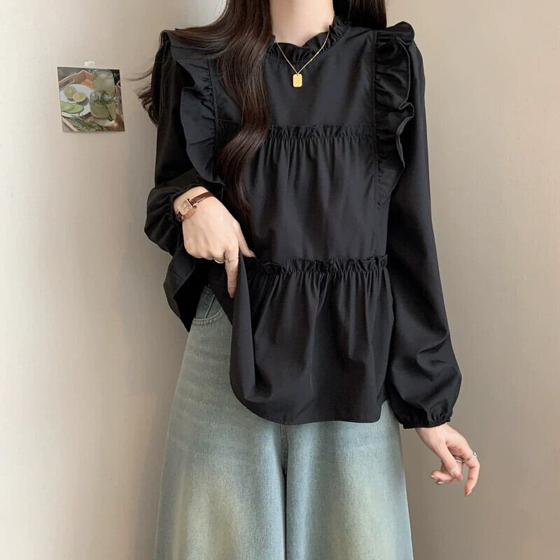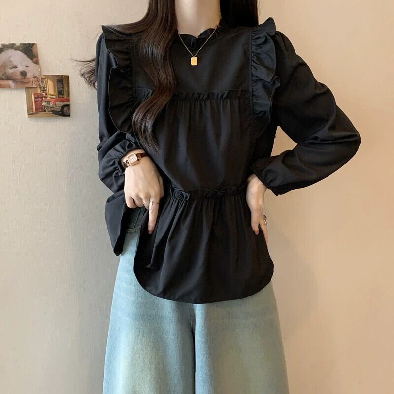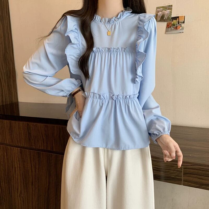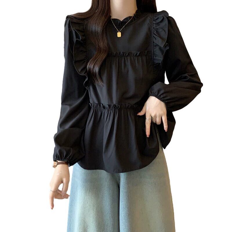 プラスサイズの婦人服 2023 秋服お腹をカバーする太い長袖フリルシフォンシャツ、シックなカジュアルニッチトップス ロング 大きめサイズ オータム 秋物 8884153622318623