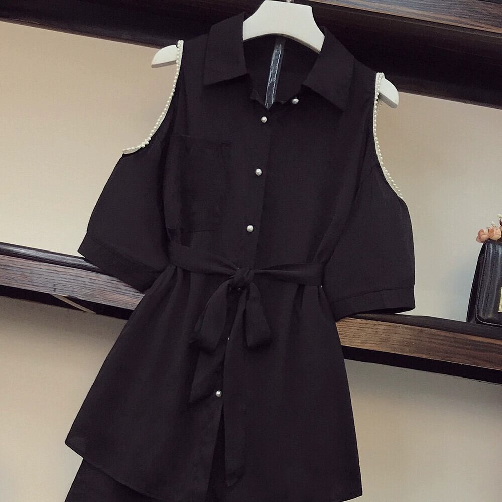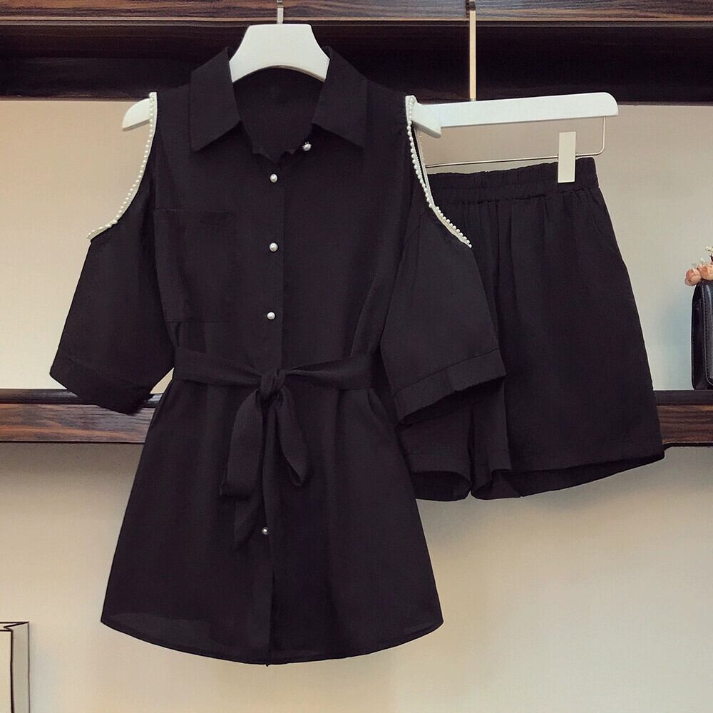 プラスサイズの女性の脂肪気質年齢を軽減するウエストオフショルダーシャツワイドレッグショーツデザインニッチサマーツーピースセット 大きめサイズ 夏物 ブルマー 888414937758655