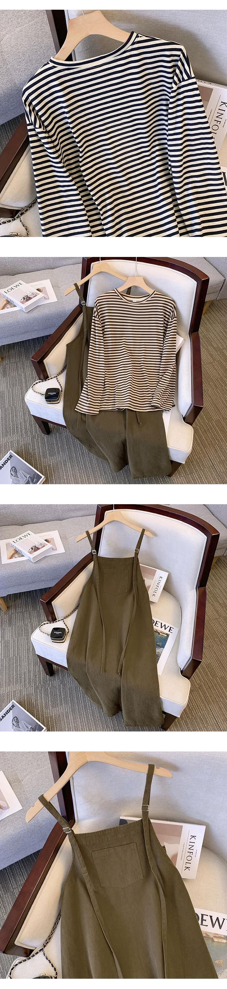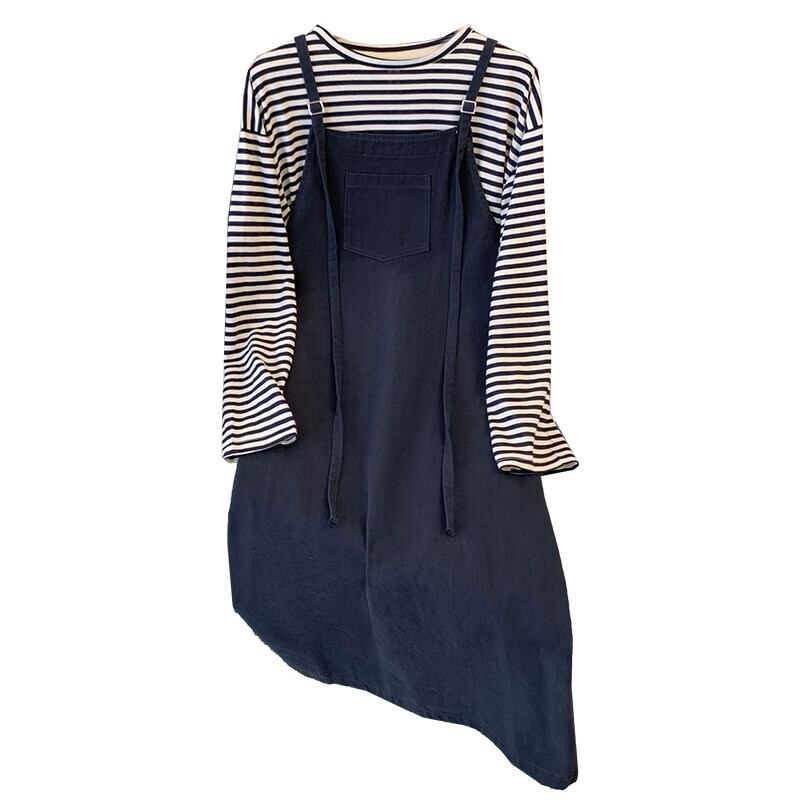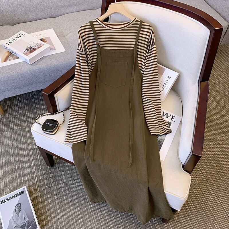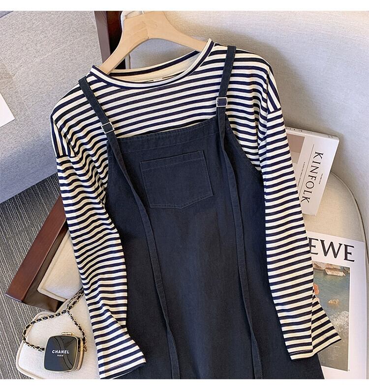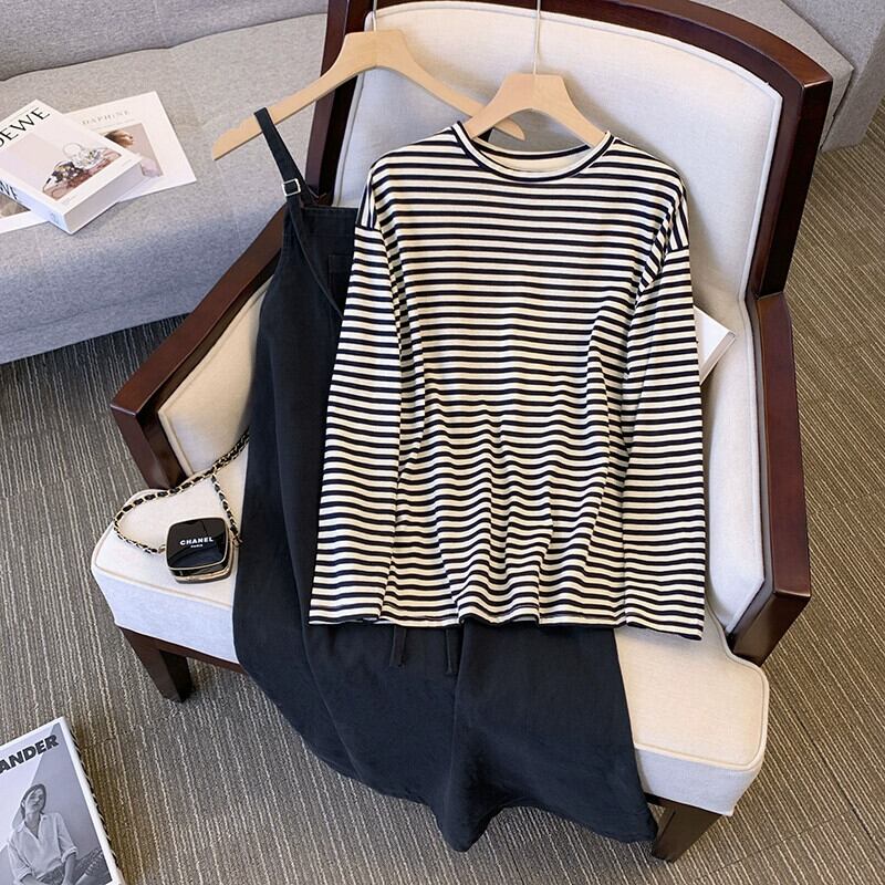 プラスサイズの婦人服 2023 脂肪姉妹秋の新ファッションスリムルーズストライプ長袖 Tシャツサスペンダースカート 2 点セット ロング 大きめサイズ オータム 秋物 888416325250122