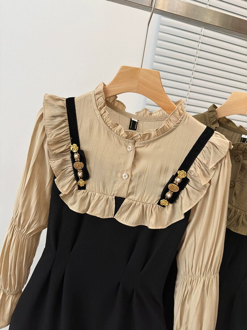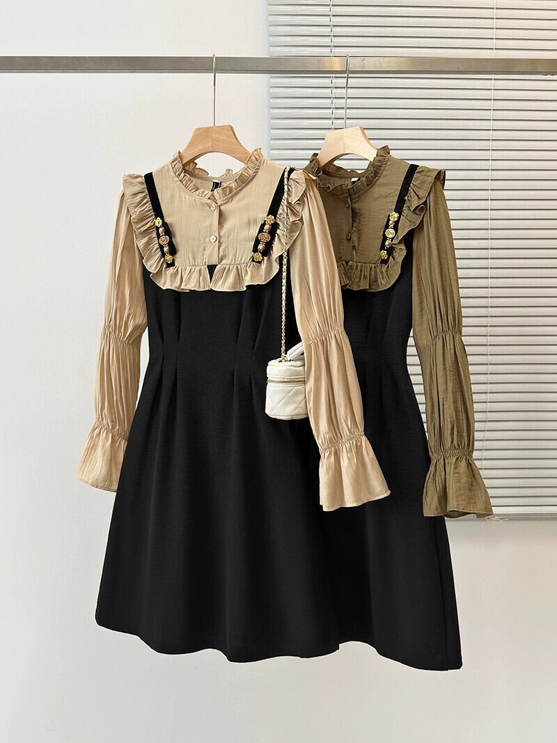 プラスサイズの婦人服 2023 流行の秋の新脂肪姉妹ファッションスプライシングトランペットスリーブスカート気質偽ツーピースドレス 大きめサイズ オータム 秋物 8884199075073910