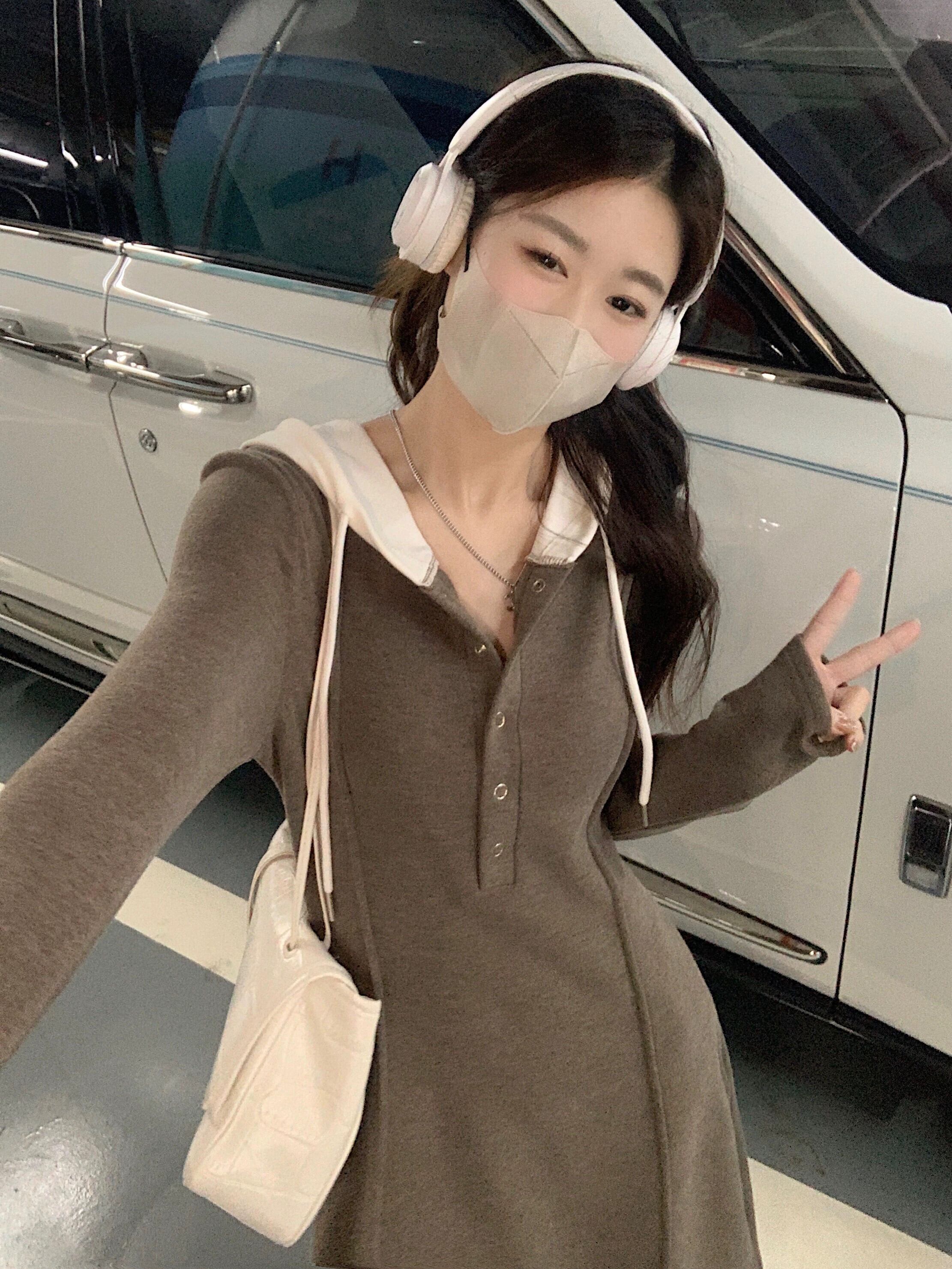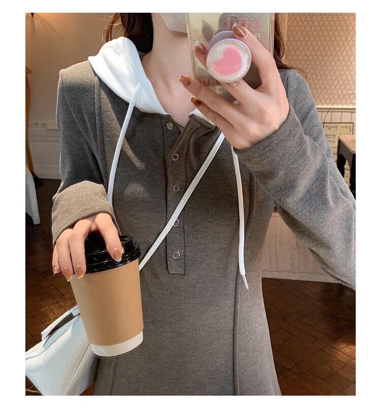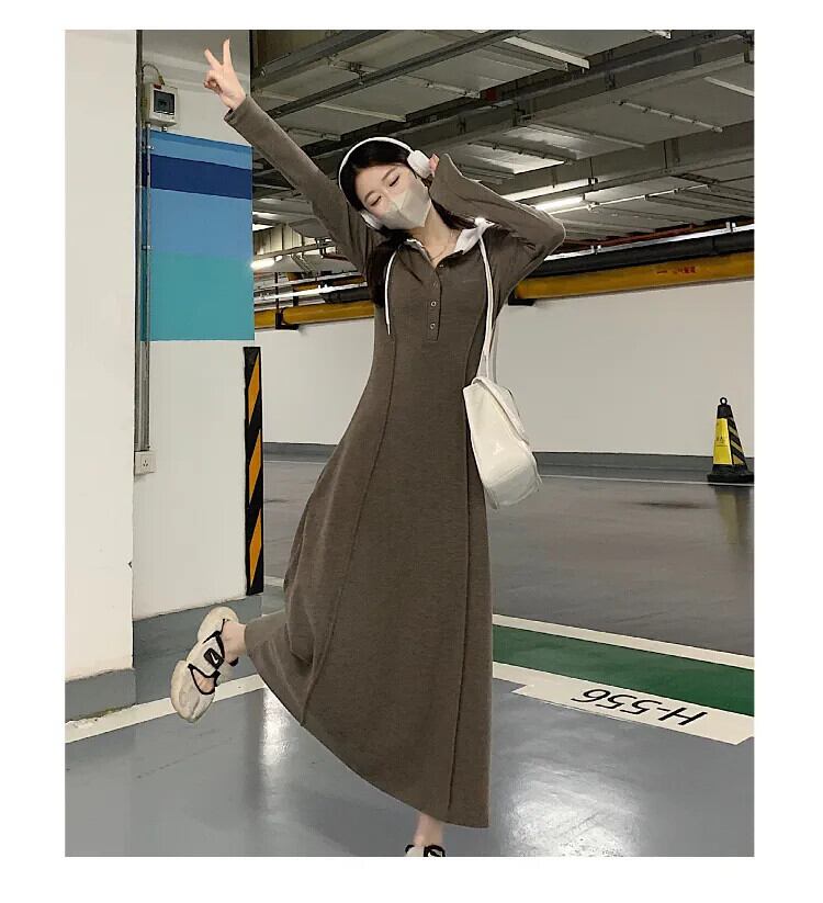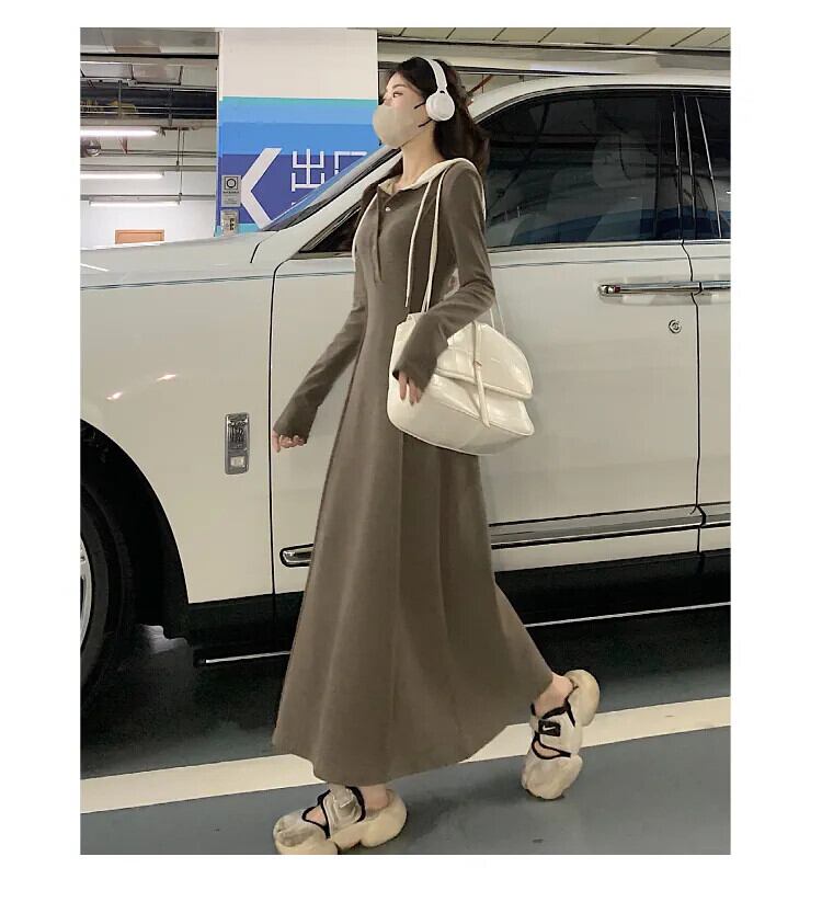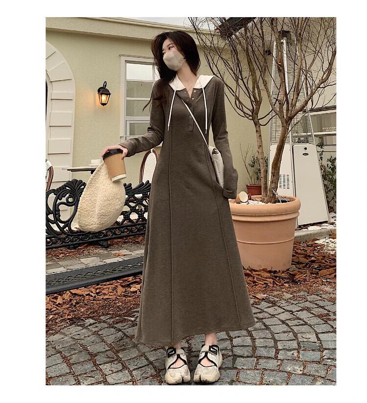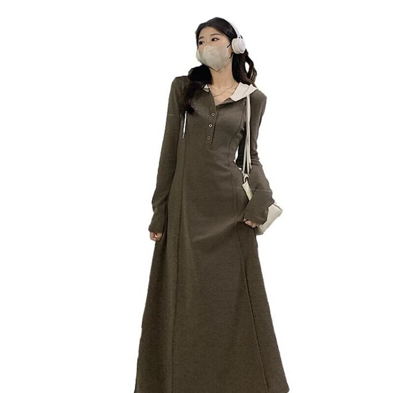 プラスサイズ脂肪フード付き長袖ミッドレングススカート女性 2023 秋の新ウエスト痩身ヒップカバー A ラインドレス ロング 大きめサイズ オータム 秋物 Aライン 8884156743573813