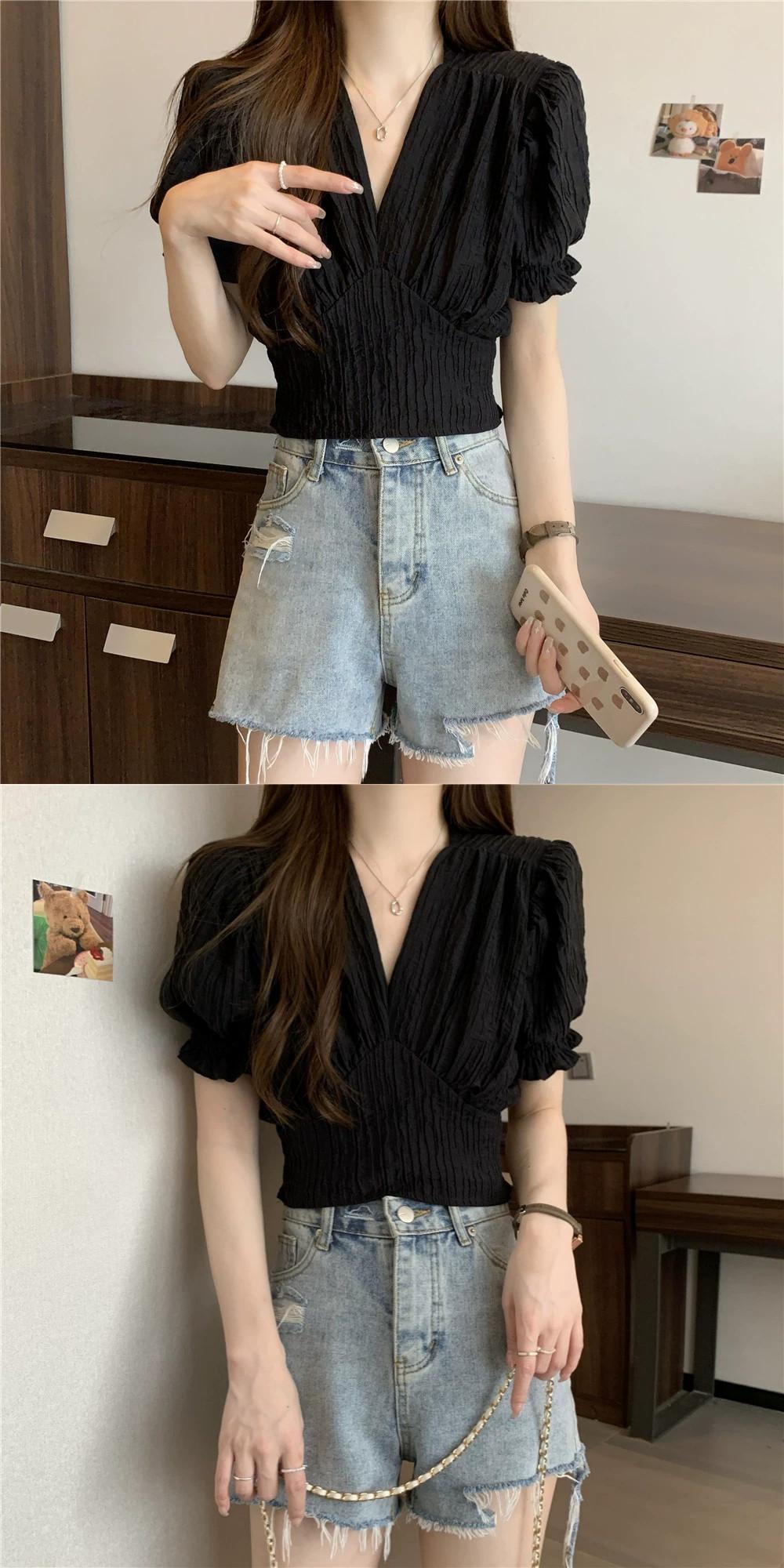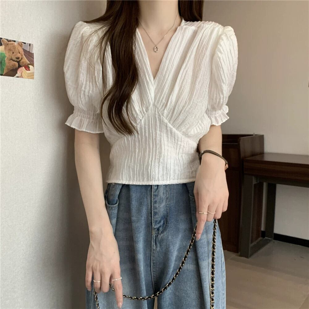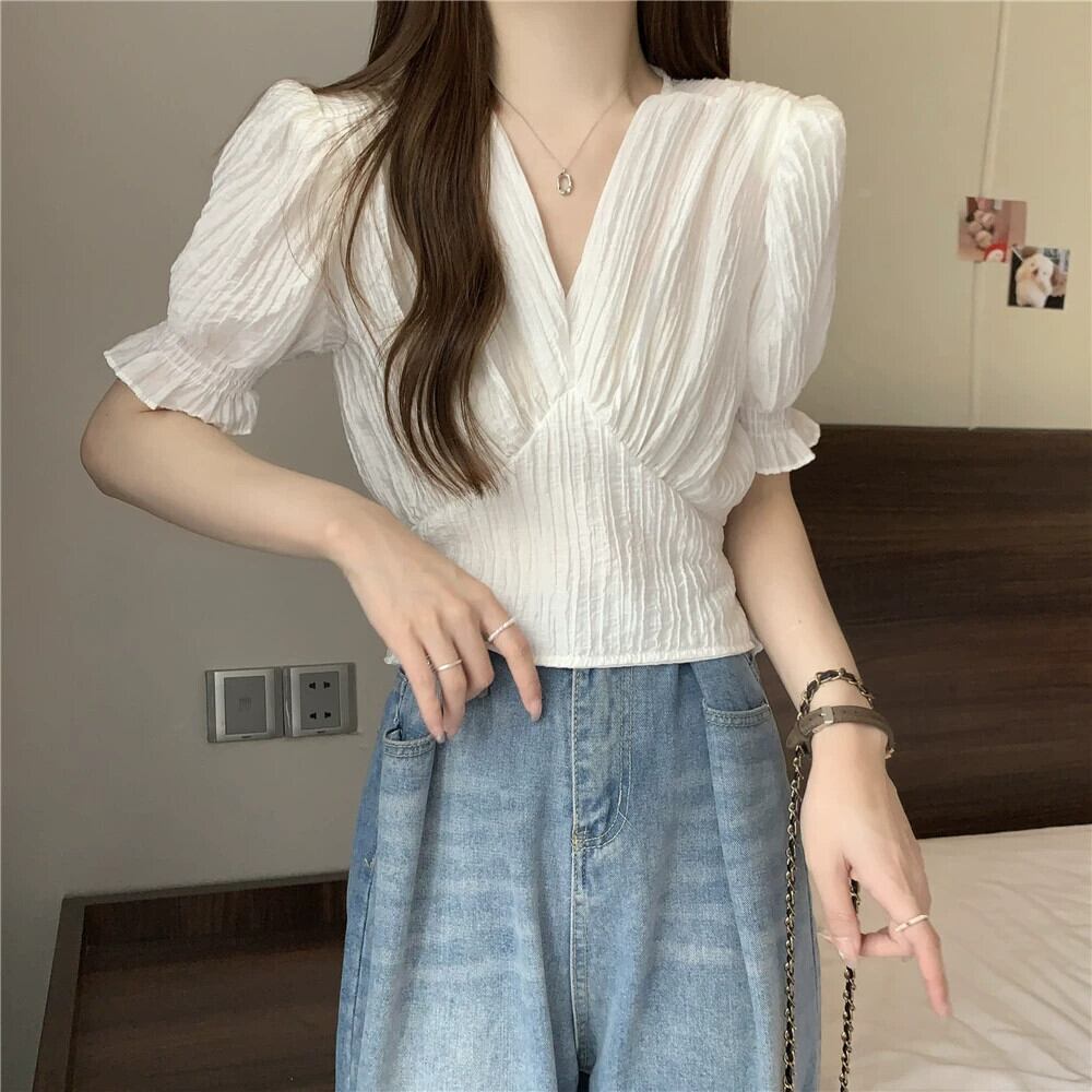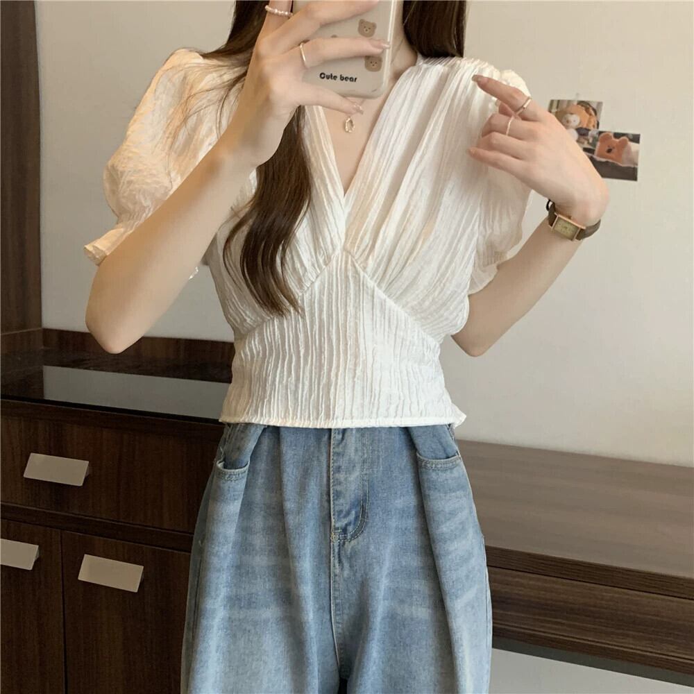 プラスサイズの女性のレトロなフレンチプリーツ V ネックショートトップ夏脂肪痩身気質パフ半袖シャツ 大きめサイズ サマー 夏物 Vネック 8884153945758937