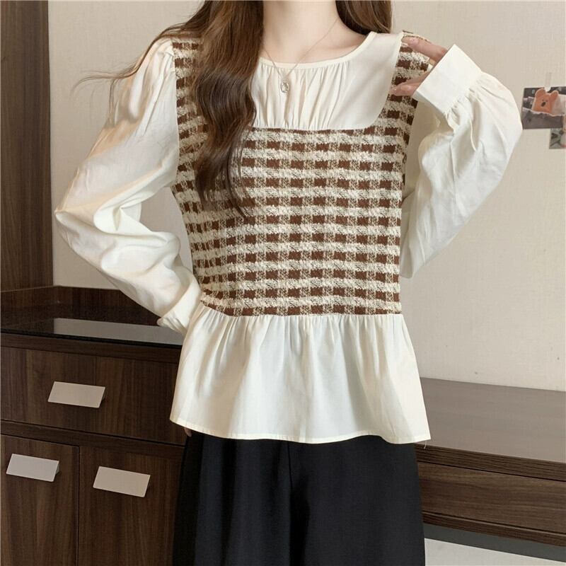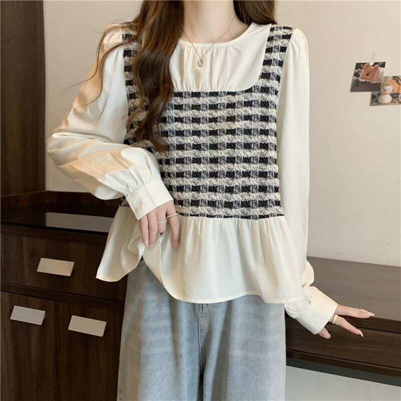 秋のデザインの大きいサイズの偽ツーピースチェック柄長袖シャツ女性、ニッチな脂肪がスリムなトップに見え、ファッショナブルで肉をカバーします ロング 大きめサイズ オータム 秋物 8884160469116329