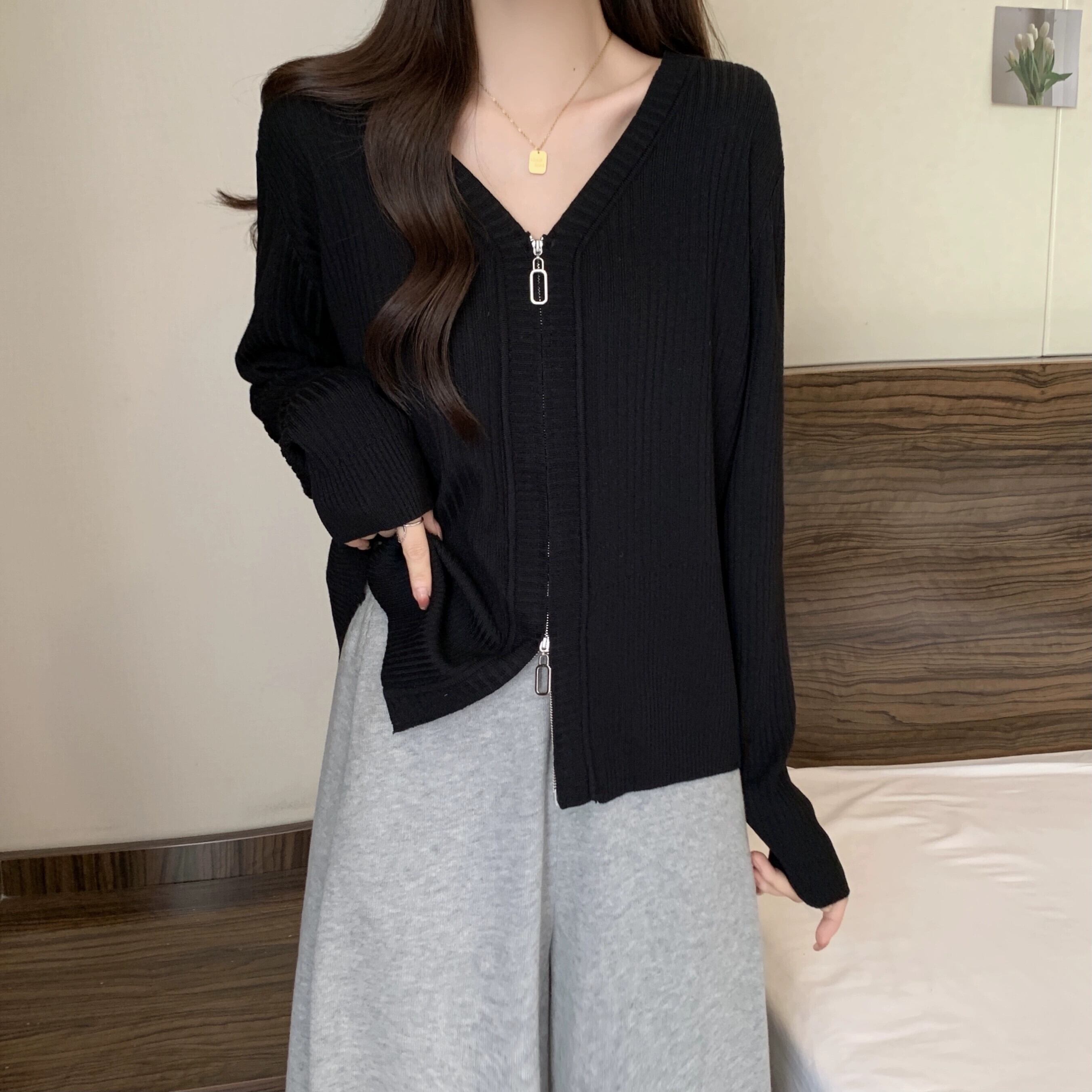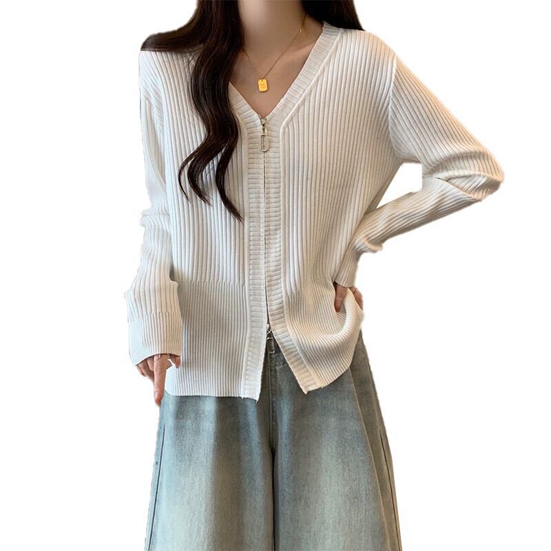 プラスサイズの女性の 2023 秋服ファットカジュアルデザイン V ネックジッパーセーターカーディガン腹カバートップ 大きめサイズ オータム 秋物 Vネック 8884147454834488