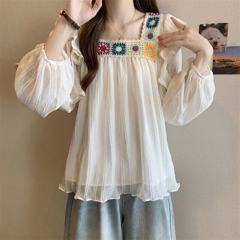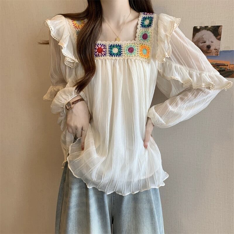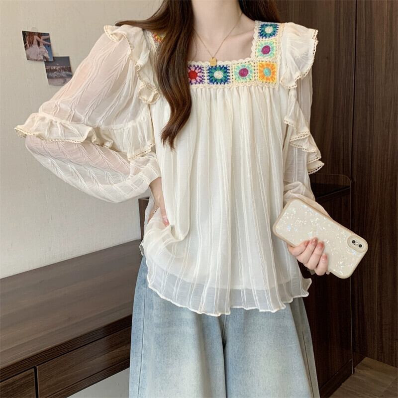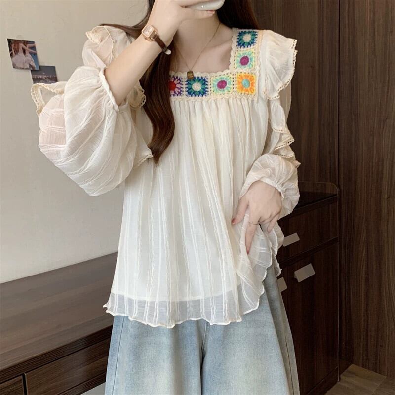 プラスサイズの婦人服 2023 新しい秋の女性の刺繍スクエアカラールーズトップス年齢を軽減する多用途の日焼け防止シャツ レッド 大きめサイズ オータム 秋物 スクウェア 8884172299754230
