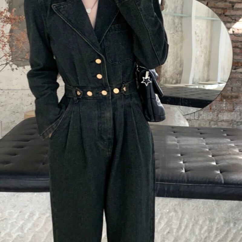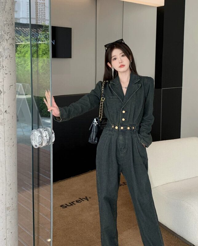 プラスサイズの婦人服 2023 トレンディな秋の新ファットシスターレトロスーツの襟ハイエンドのズボン作業服デニムジャンプスーツ 大きめサイズ オータム 秋物 8884172752995763