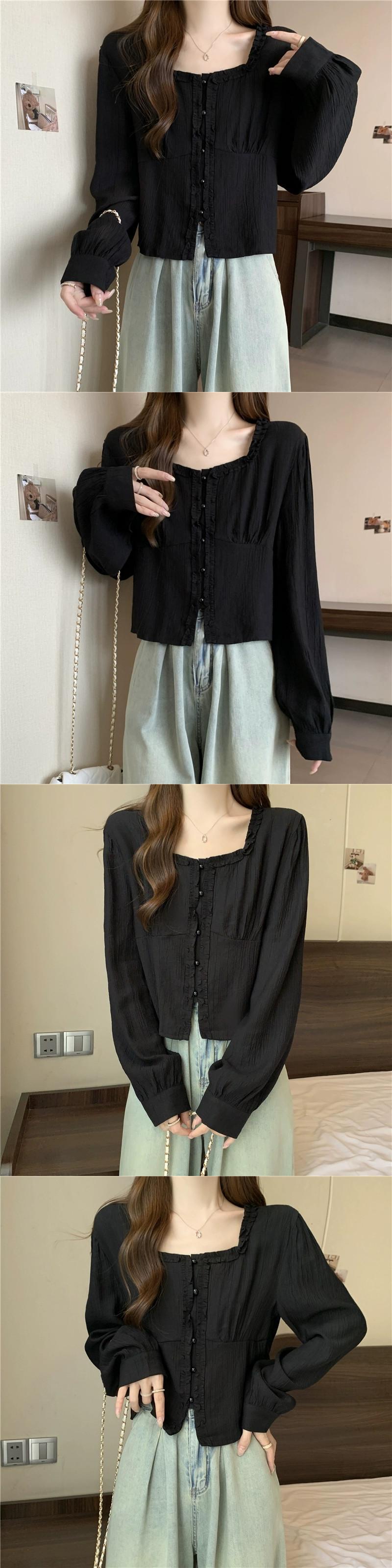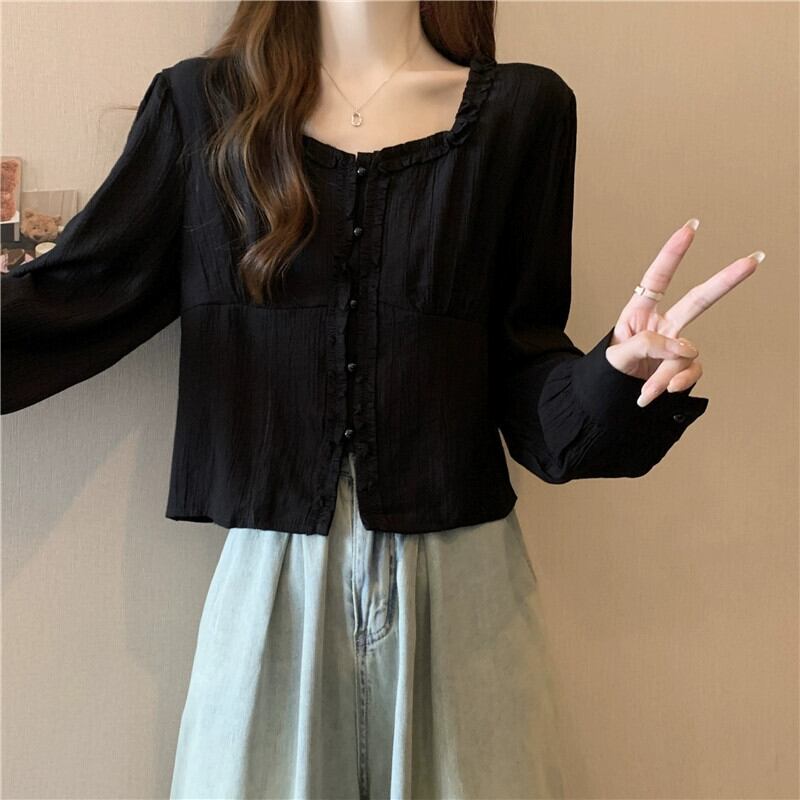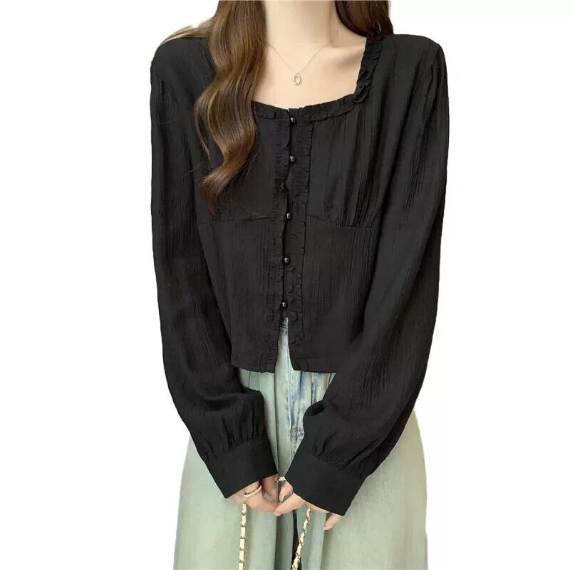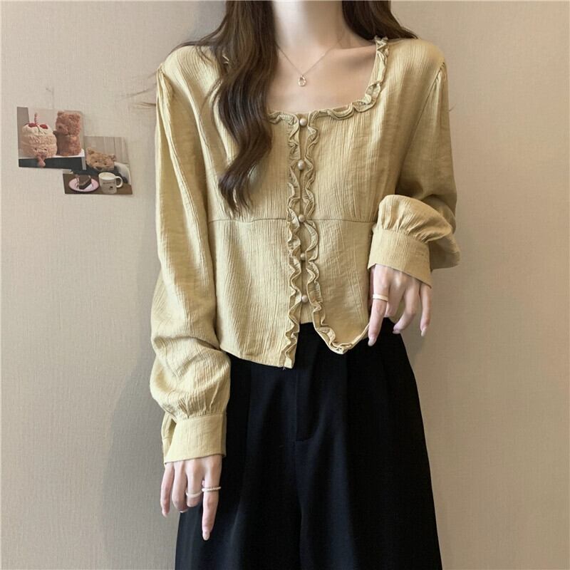 プラスサイズの婦人服 2023 ファットシスター秋の新スタイルのスクエアカラーレースシャツ多用途長袖スリムシャツトップ ロング 大きめサイズ オータム 秋物 スクウェア 8884110148407423