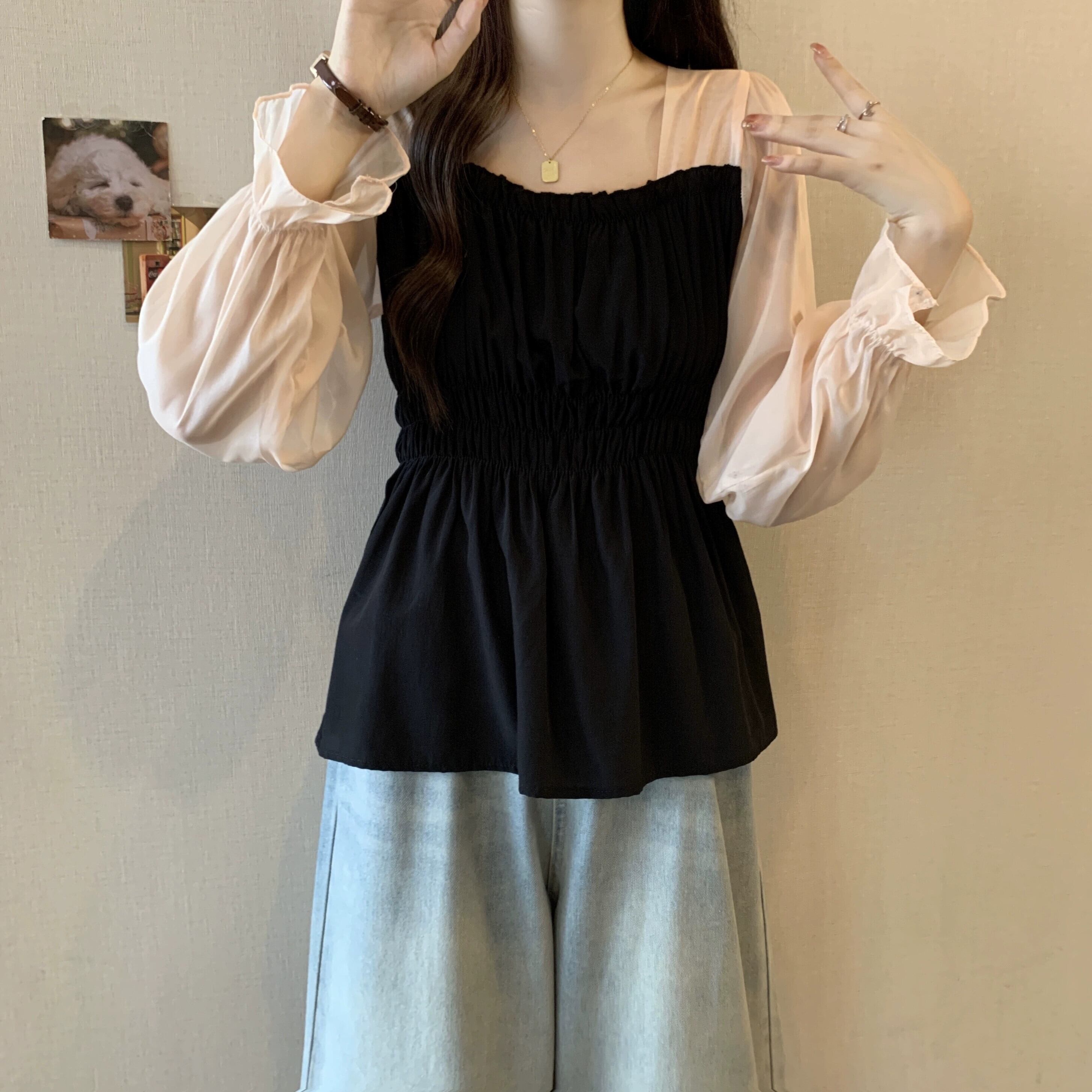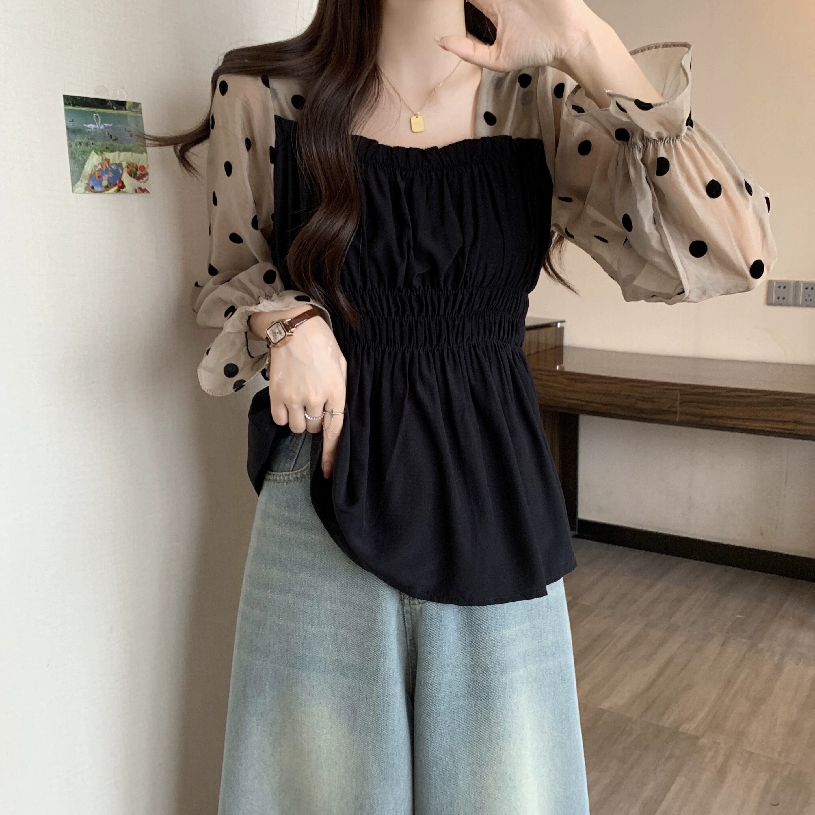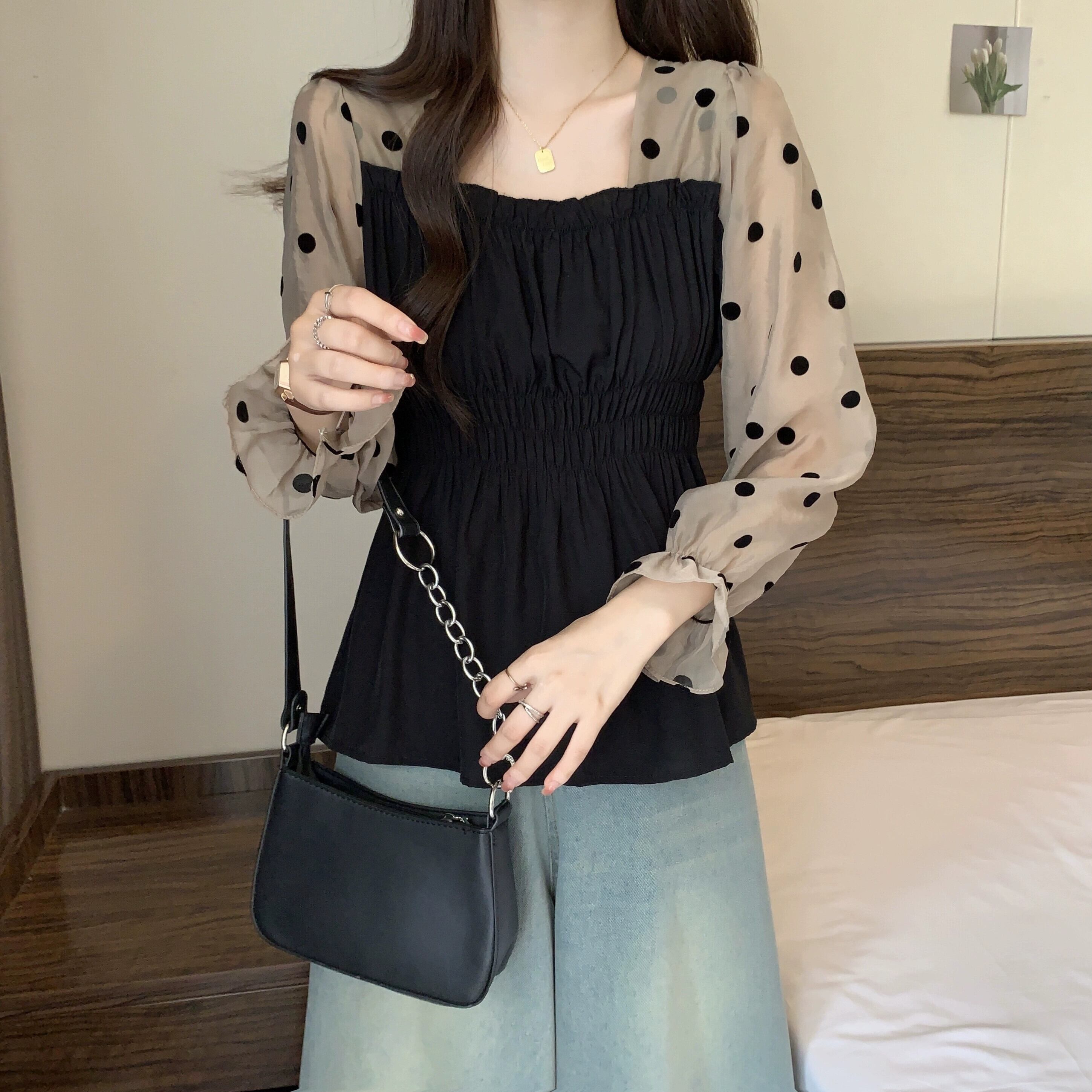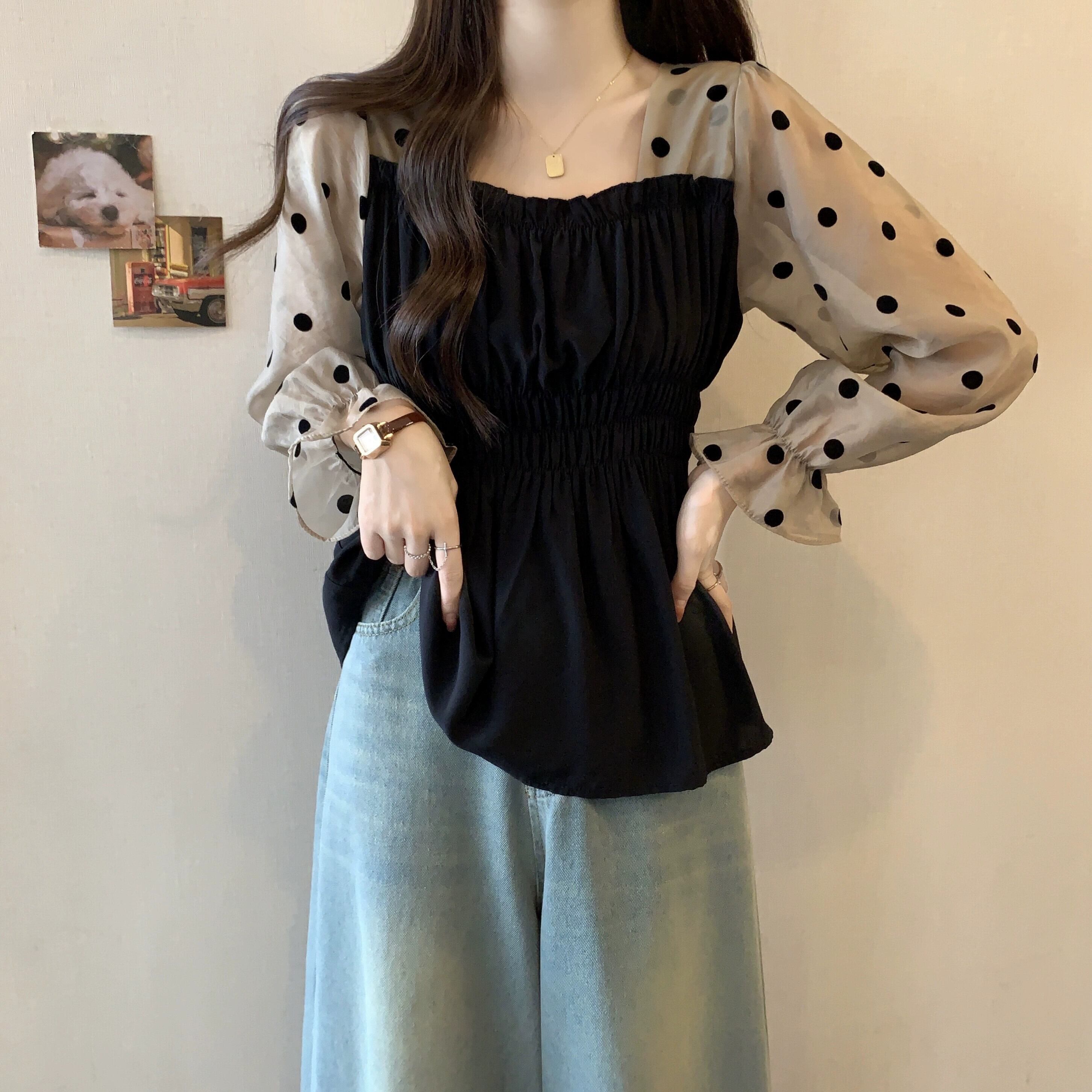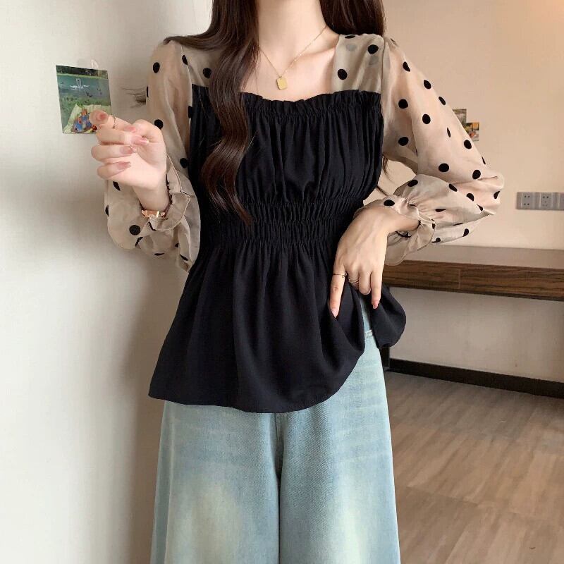 大きいサイズ偽ツーピース長袖水玉シャツ女性秋 2023 新しい脂肪 mm 痩身多用途フレンチスクエアカラートップ ロング 大きめサイズ オータム 秋物 スクウェア 888412687881082