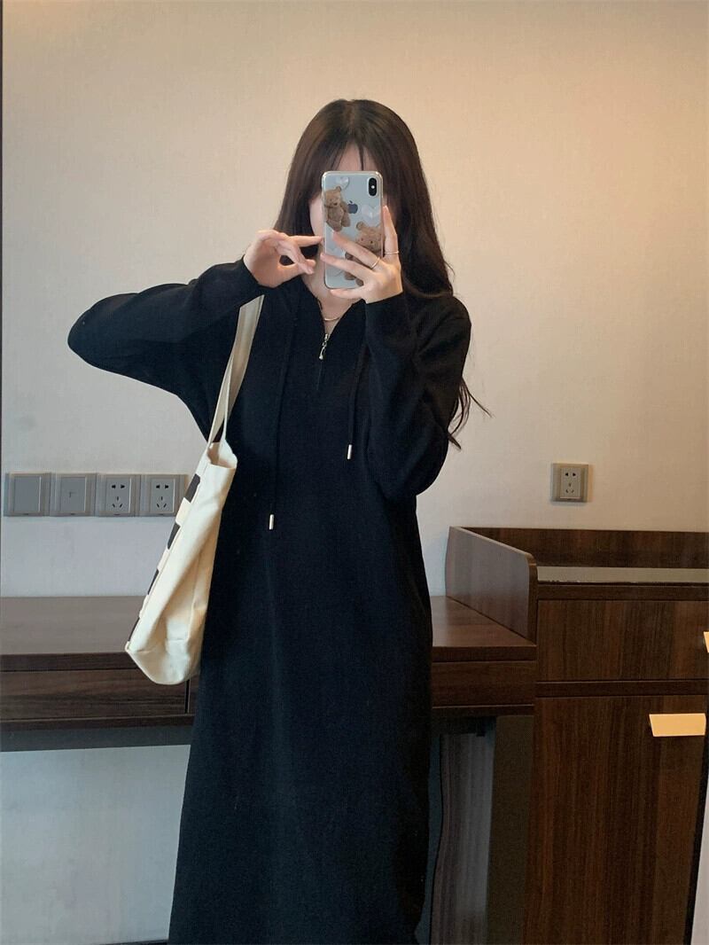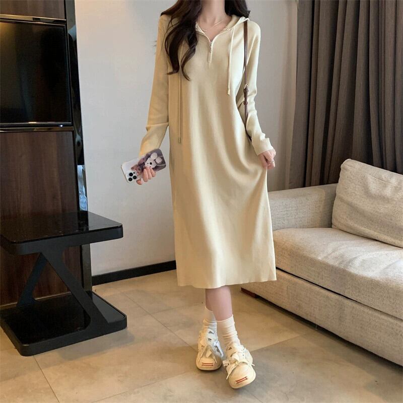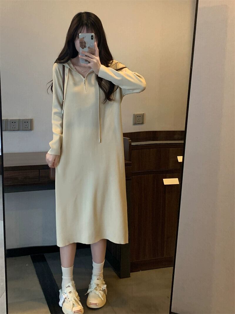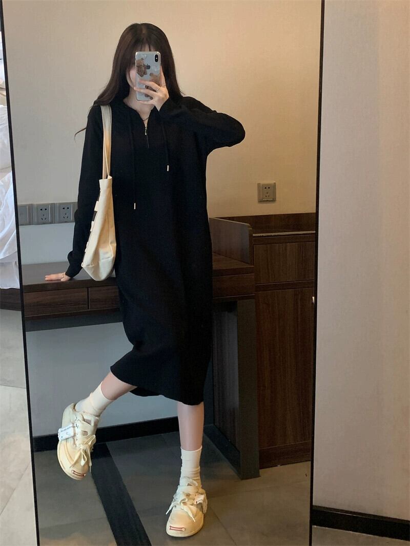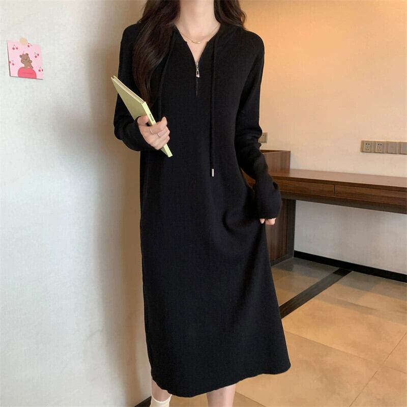 プラスサイズの婦人服 2023 トレンディな秋の新ファットシスターフード付きミッドレングススカートニッチスタイルインナー底ニットドレス 大きめサイズ オータム 秋物 8884110903561393