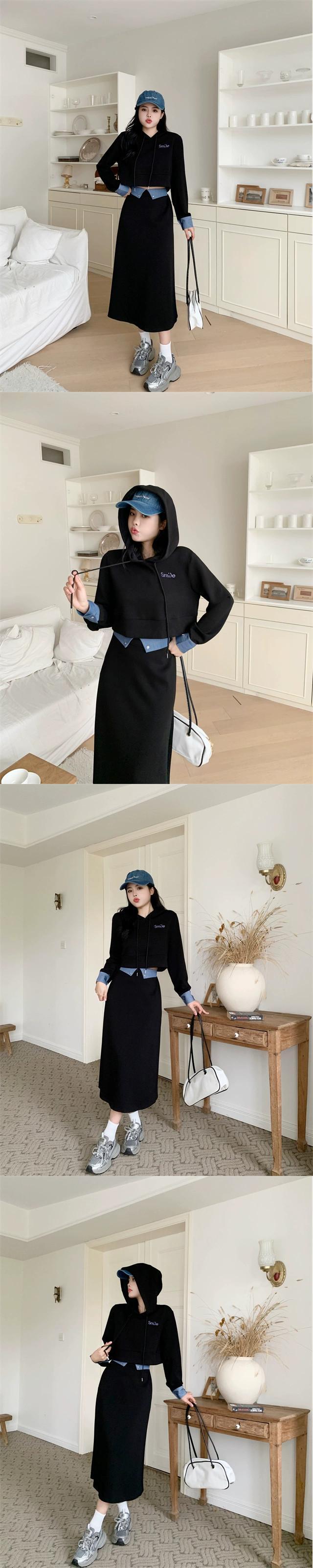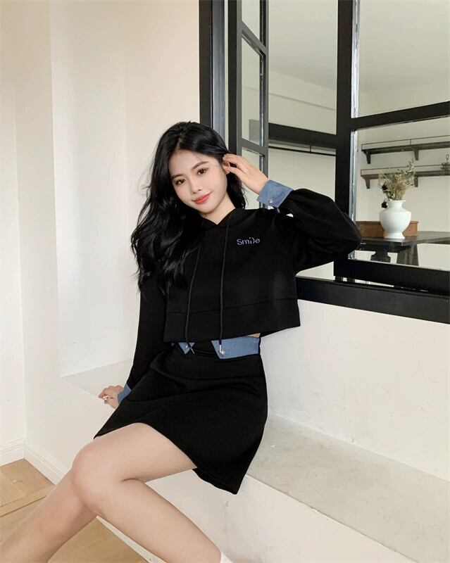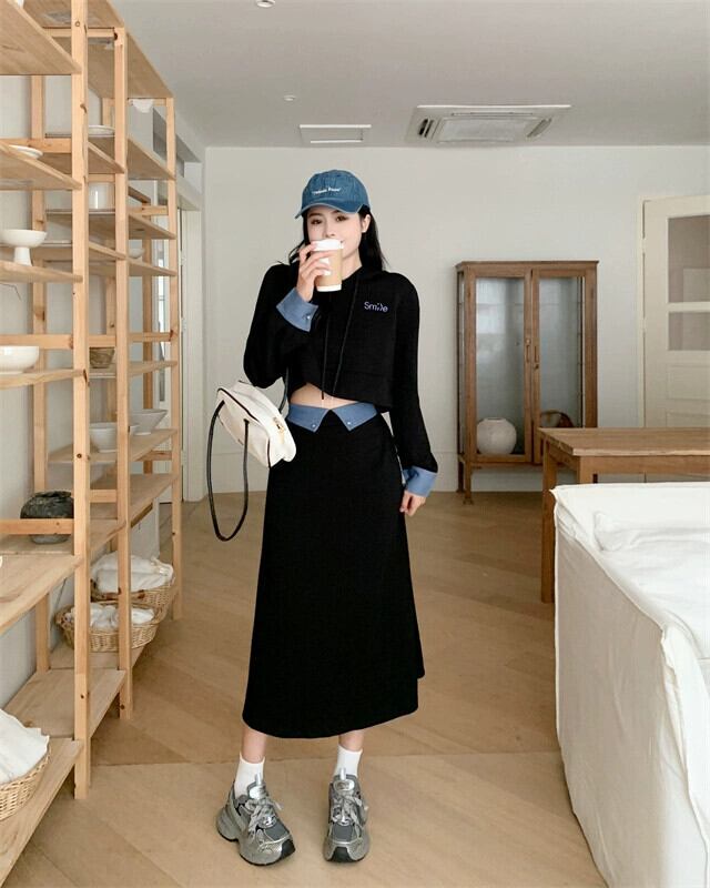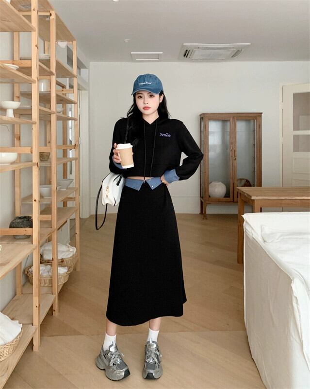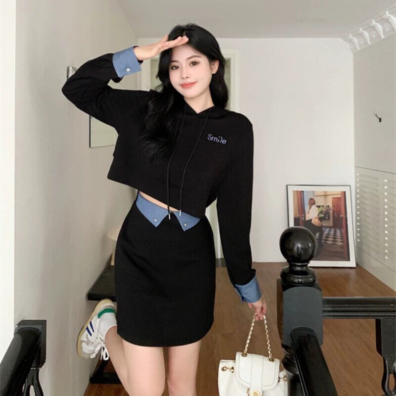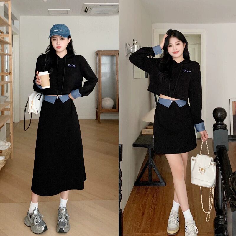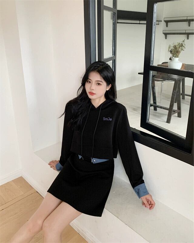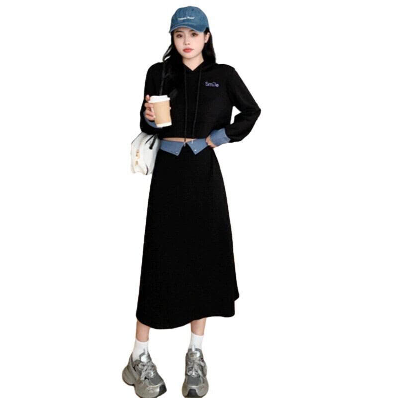 プラスサイズの女性の黒の脂肪痩身スーツ脂肪ミリメートルショートフード付きスウェットシャツスカート秋の服装と完全なセット ブラック 大きめサイズ オータム 秋物 8884196277617946