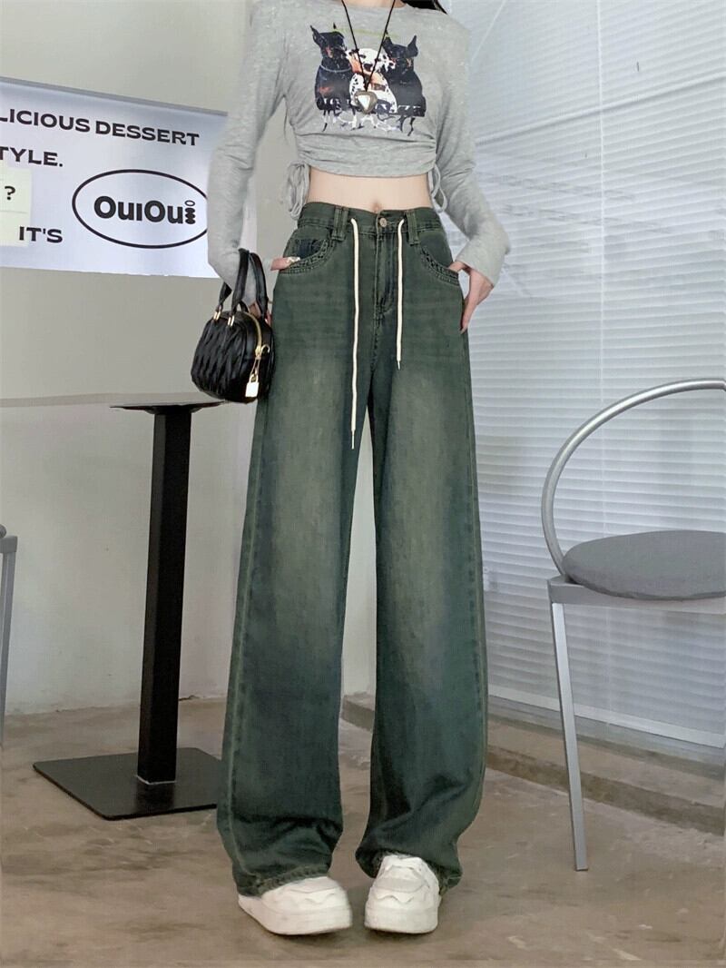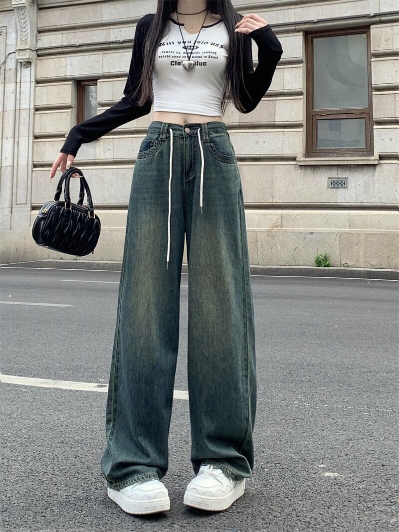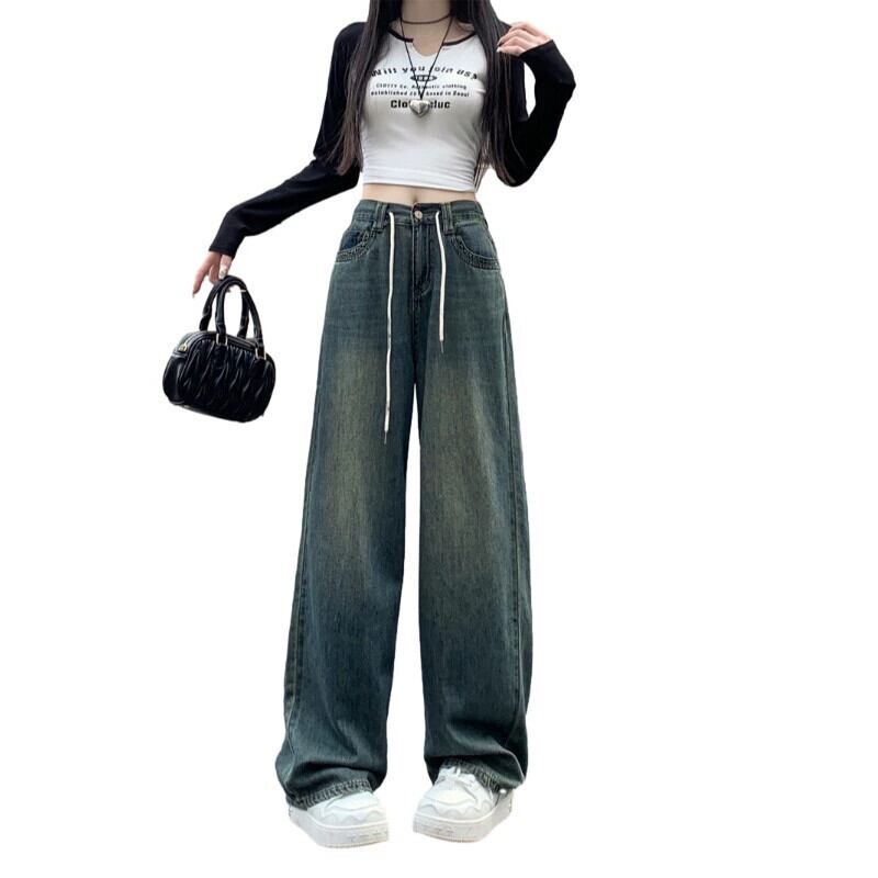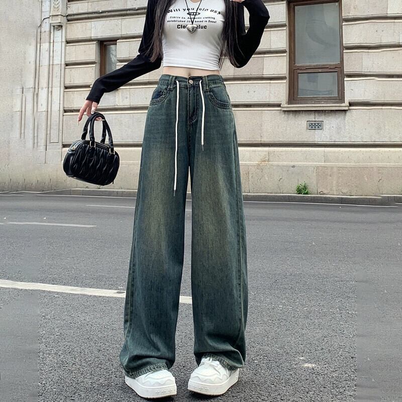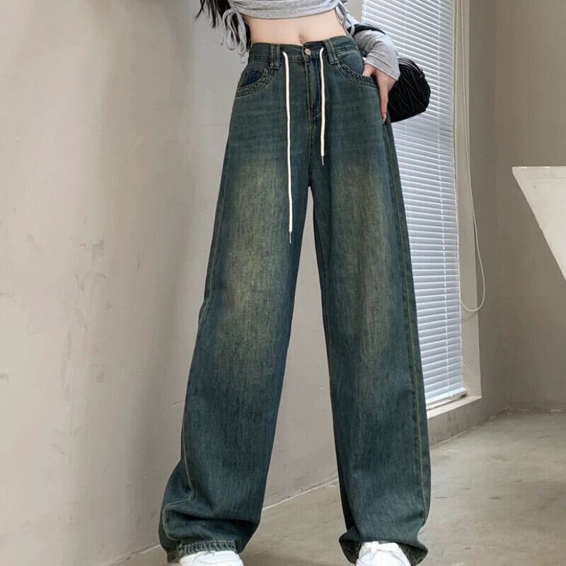 大きいサイズのレトロな弾性ウエストジーンズフランスのハイストリート秋2023新しい女性のファットmmルーズワイドレッグパンツ エラスティック 伸縮 大きめサイズ オータム 秋物 ワイドパンツ 8884175931494437