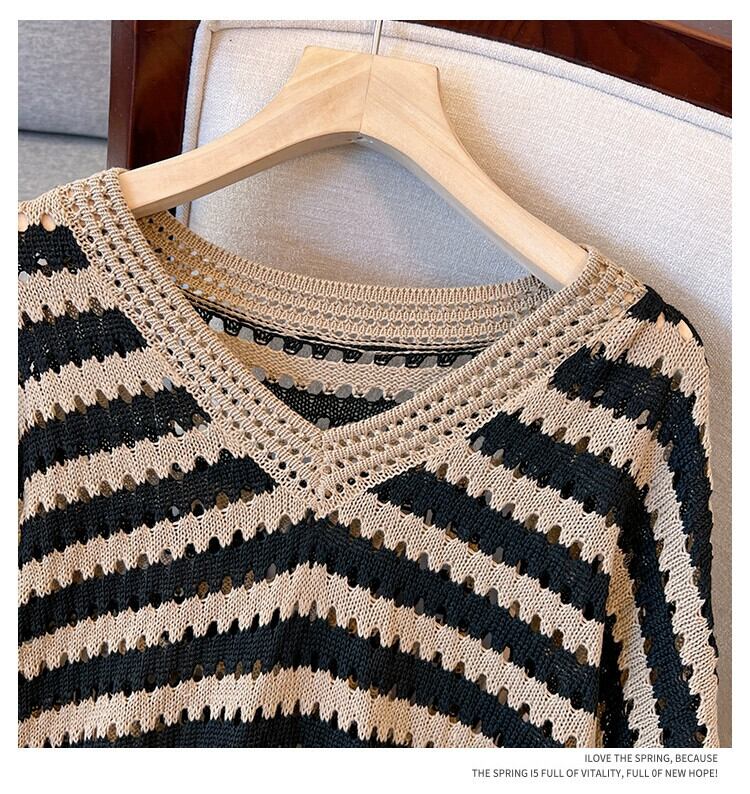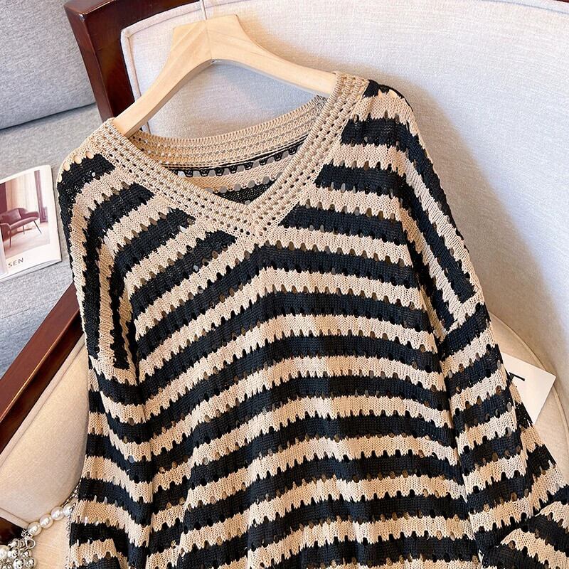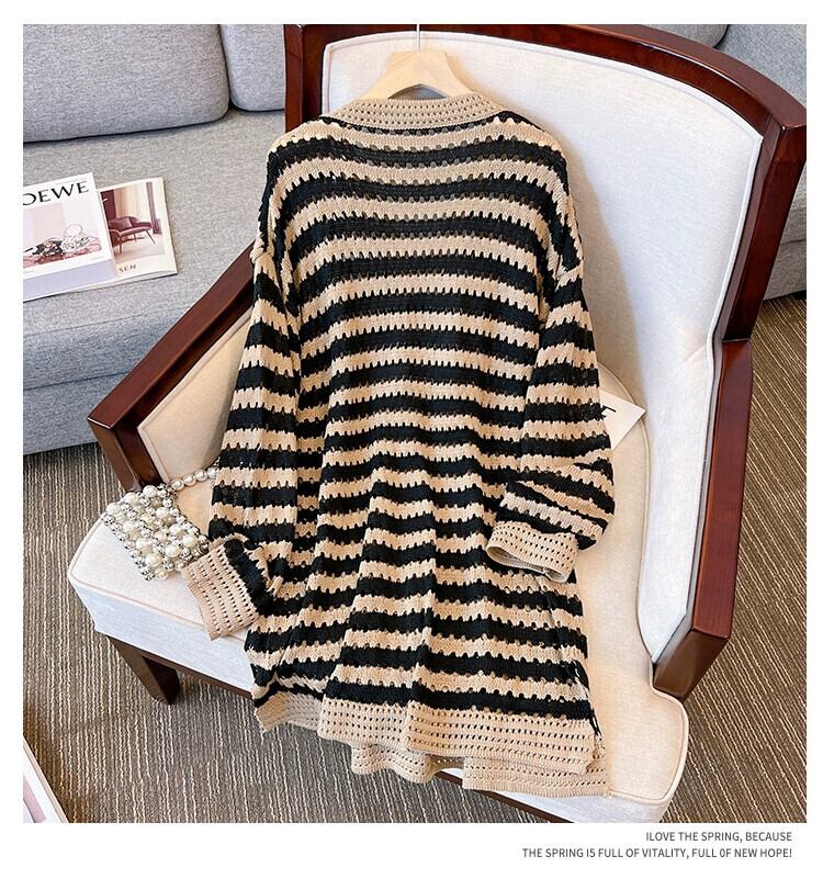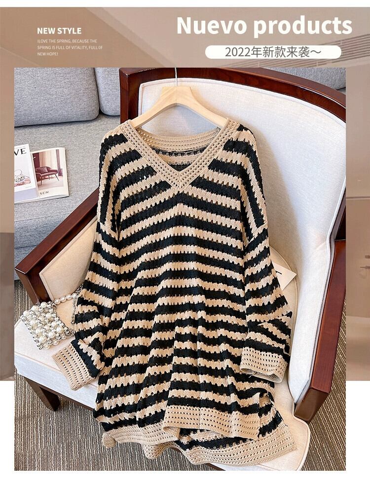 プラスサイズの女性の 2023 秋の新ファットシスター V ネックストライプドレス痩身ルーズセーターセータースカート 大きめサイズ オータム 秋物 Vネック 8884193971123035