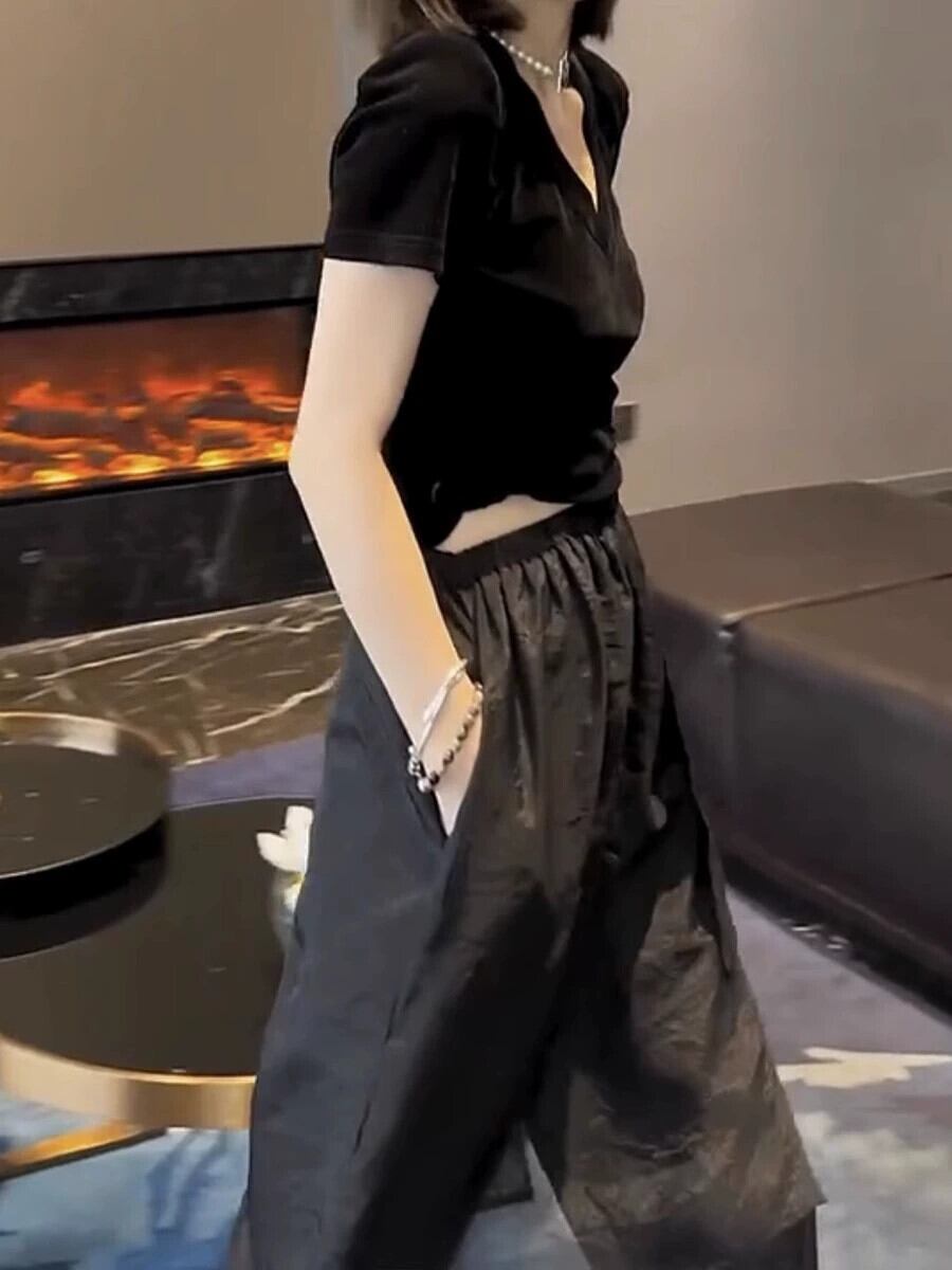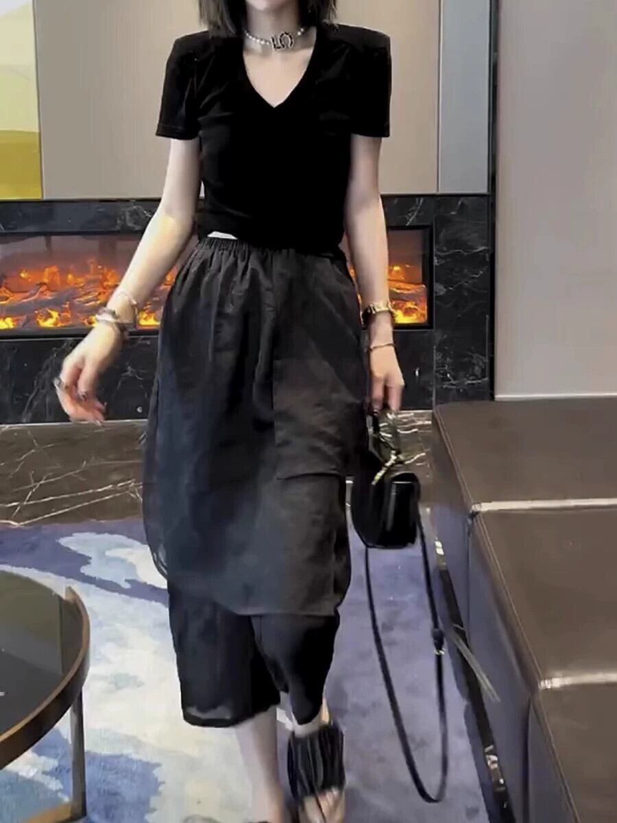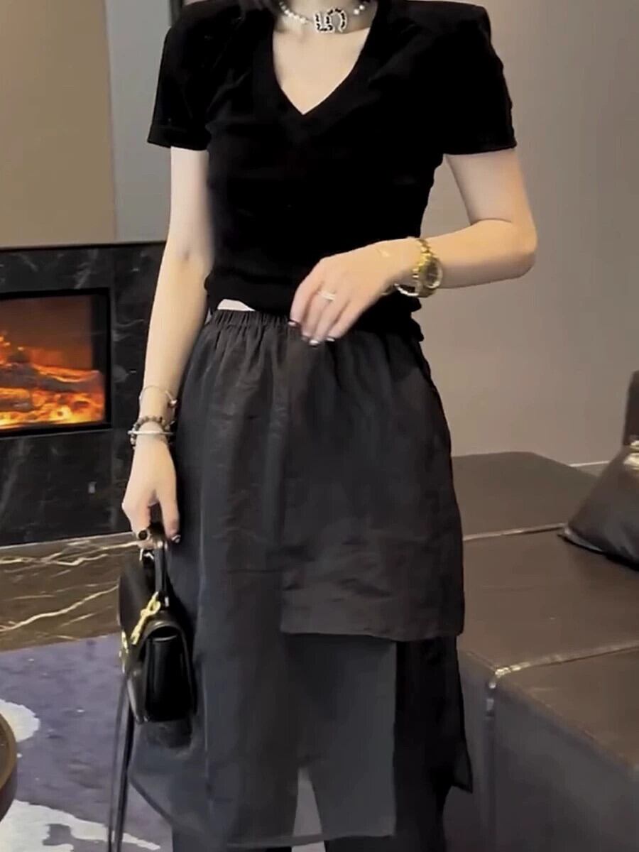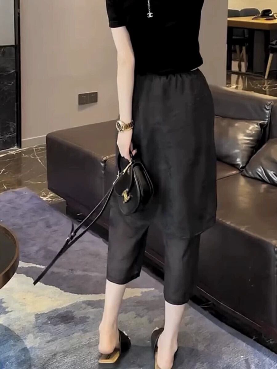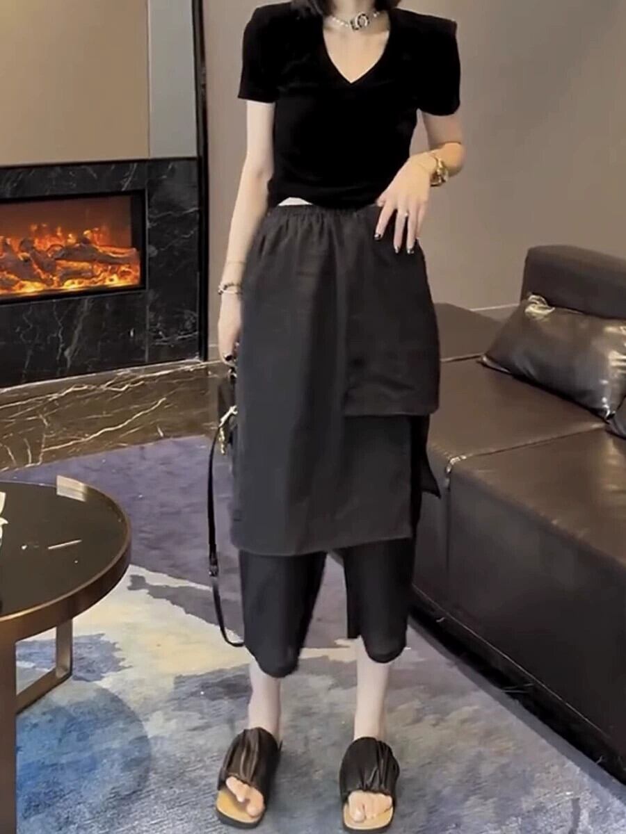 プラスサイズの婦人服ニッチ洋ナシ型ボディウェアデザインセンス8点フェイクツーピースシフォンカジュアルパンツスプライスキュロット 大きめサイズ 8884156553655414