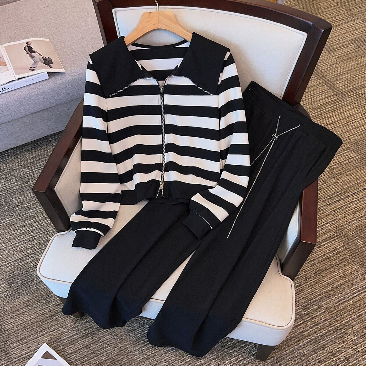 プラスサイズの婦人服 2023 流行の秋の新しいファットシスターファッショナブルな多目的スーツハイエンドスウェットシャツワイドレッグパンツツーピーススーツ 大きめサイズ オータム 秋物 8884187741417230