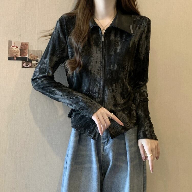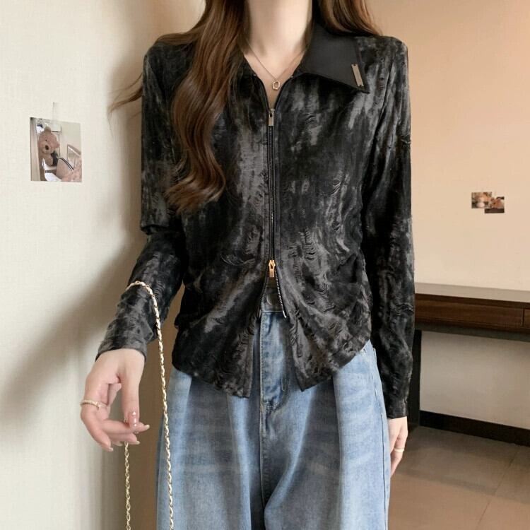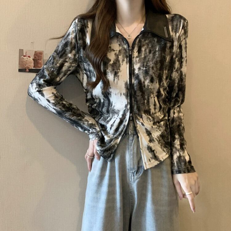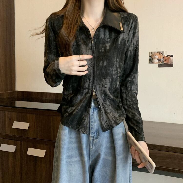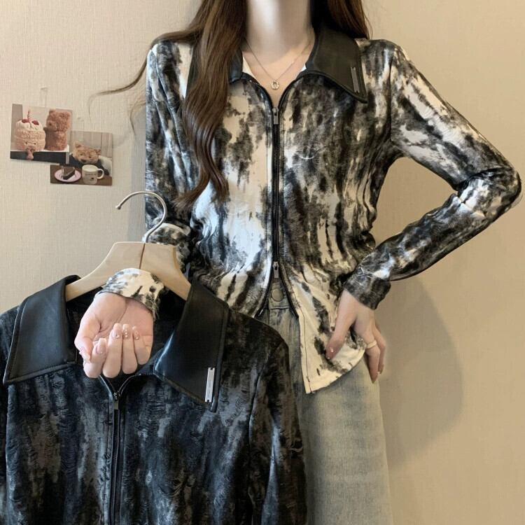 プラスサイズの婦人服 2023 ファットシスター秋服新レトロスプライシングレザー襟ダブルジッパー絞り染め長袖カーディガントップ ロング 大きめサイズ オータム 秋物 8884191935994628