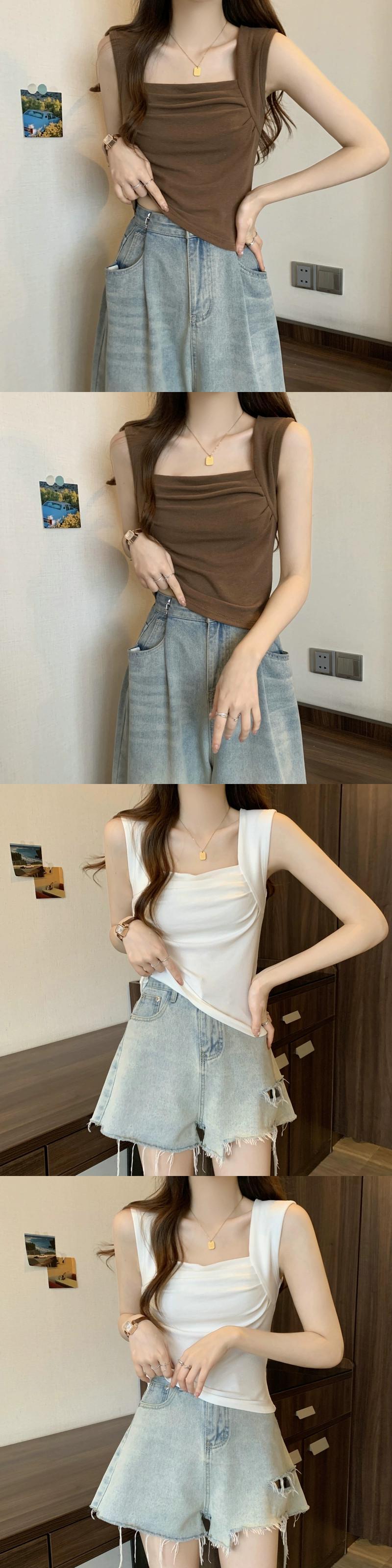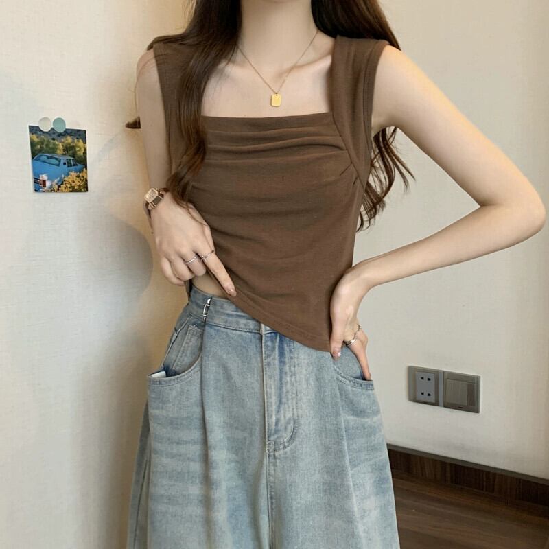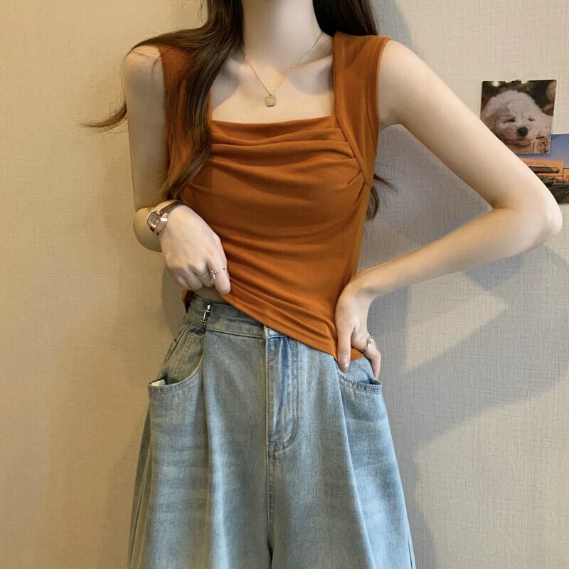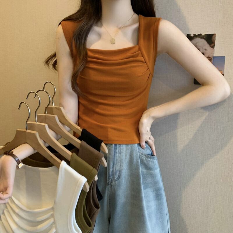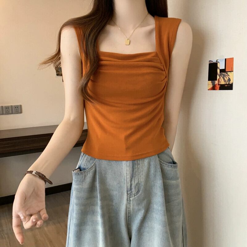 プラスサイズの女性の夏プリーツデザインスクエアネックタンクトップ、甘くてスパイシーなスタイルのアウターウェアスリムショートノースリーブトップ 半袖 ハーフスリーブ 大きめサイズ 大人ガーリー スウィート キュート カジュアル サマー 夏物 スクウェア 888411928497328
