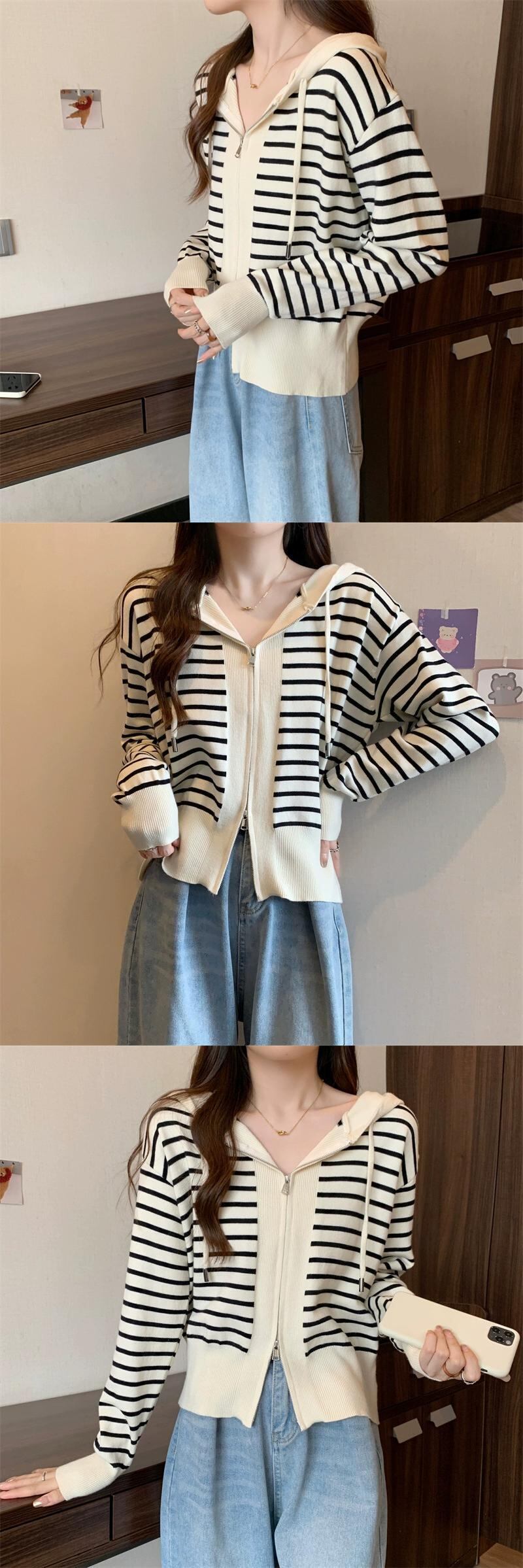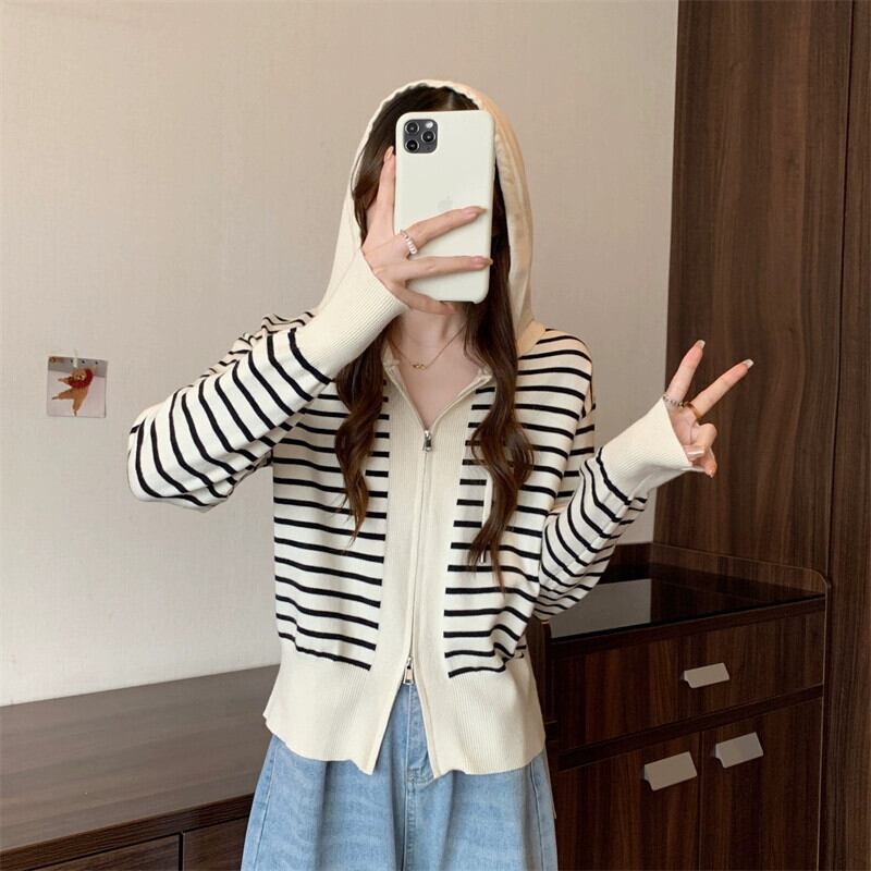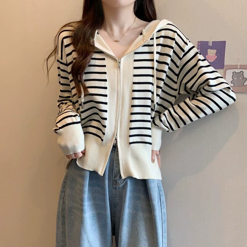 プラスサイズの女性の 2023 ファットシスター秋スタイルコントラストストライプニットパーカールーズダブルジッパーセータージャケット 大きめサイズ オータム 秋物 8884172236354664