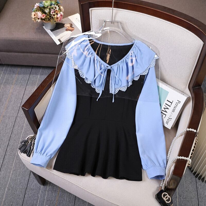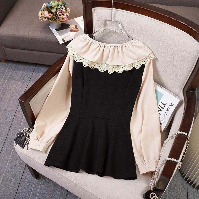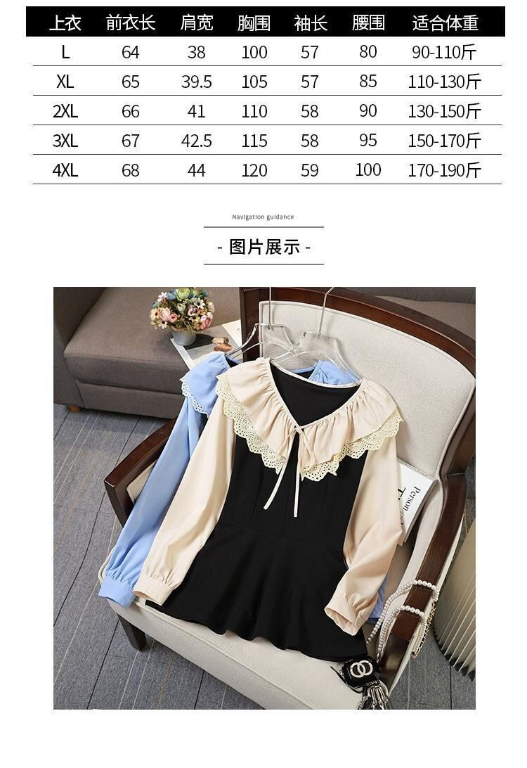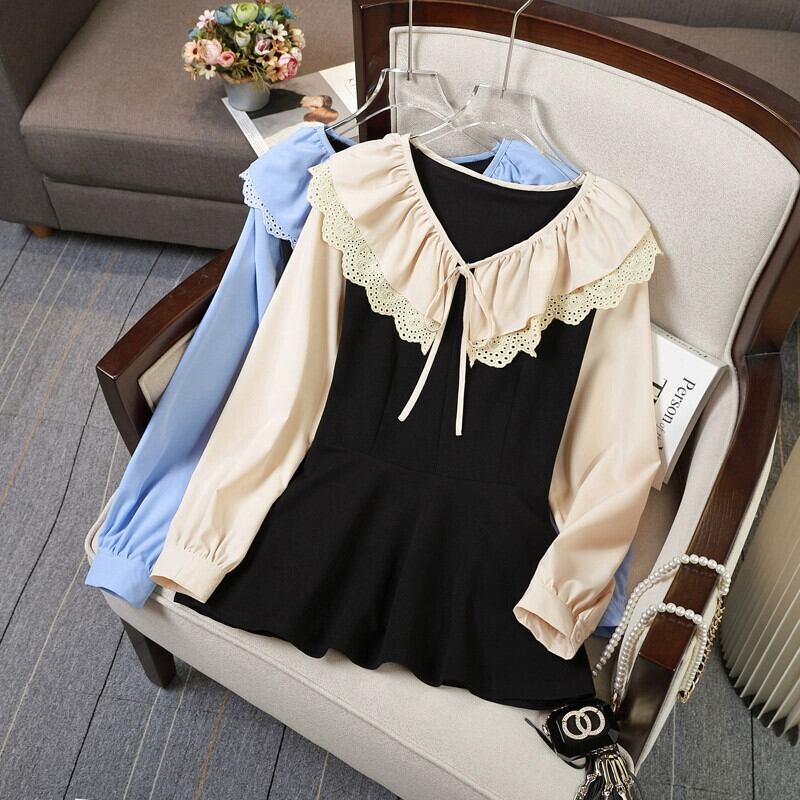 プラスサイズの婦人服 2023 脂肪姉妹秋服新スタイルファッショナブルな甘い人形襟レースフレンチ長袖シャツ ロング 大きめサイズ 大人ガーリー スウィート キュート カジュアル オータム 秋物 8884155917140163