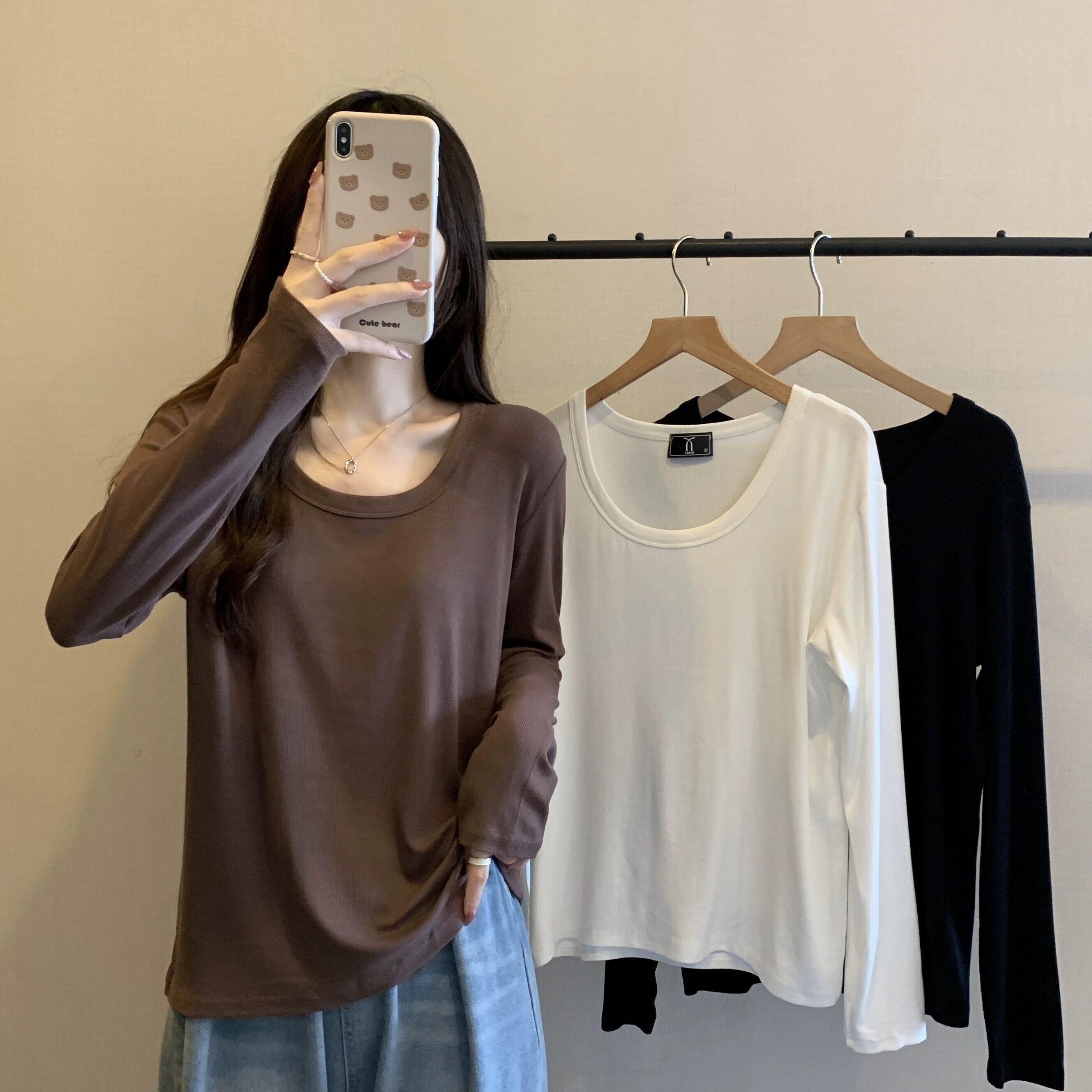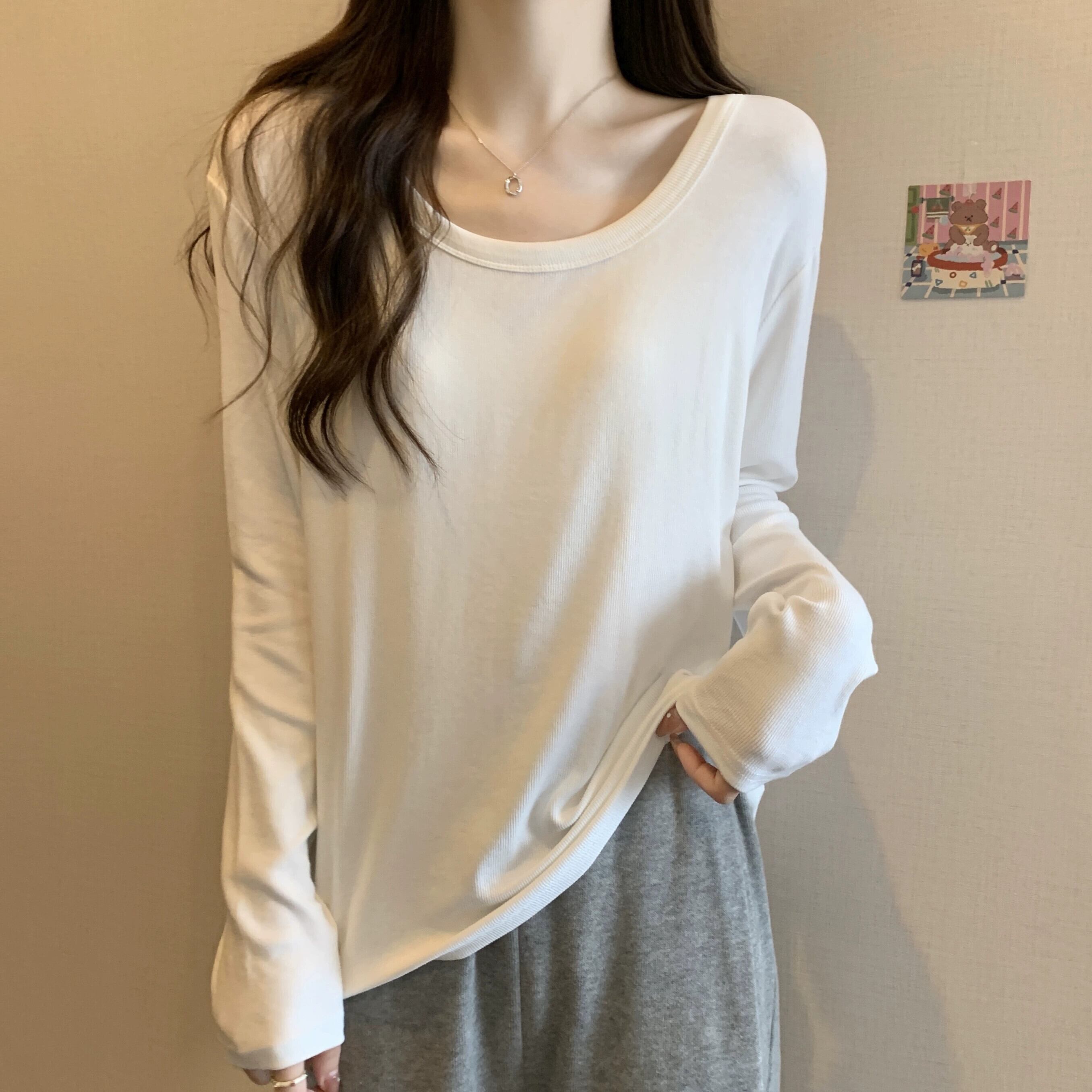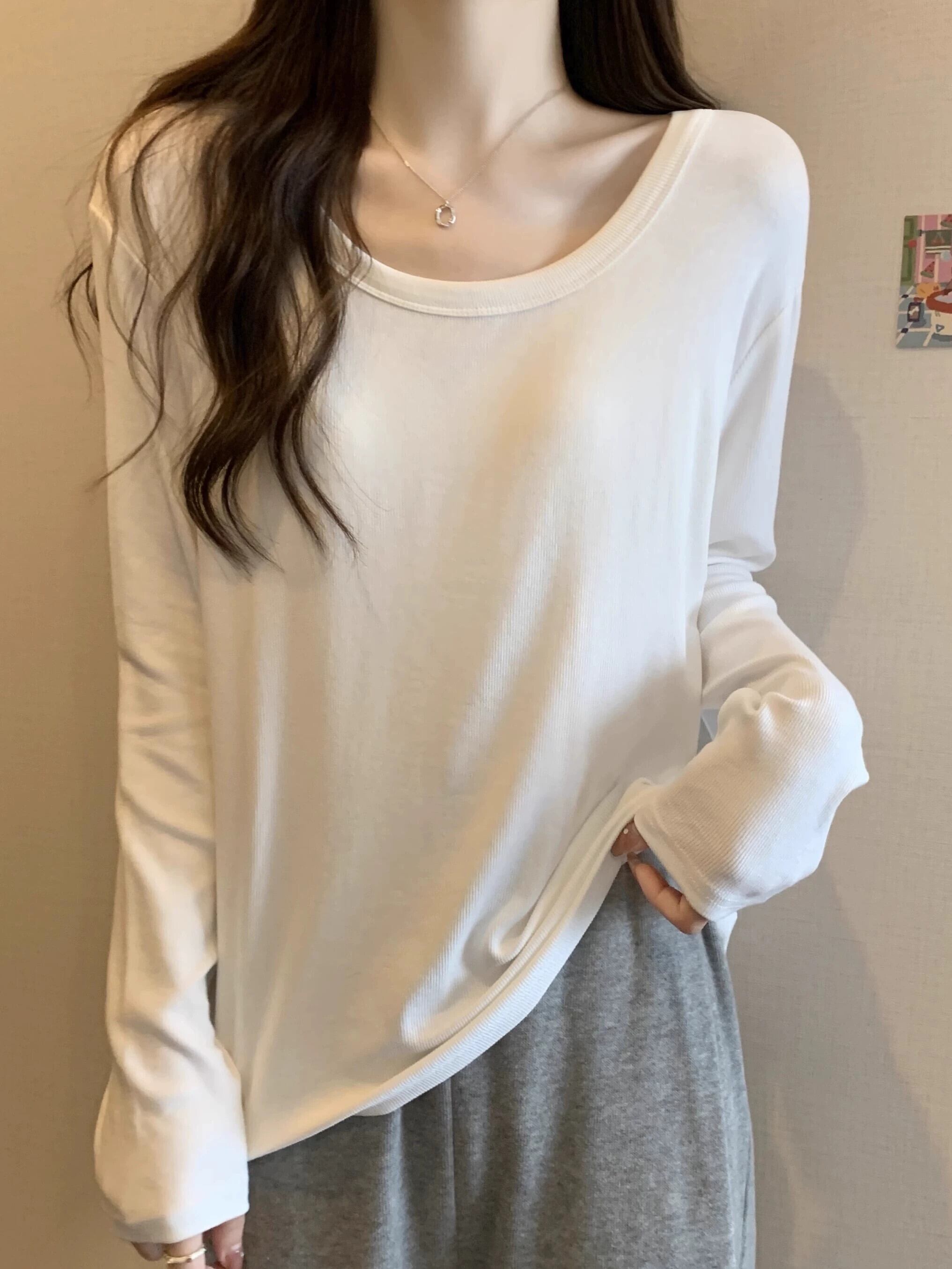 大きいサイズの右肩 U ネックスリム長袖 Tシャツ女性 2023 女性の新しい秋のルーズで多用途な無地ボトリングシャツ ロング 大きめサイズ オータム 秋物 ソリッドカラー 8884163595935805