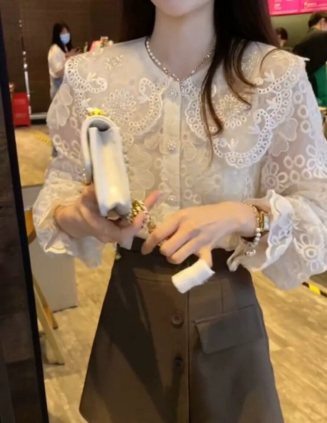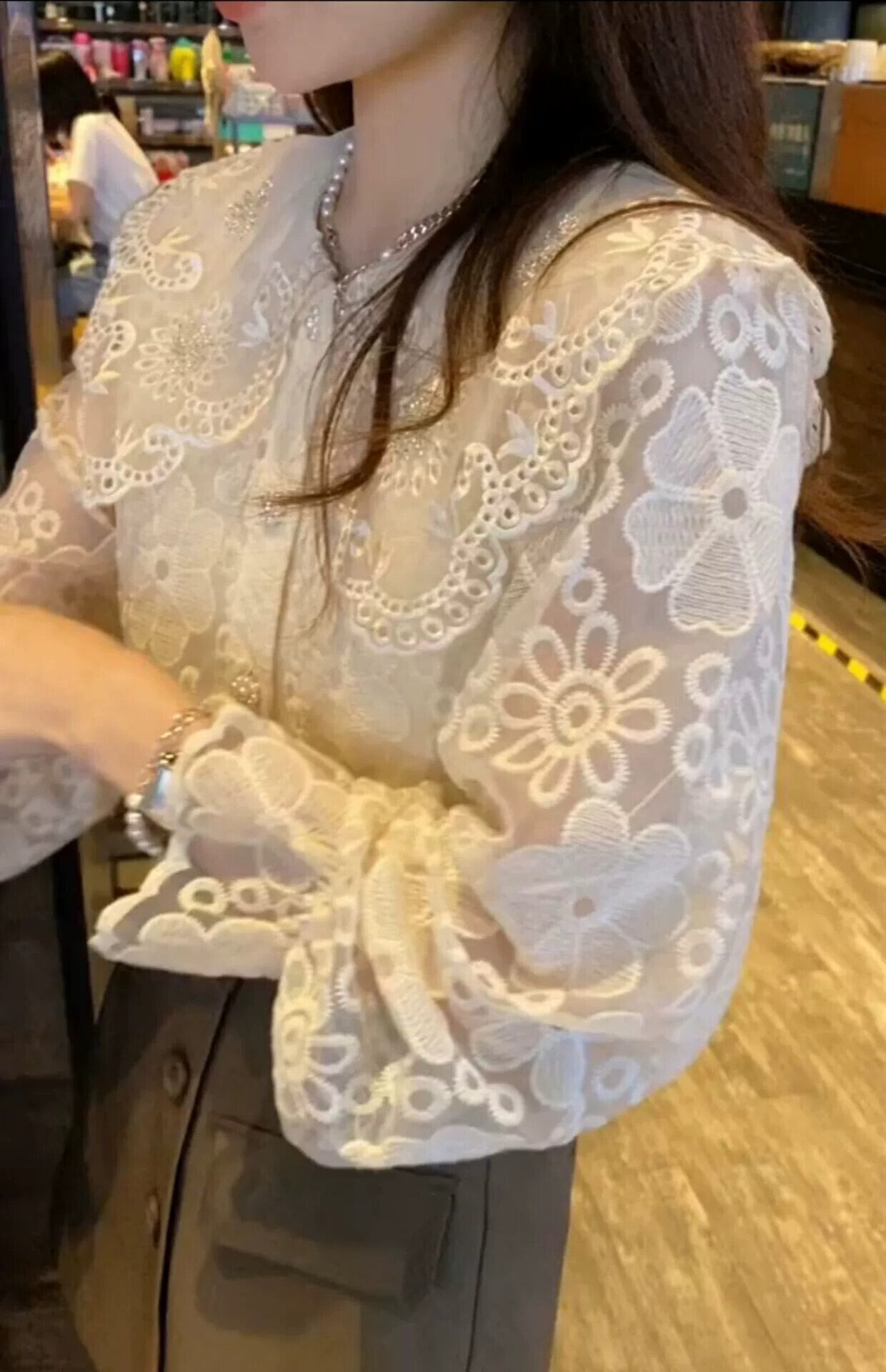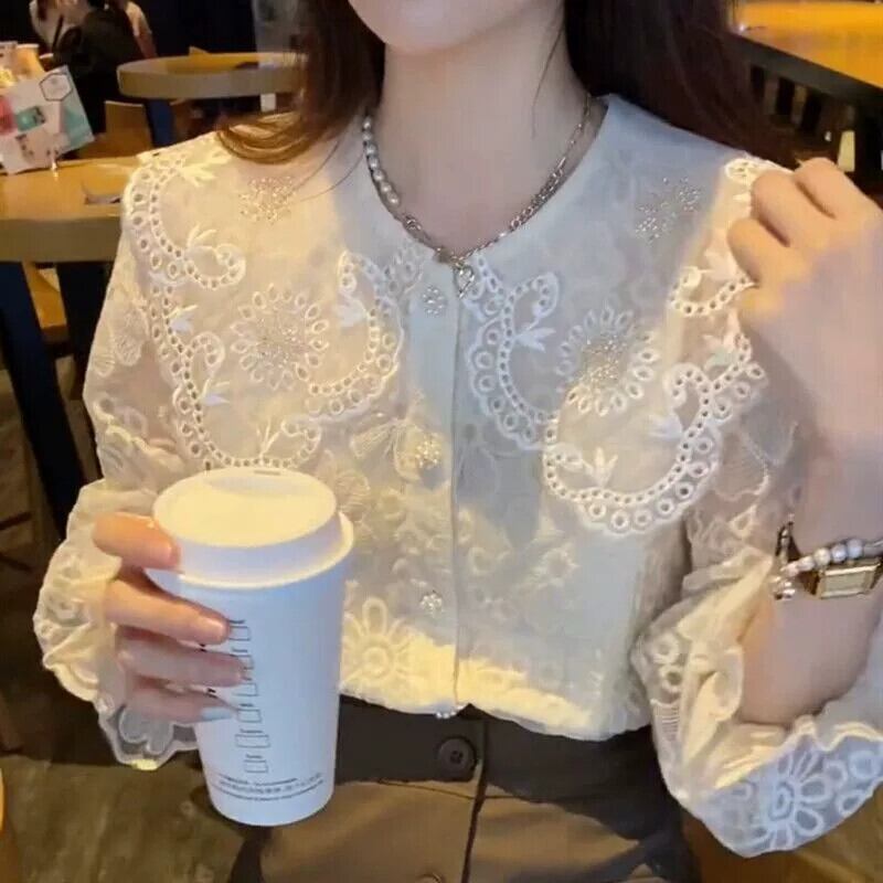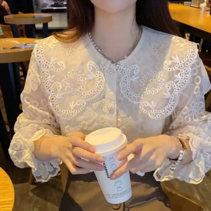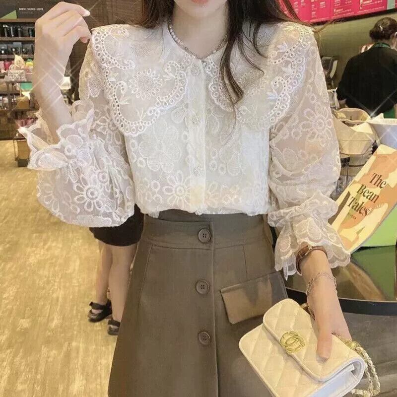 プラスサイズの婦人服 2023 春と秋のフランスひまわりレース底シャツシックなトップ人形襟レトロシャツトレンディ 大きめサイズ スプリング 春物 オータム 秋物 フラワーデザイン 8884173859620996