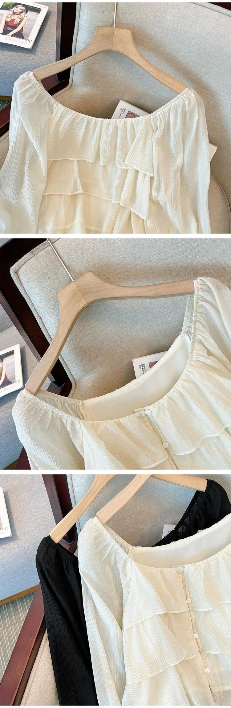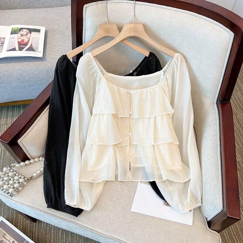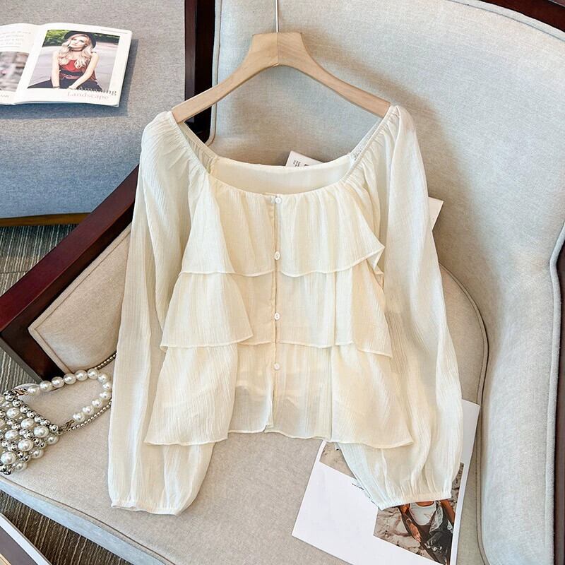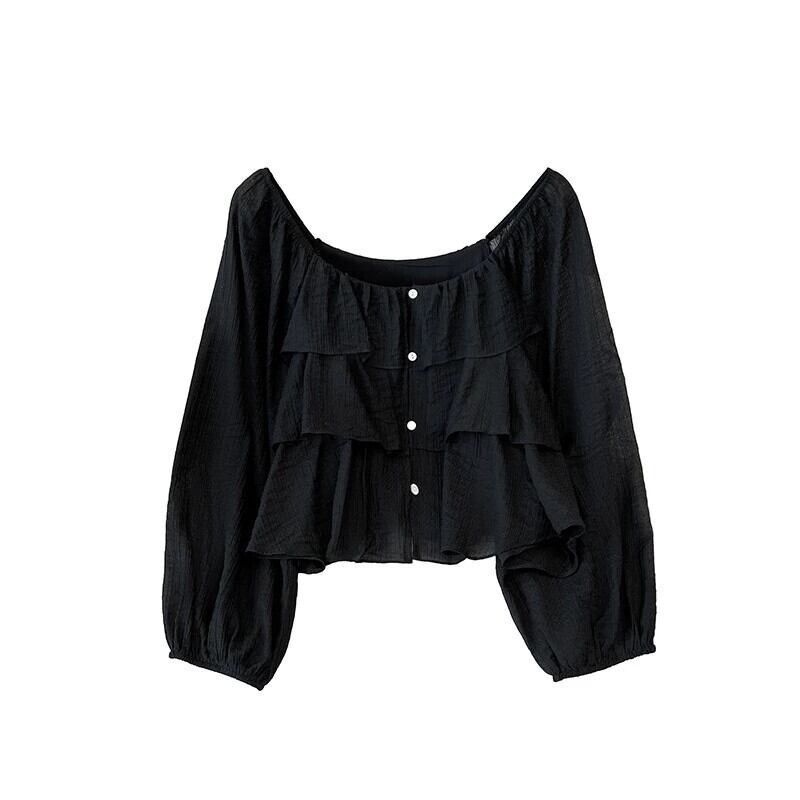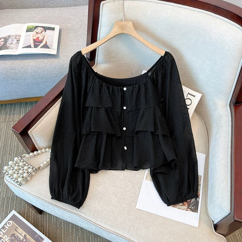 プラスサイズの婦人服 2023 トレンディな秋の新脂肪デザインフリルトップパフスリーブルーズ気質シャツ 大きめサイズ オータム 秋物 8884151035935761
