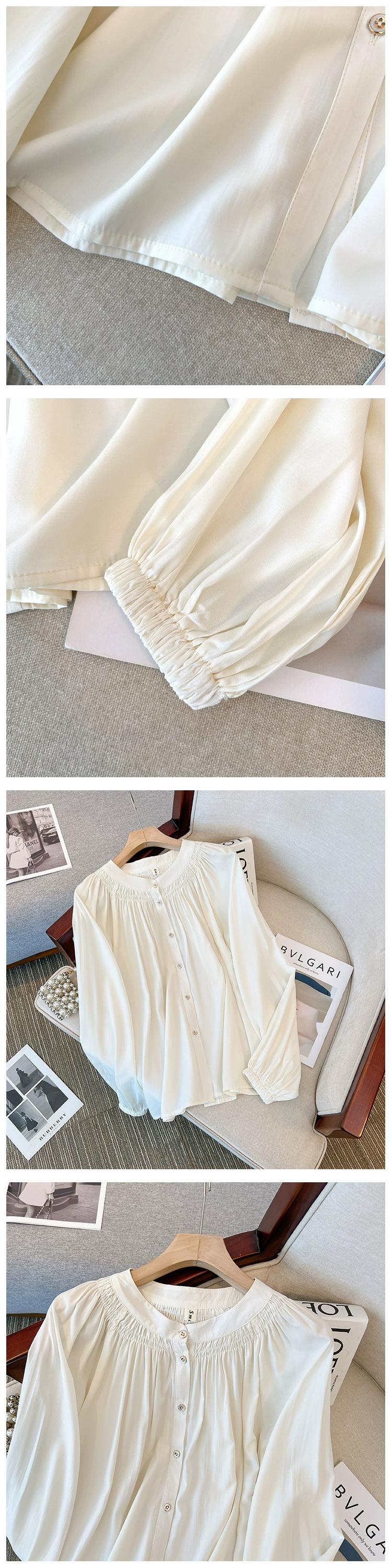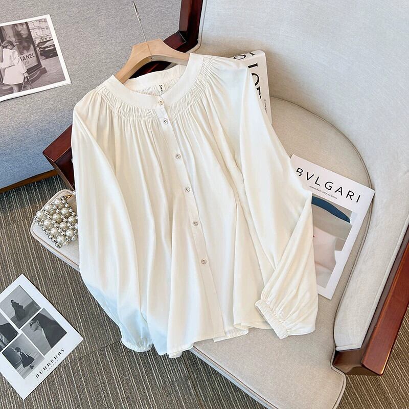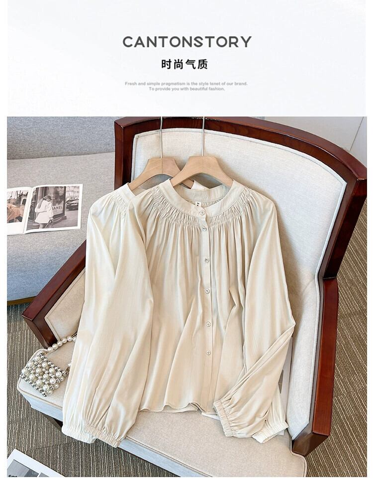 プラスサイズの婦人服 2023 秋の新フランス長袖ルーズスリムシャツラウンドネックパフスリーブシフォントップ ロング 大きめサイズ オータム 秋物 Oネック 8884132271279242