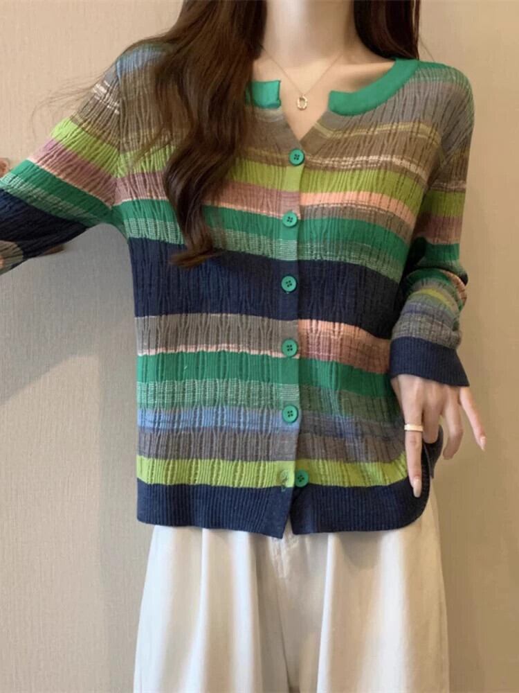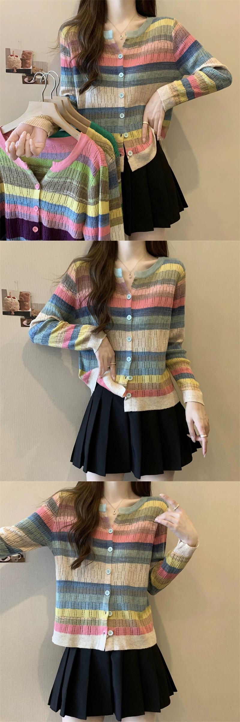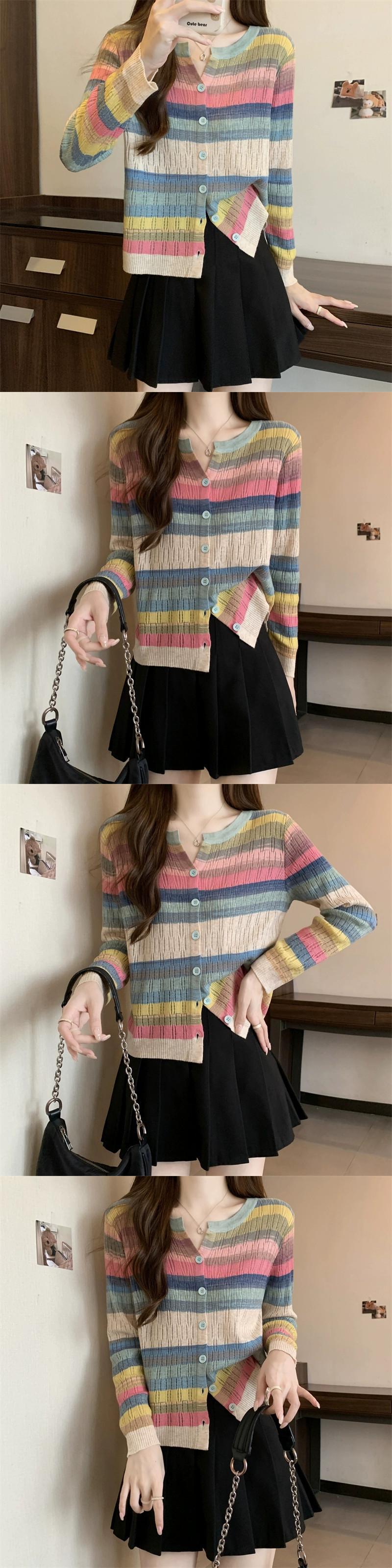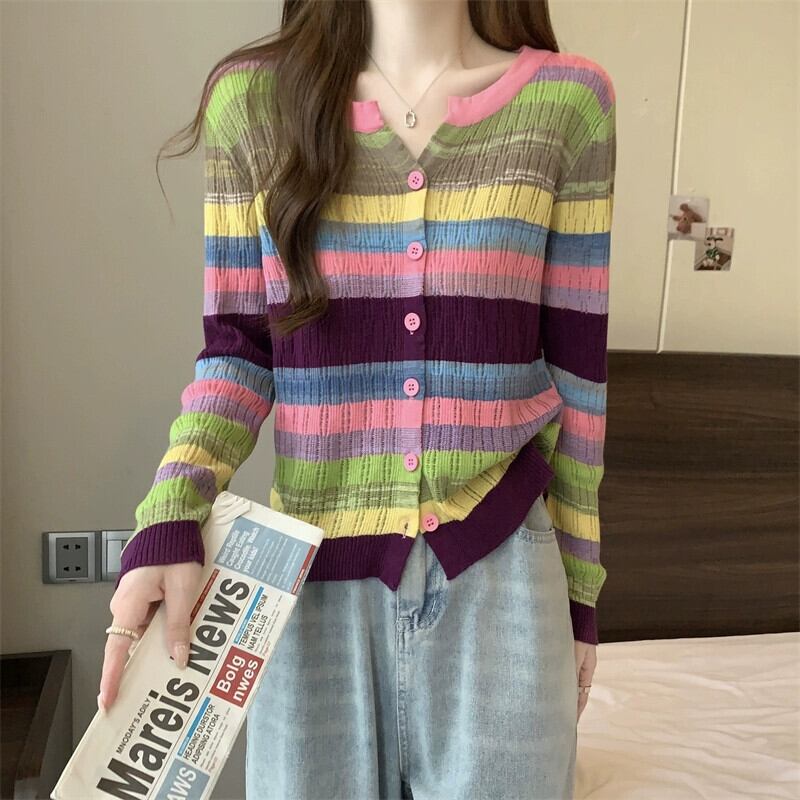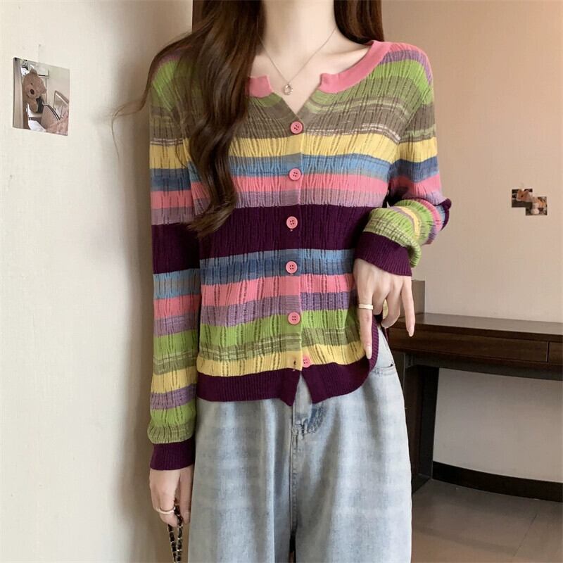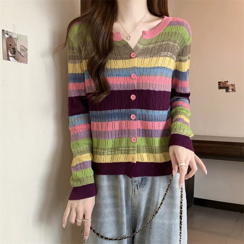 プラスサイズの女性の中空レインボーパッチワークカラーストライプ長袖 Tシャツ秋のニッチデザインスリムニットトップ ロング 大きめサイズ オータム 秋物 8884193235580556