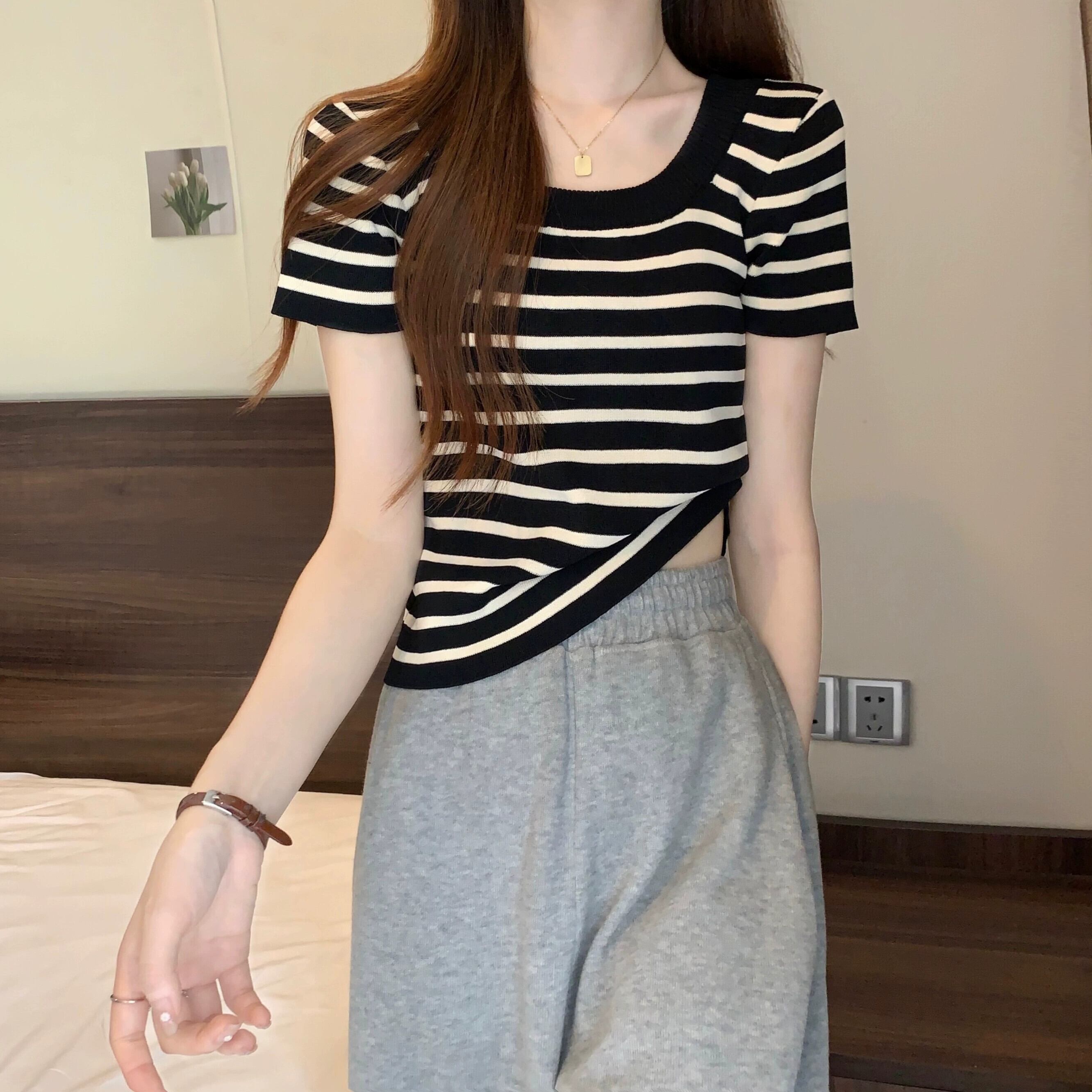 プラスサイズの女性の 2023 夏服ファットシスターストライプスタイル年齢軽減右肩ニット Tシャツフレンチベリーカバートップ 大きめサイズ サマー 夏物 8884133336940431
