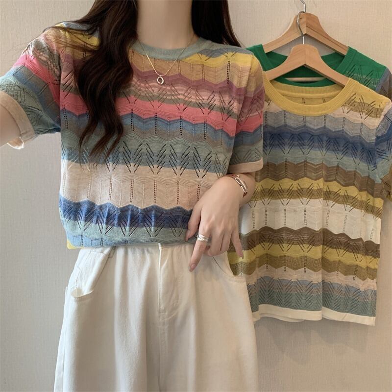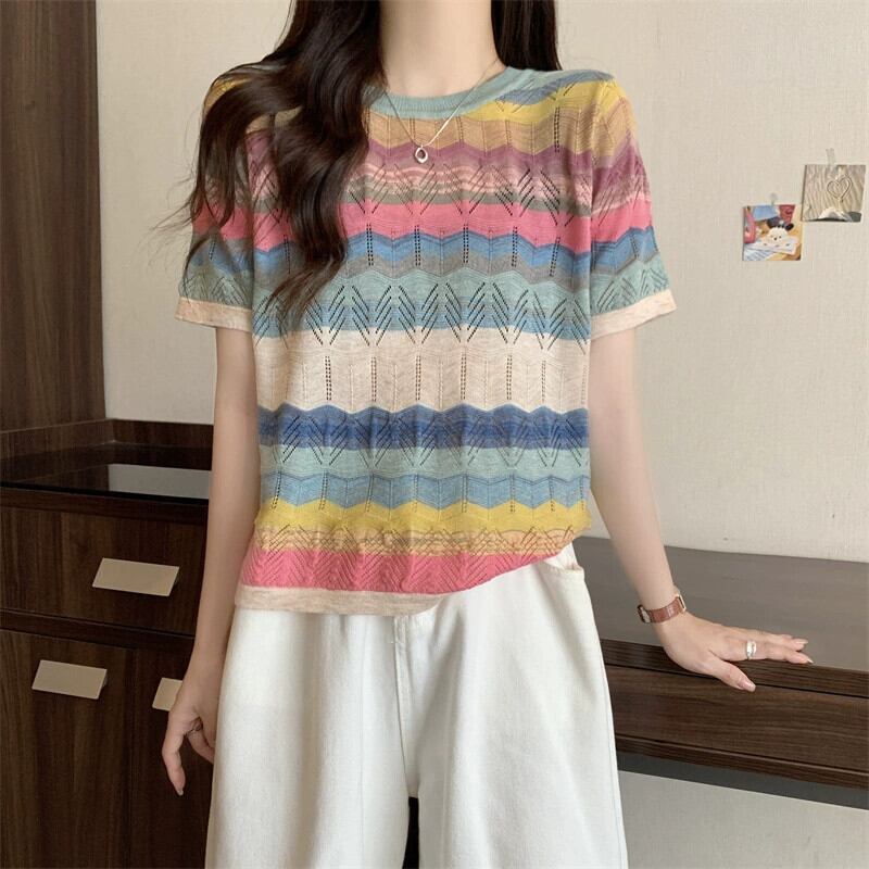 プラスサイズの女性の 2023 流行の夏の新しいファットシスター中空アイスシルクニットトップカラフルなストライプ半袖 T シャツ 大きめサイズ サマー 夏物 Tシャツ 8884147743817489