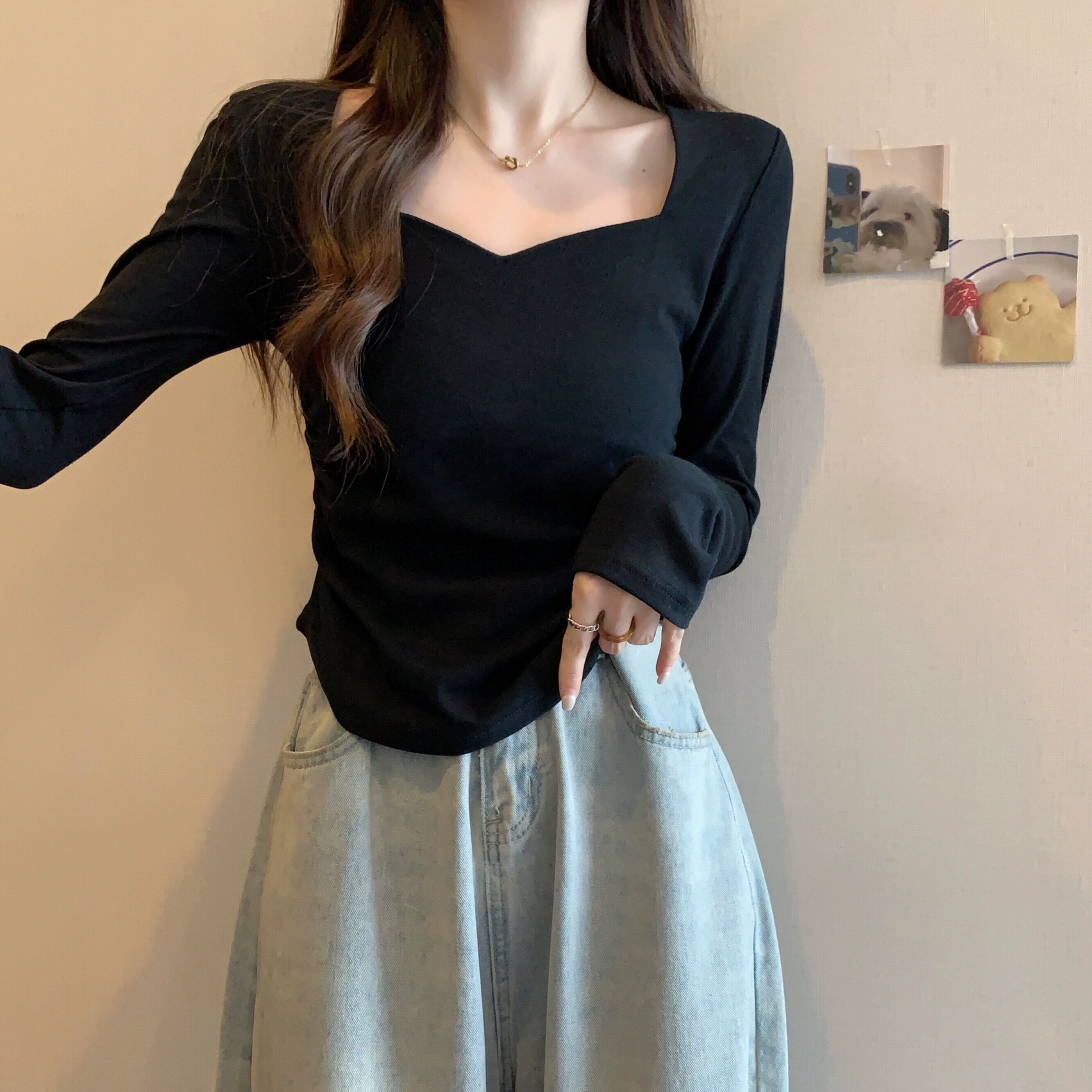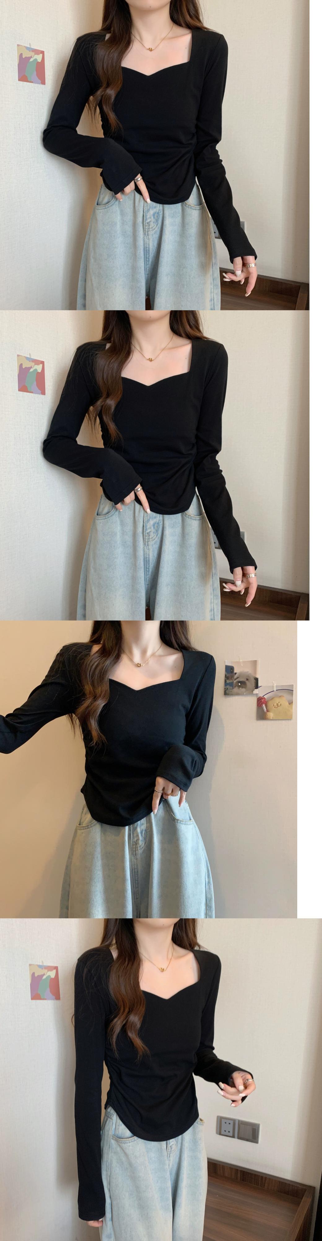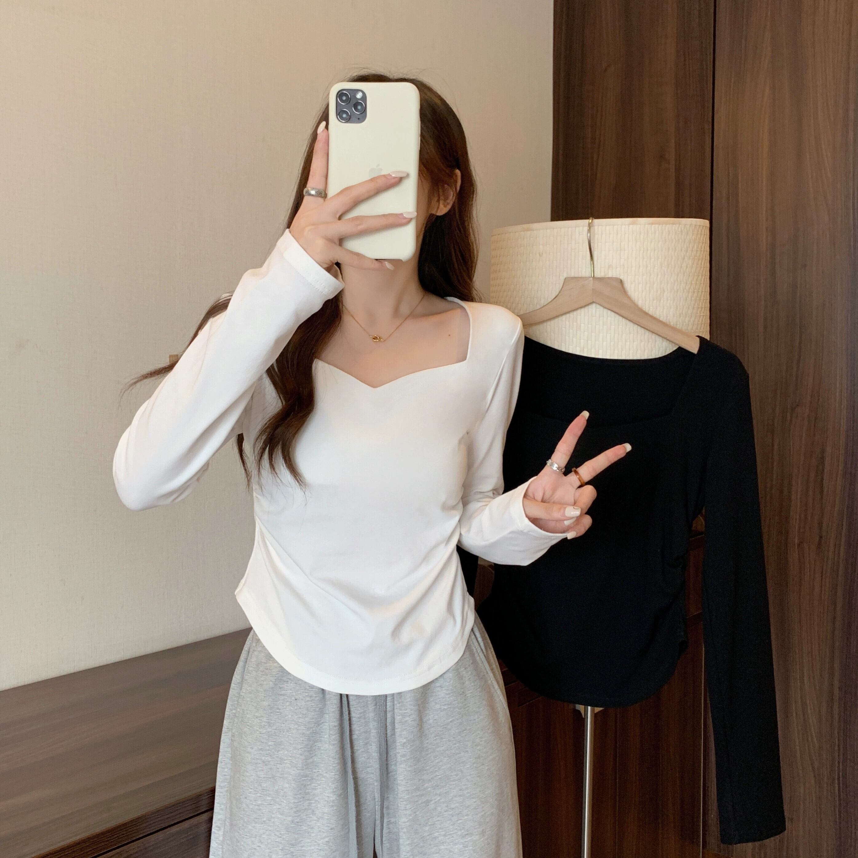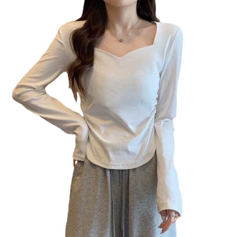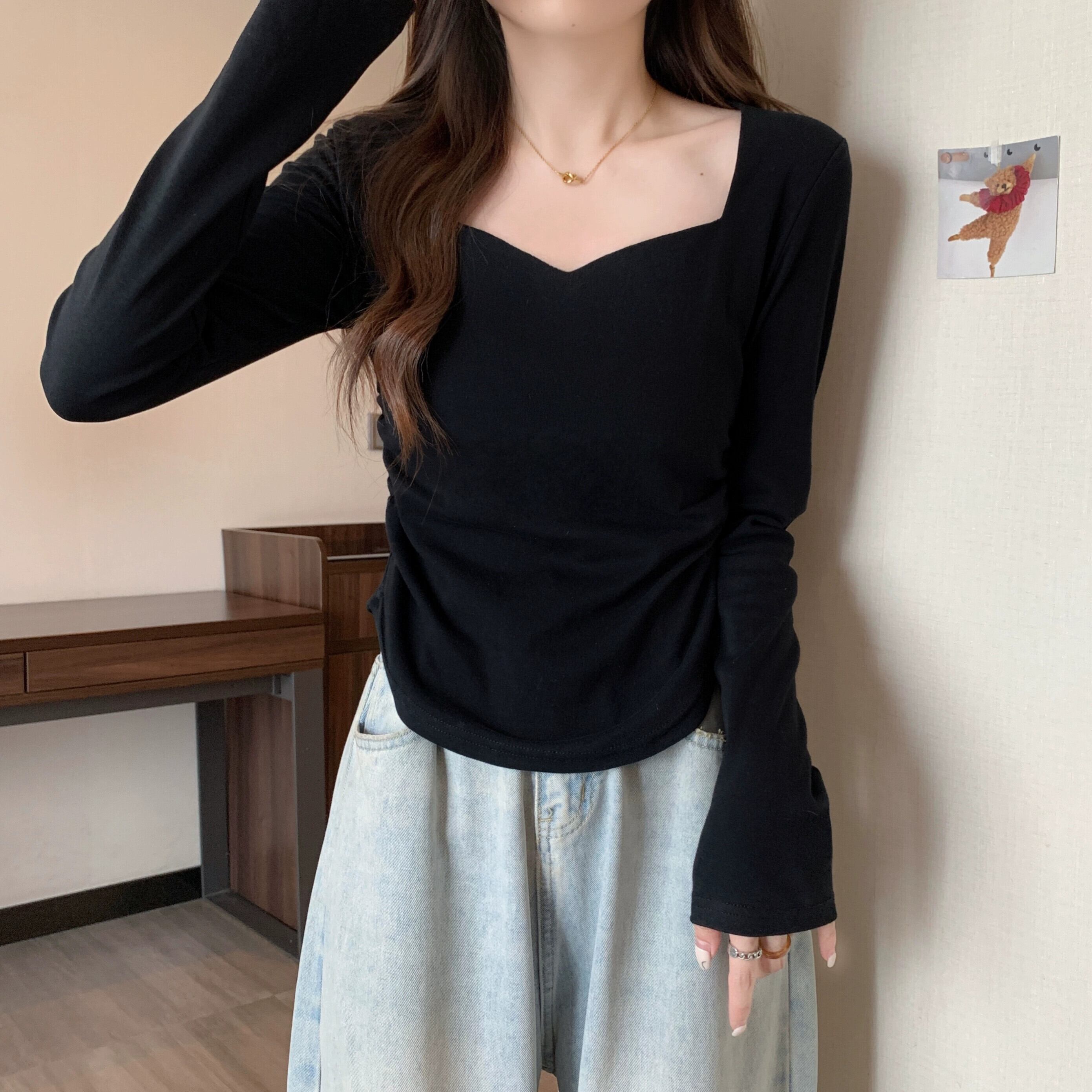 プラスサイズの婦人服 2023 秋服脂肪気質プリーツスリム長袖 Tシャツスクエアネックニッチ腹カバートップ ロング 大きめサイズ オータム 秋物 スクウェア 8884185042848440