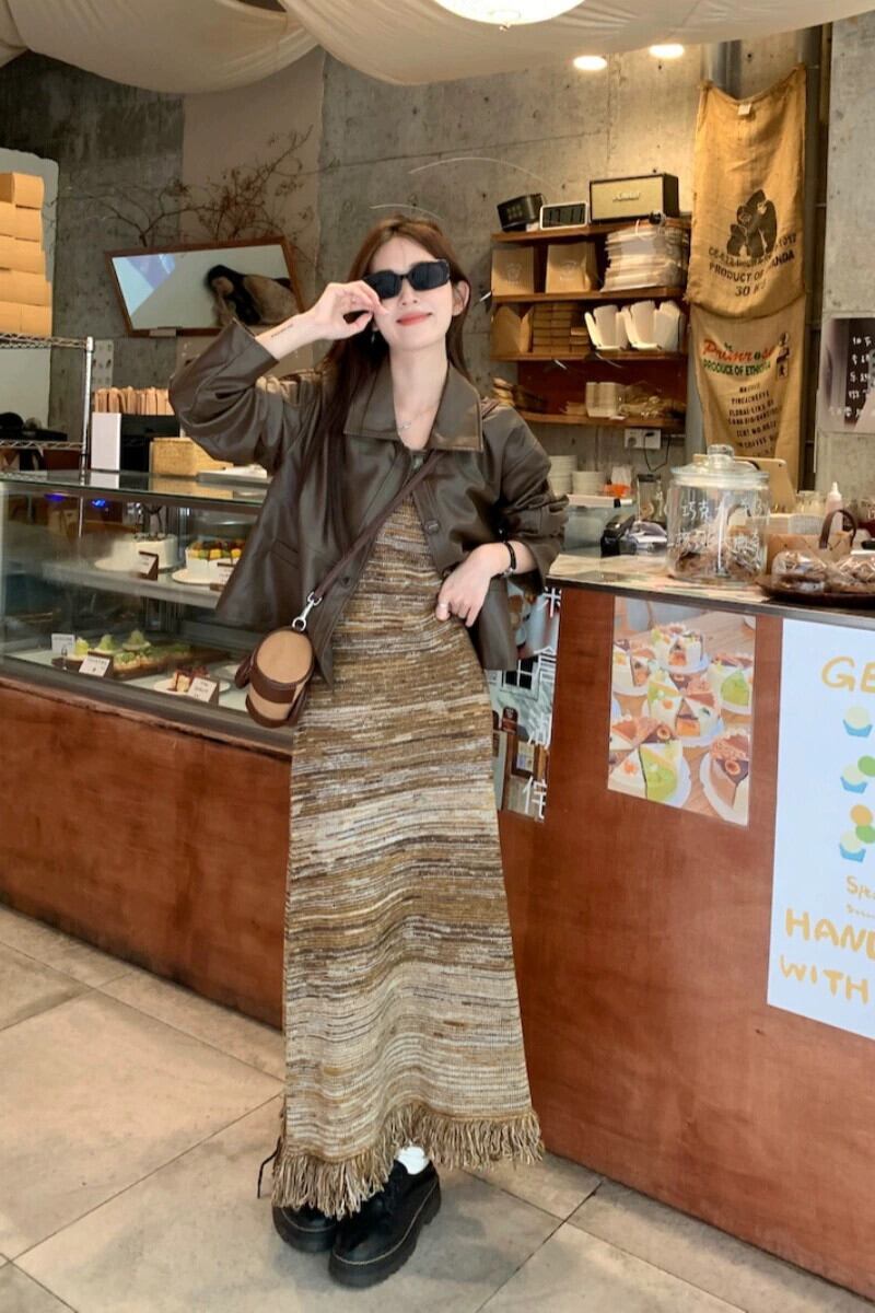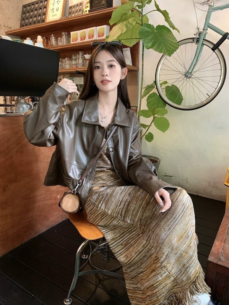 プラスサイズの秋の脂肪 mm レトロレザースーツの女性のジャケットテルニットドレスとサスペンダースカート 2 点セット 大きめサイズ オータム 秋物 8884171754297263