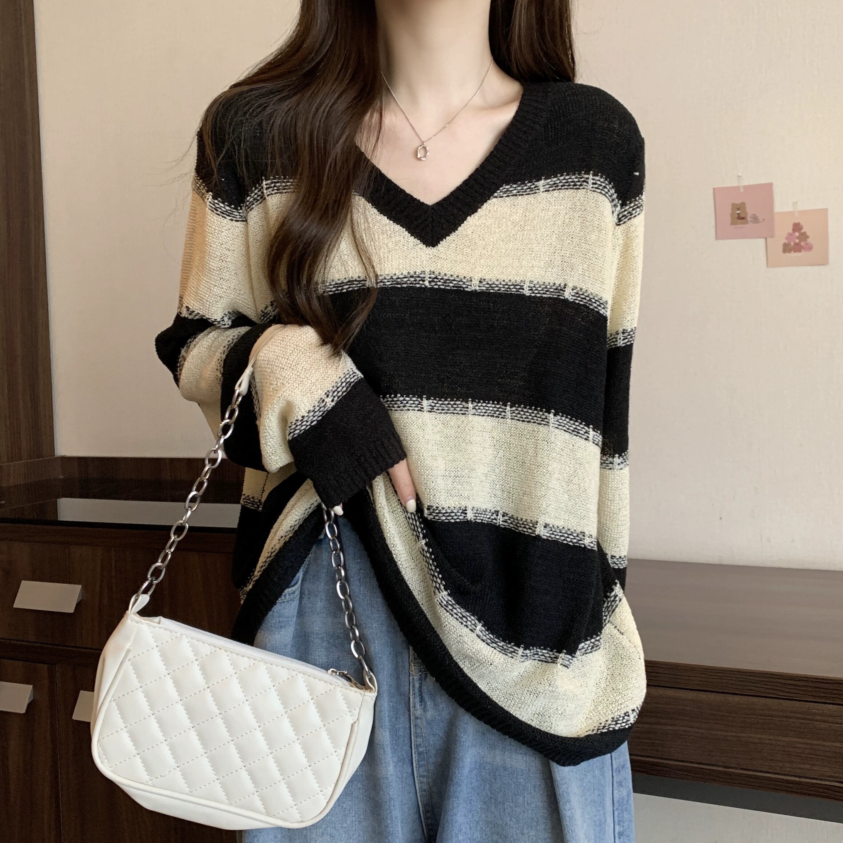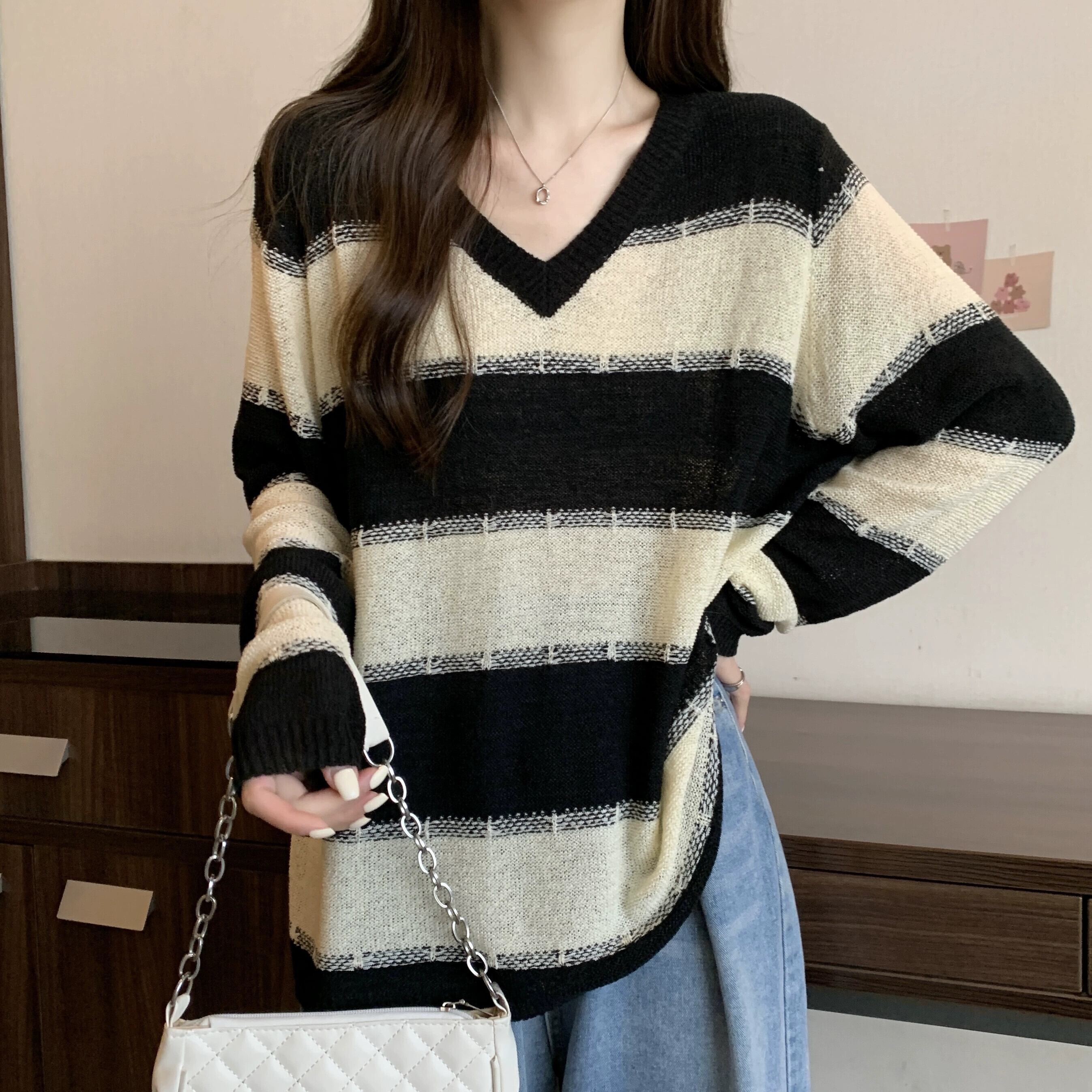 プラスサイズの婦人服 2023 トレンディな秋の新ファットシスターストライプルーズセーターニッチ V ネックオールマッチ長袖トップ ロング 大きめサイズ オータム 秋物 Vネック 8884197649732277