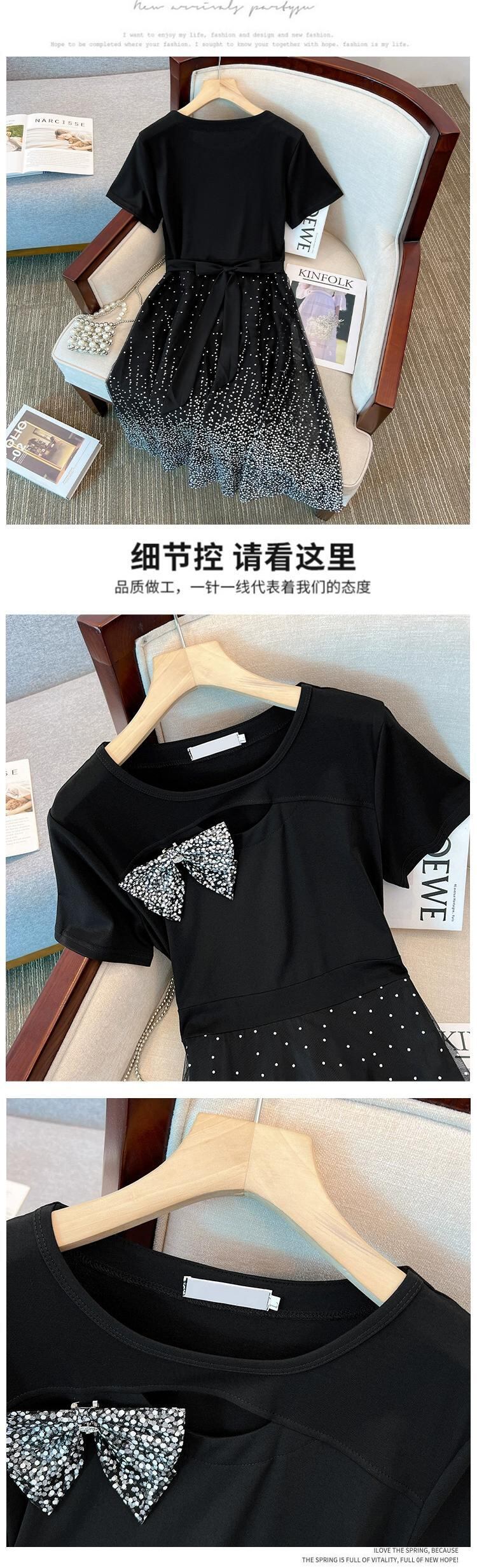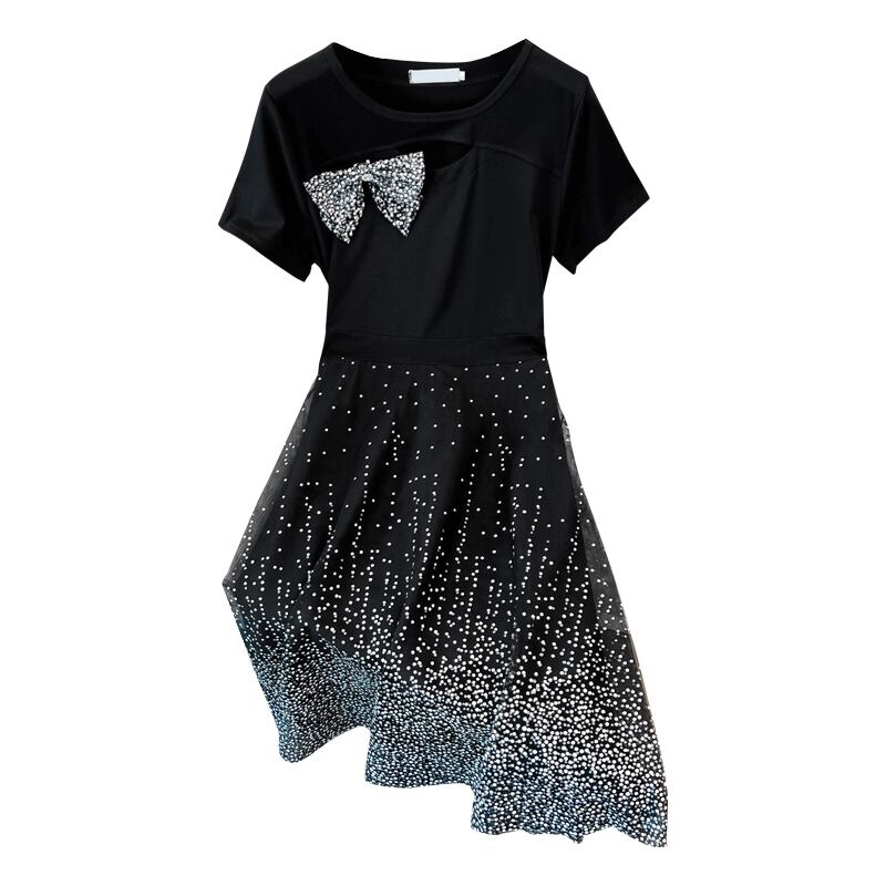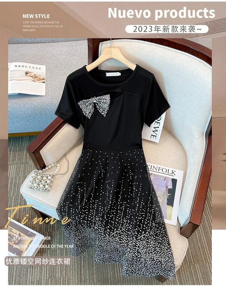 プラスサイズの女性の 2023 ファットシスター夏服気質 A ラインスカートフレンチメッシュスプライシングリボンドレス 大きめサイズ サマー 夏物 Aライン 888411318279520