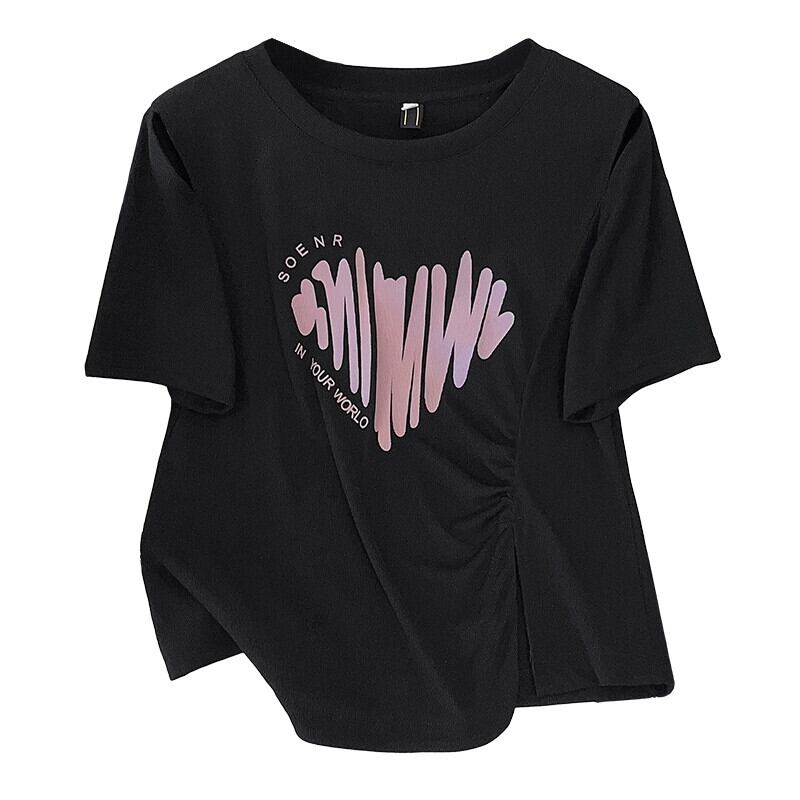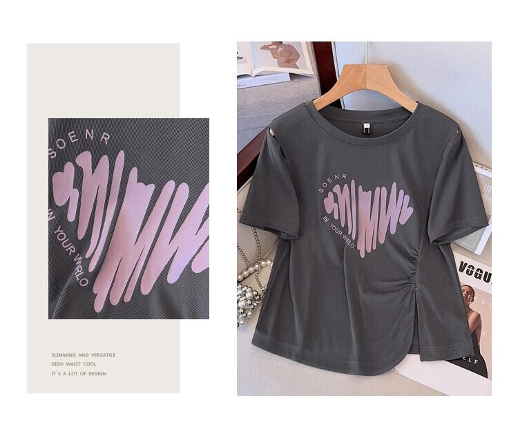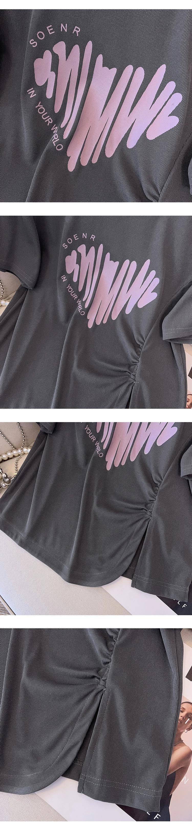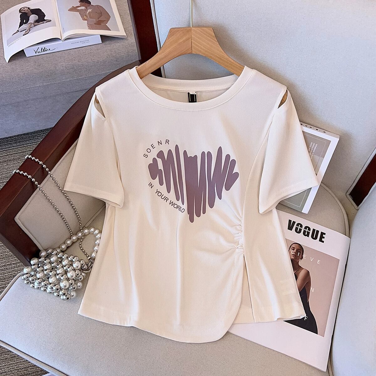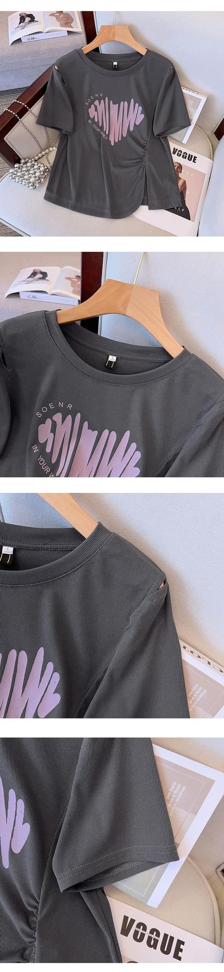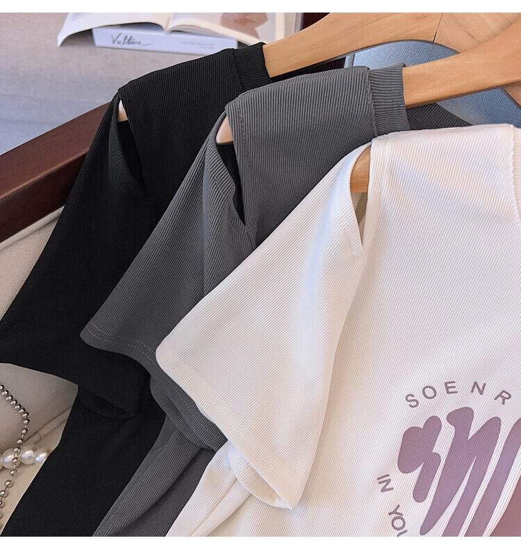 プラスサイズの婦人服 2023 ファットシスター夏服新デザイン痩身レタープリントオフショルダープリーツ Tシャツトップ 大きめサイズ サマー 夏物 8884143210928908