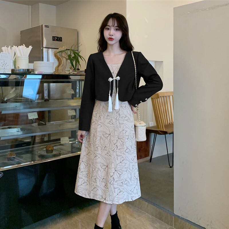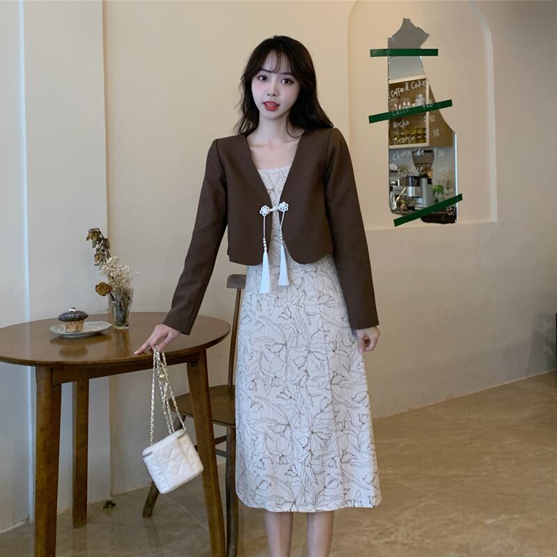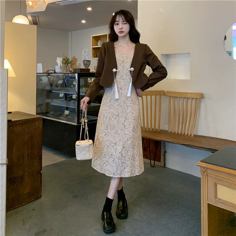 プラスサイズの婦人服 2023 ファットシスター秋の新フレンチレトロナショナルスタイルサスペンダースカートボタンスーツジャケット 2 点セット 大きめサイズ オータム 秋物 8884134478393029