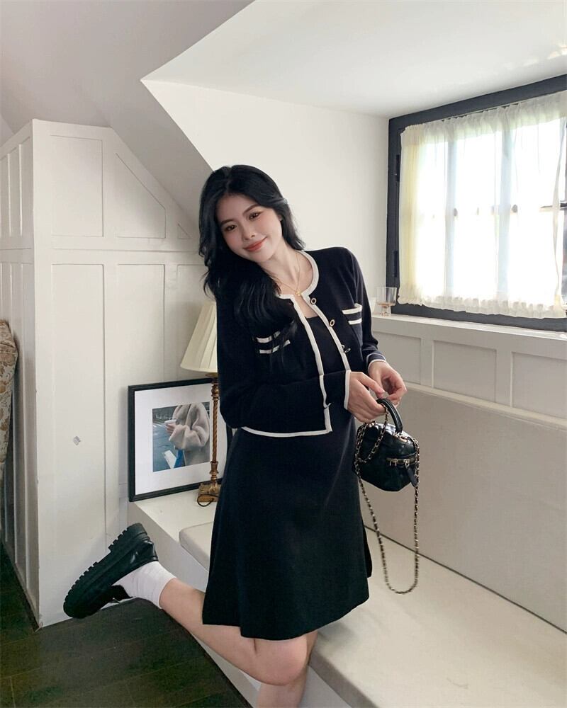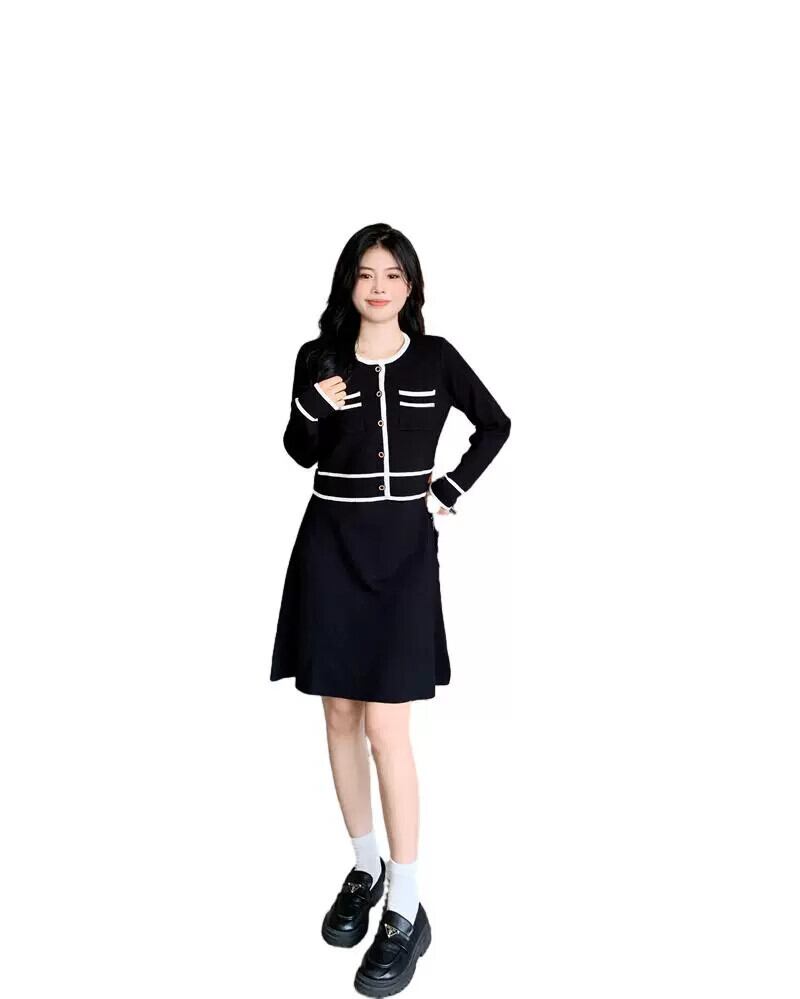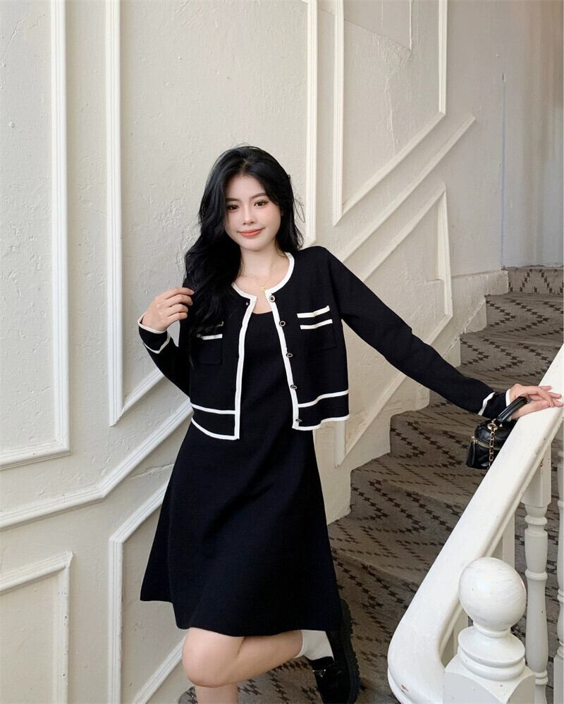 プラスサイズの婦人服 2023 ファットシスター秋の新ファッションスーツ A ラインドレス対照的なカラーカーディガントップ 2 点セット 大きめサイズ オータム 秋物 Aライン 8884128403973891