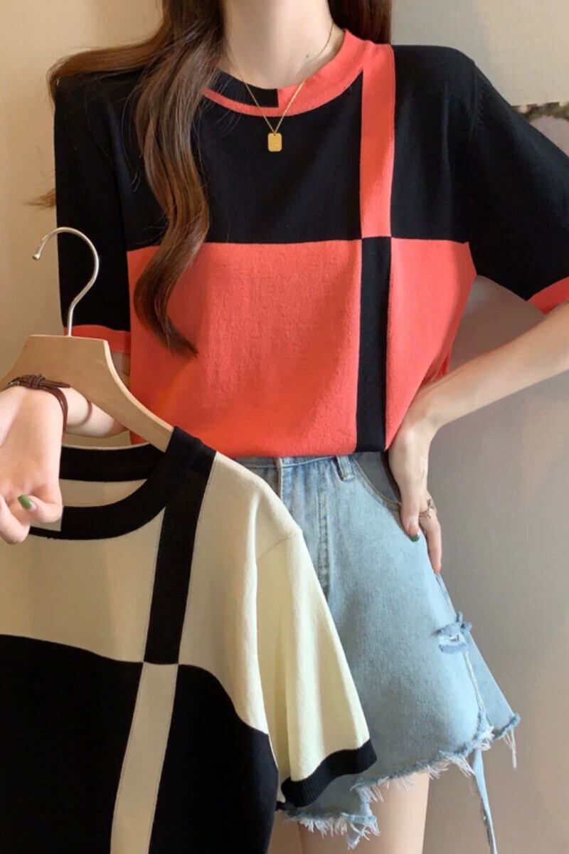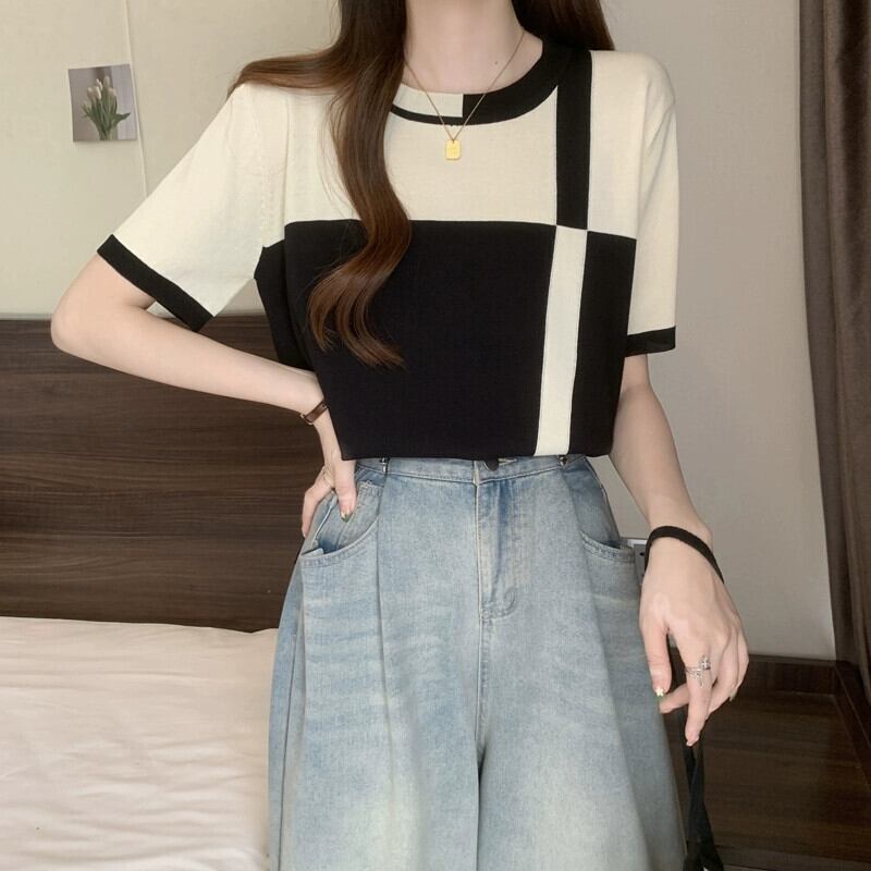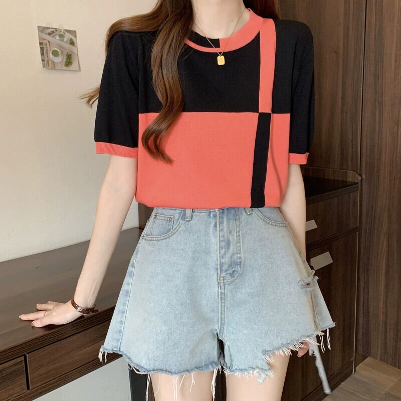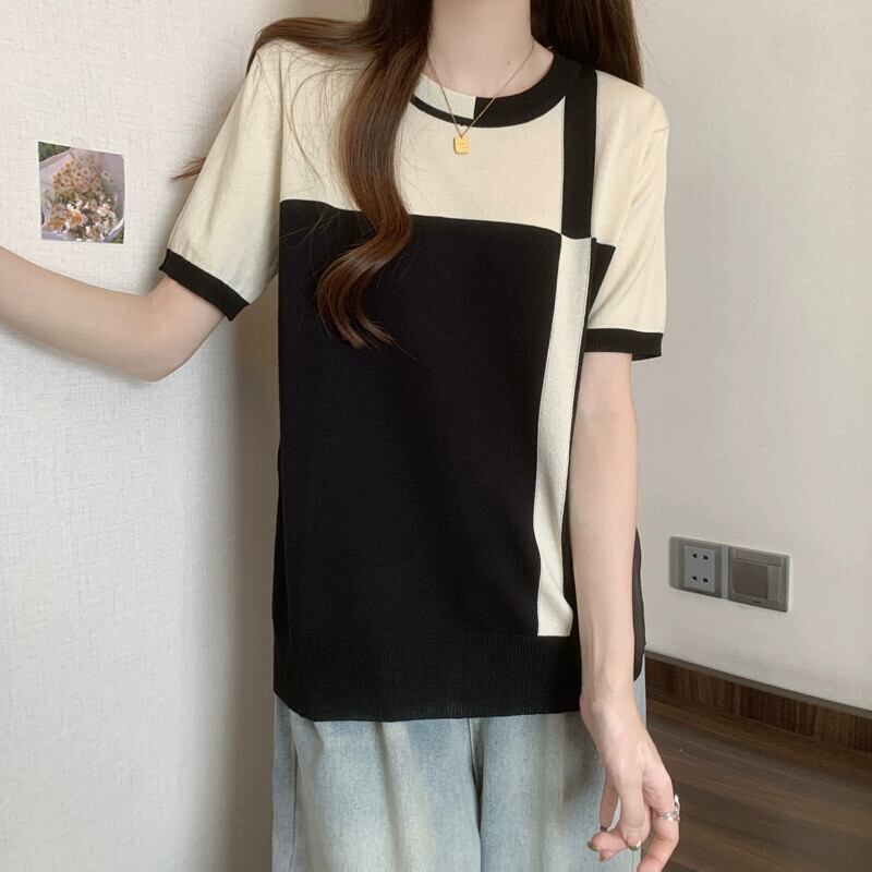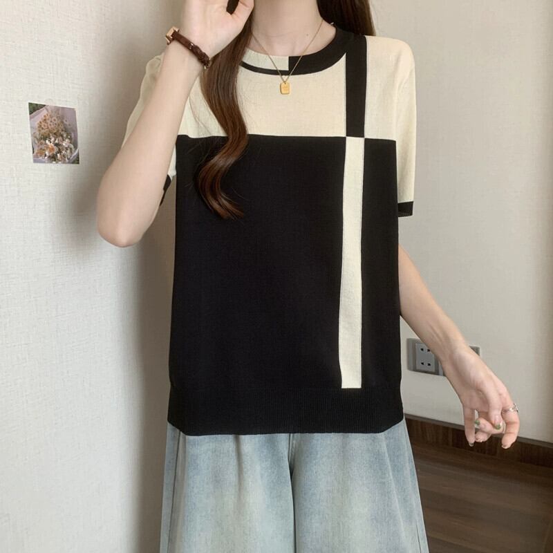 プラスサイズの女性の 2023 夏服ファットラウンドネックシックなデザイン T シャツカラーマッチングニッチルーズ肌カバートップス 大きめサイズ サマー 夏物 Oネック Tシャツ 8884140354957041
